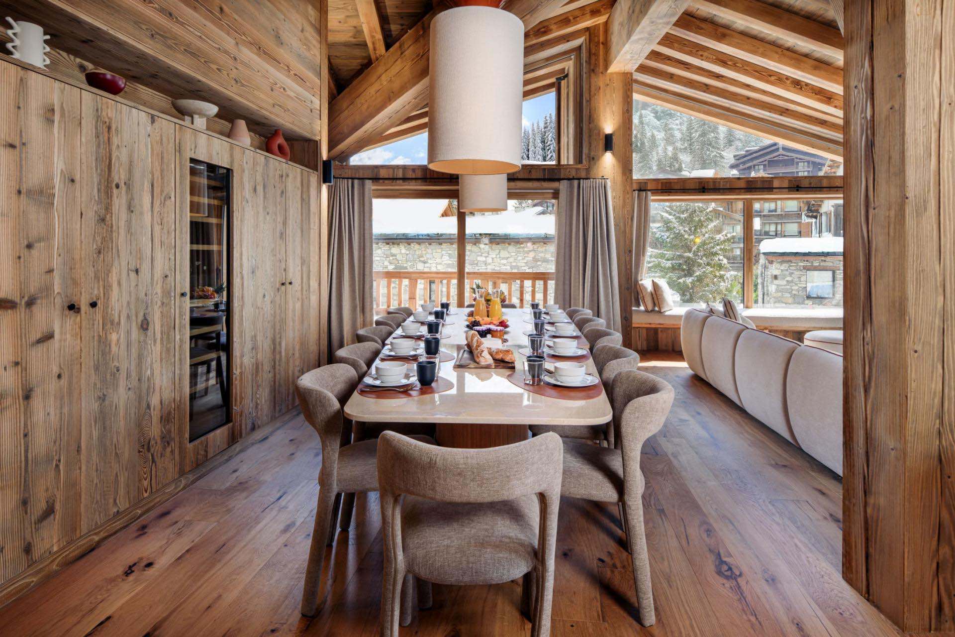 At the heart of the chalet is a spacious open-plan living and dining area with floor-to-ceiling windows, wooden beams, stylish lighting and sun-soaked balconies facing south and east, offering stunning views of the surrounding mountains.