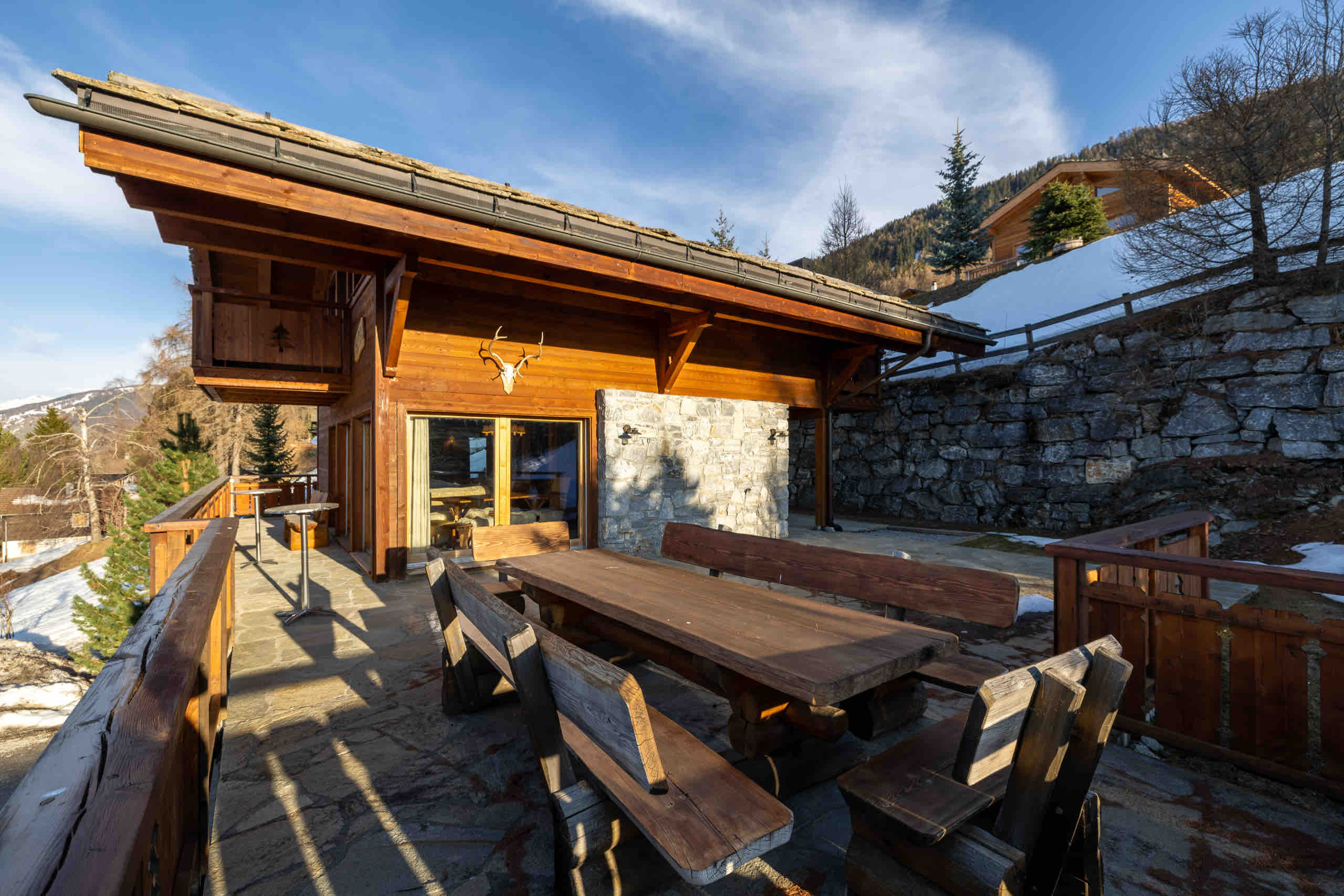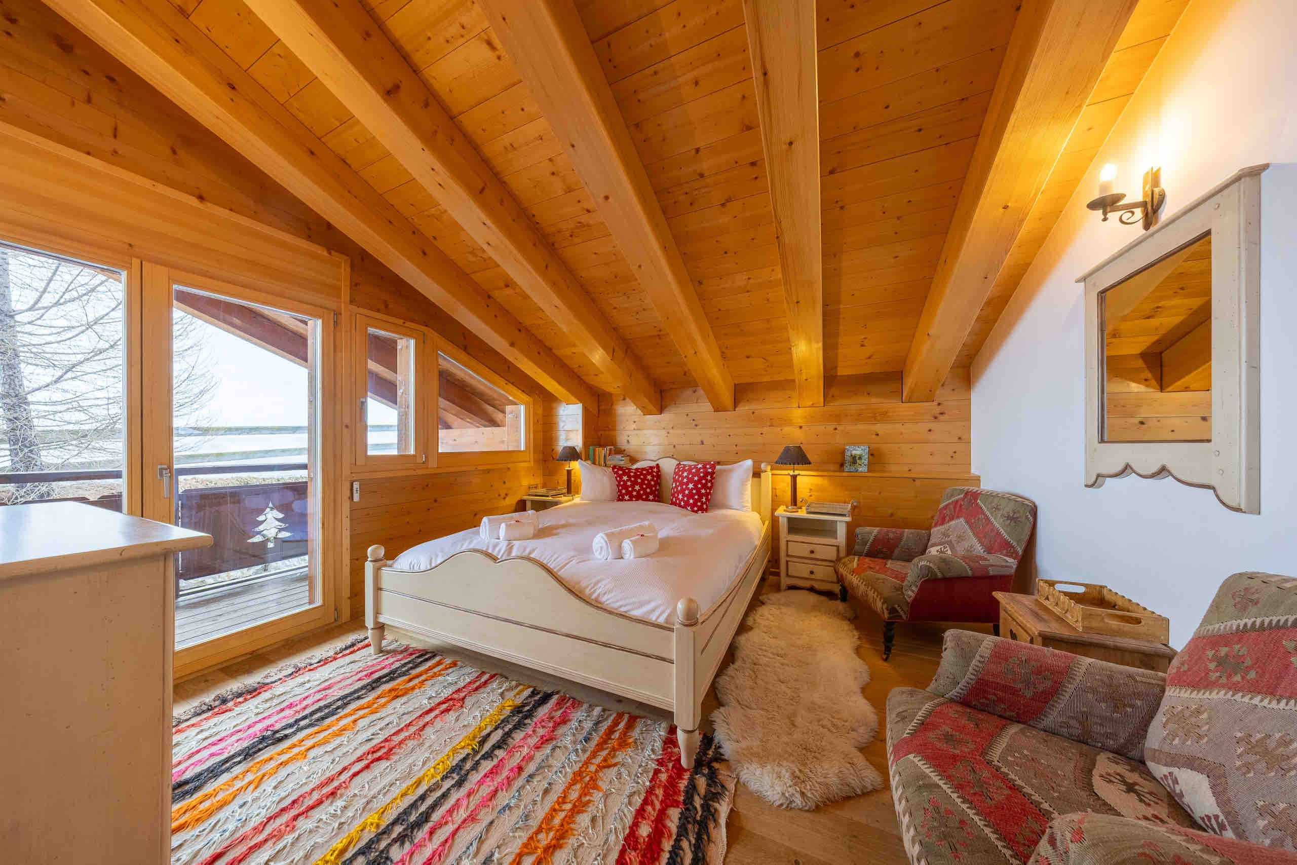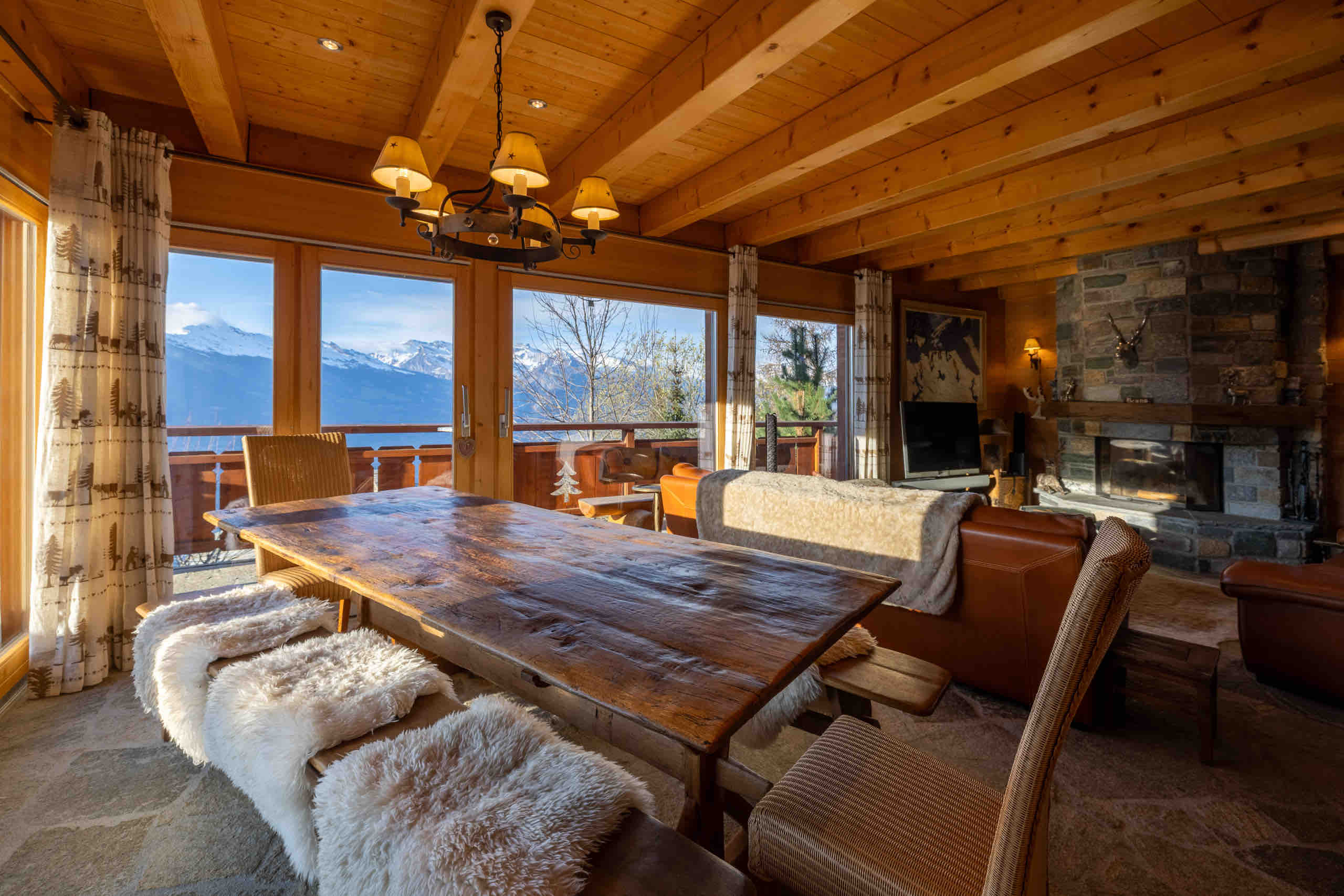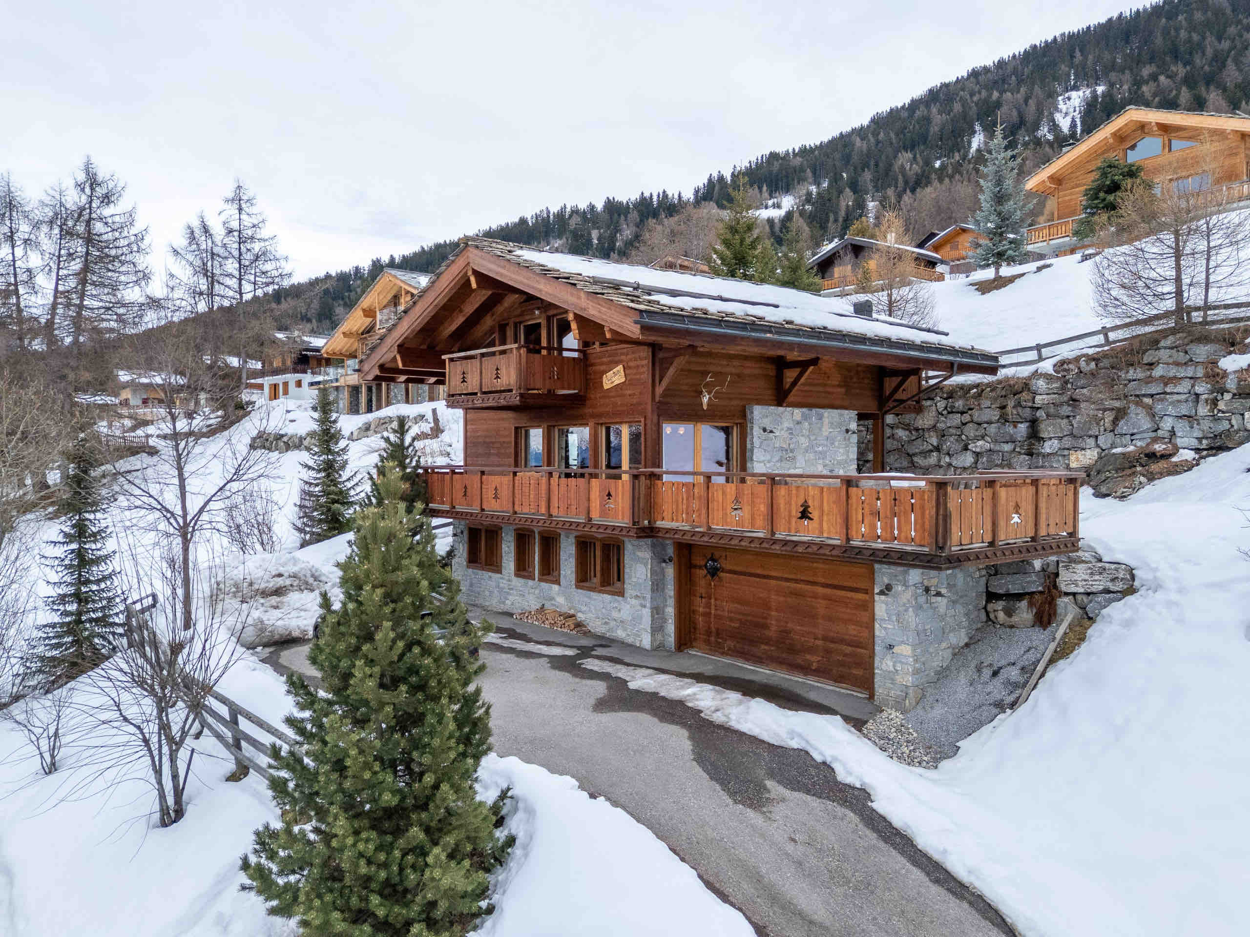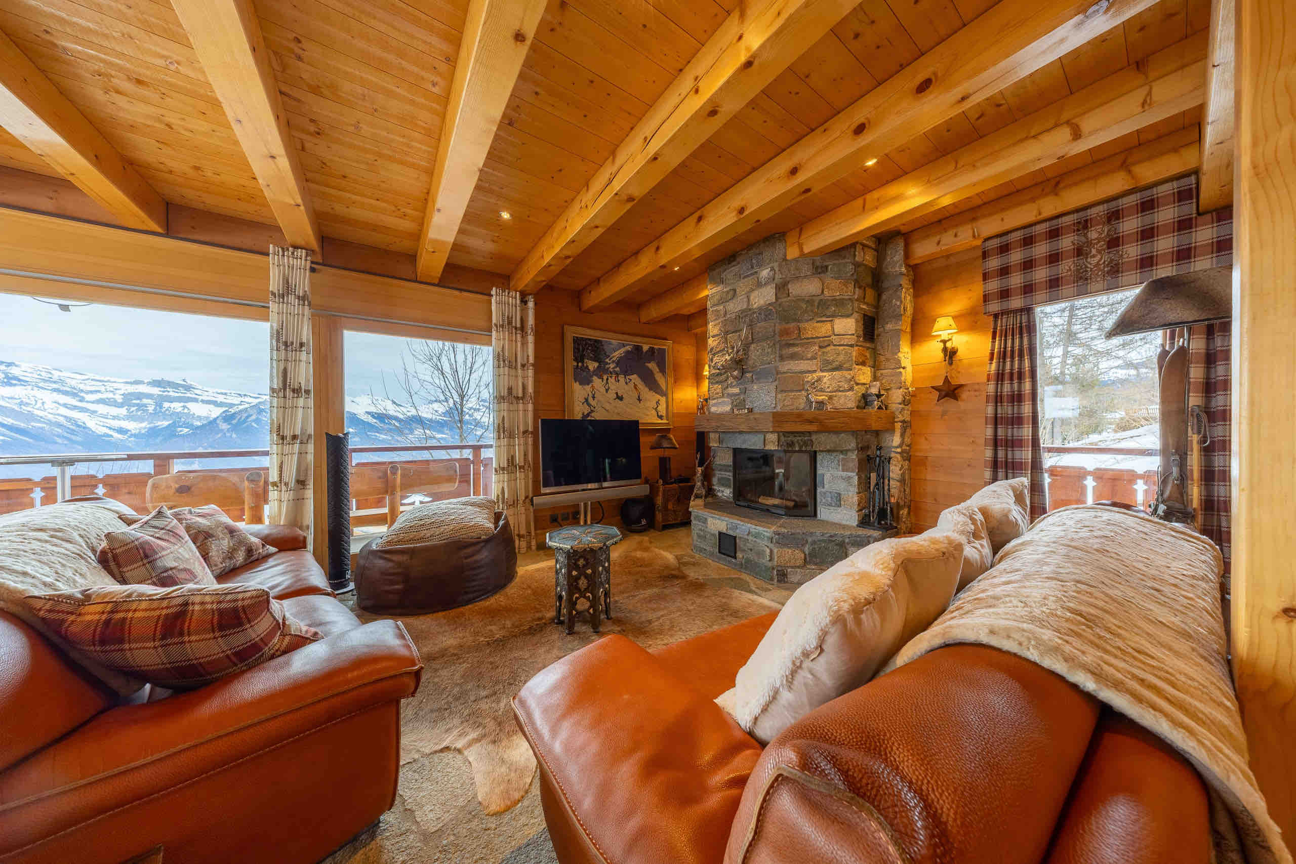 This beautiful three-level chalet welcomes up to 10 guests with its four bedrooms and four bathrooms. After an active day of skiing or hiking, you can relax in the sauna or settle into the cozy living room, where the fireplace frames stunning views of the surrounding mountains. On sunny days, the terrace is the perfect place to gather and enjoy moments of conviviality.