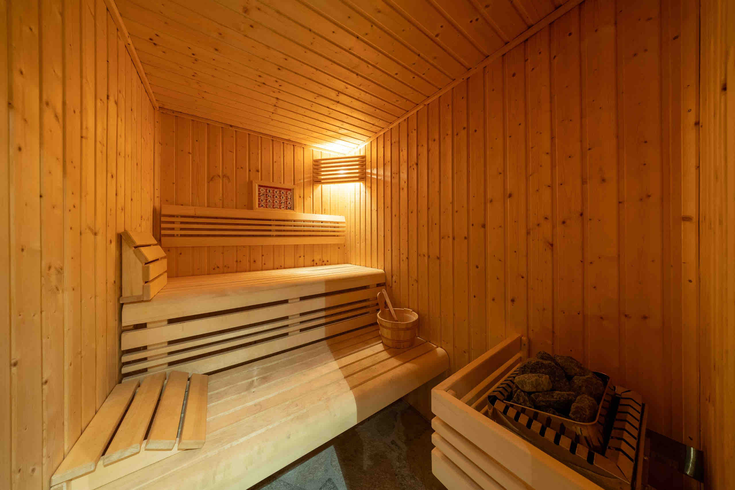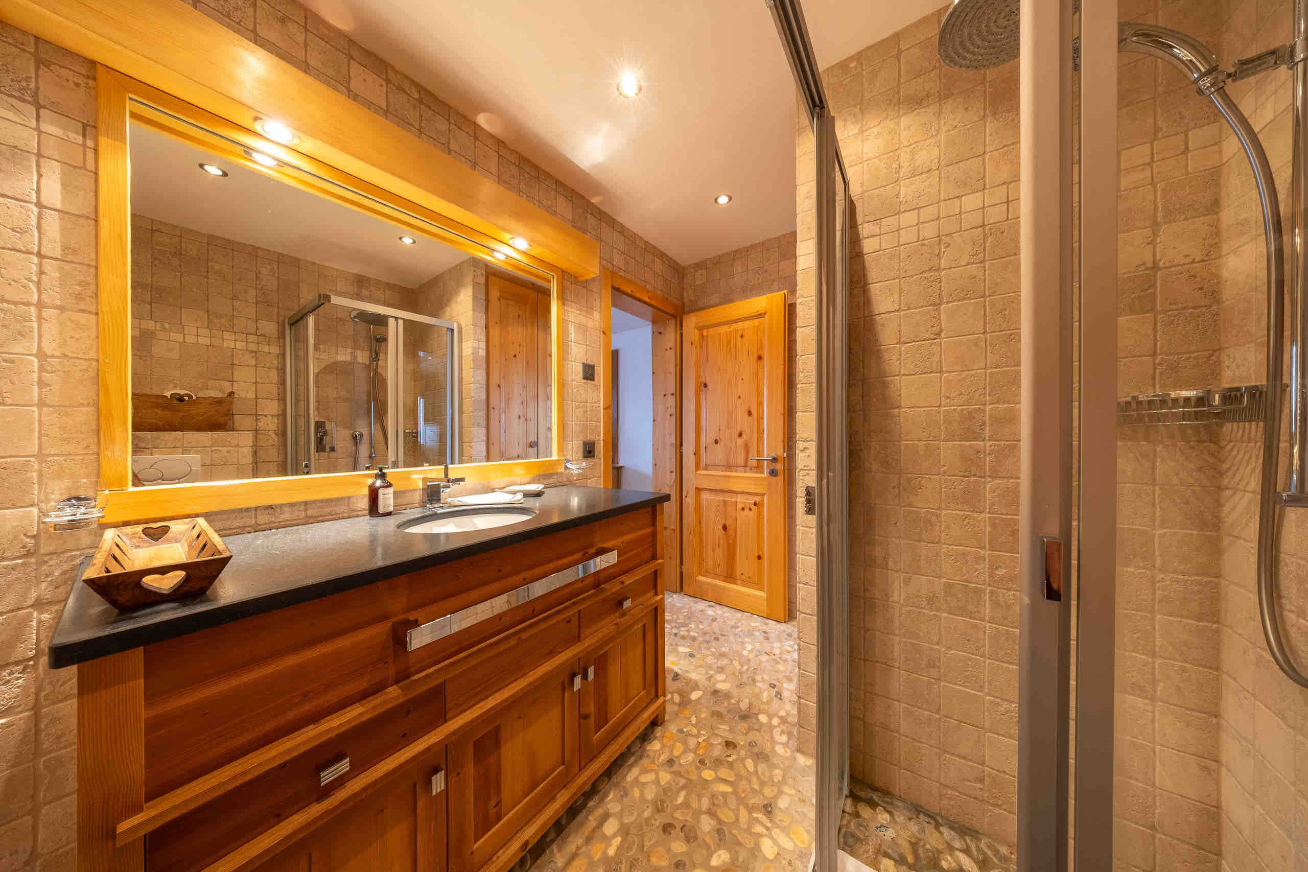 On the ground floor, you will find the garage, a laundry room equipped with a washing machine and dryer, and a spacious entrance hall with plenty of storage for ski equipment. This level also includes a double bedroom with an en-suite bathroom featuring a shower and toilet, a bedroom with bunk beds for four, an additional bathroom with shower and toilet, as well as the sauna with its own shower.