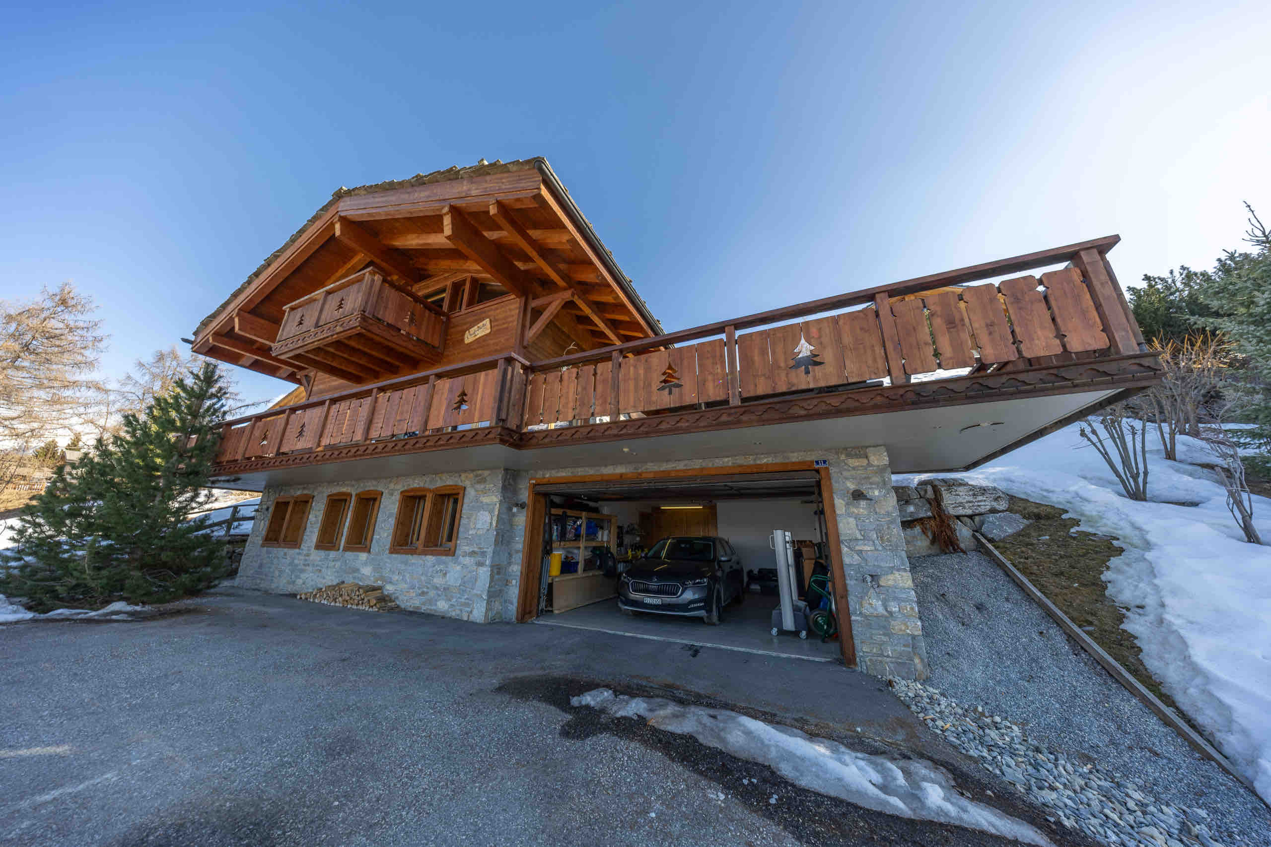 Parking is available with one space in the garage and two to three outdoor spaces in front of the chalet, depending on vehicle size and snow conditions. Please note that winter access often requires snow chains or a four-wheel-drive vehicle, as the road is steep.