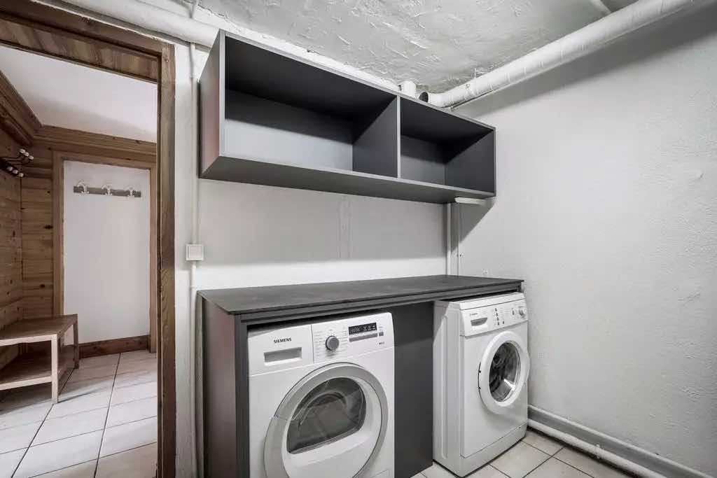 The chalet also features a fully equipped kitchen, multiple bathrooms, a terrace and balconies ideal for soaking in the alpine scenery, as well as practical amenities including private parking, ski storage, and laundry facilities.