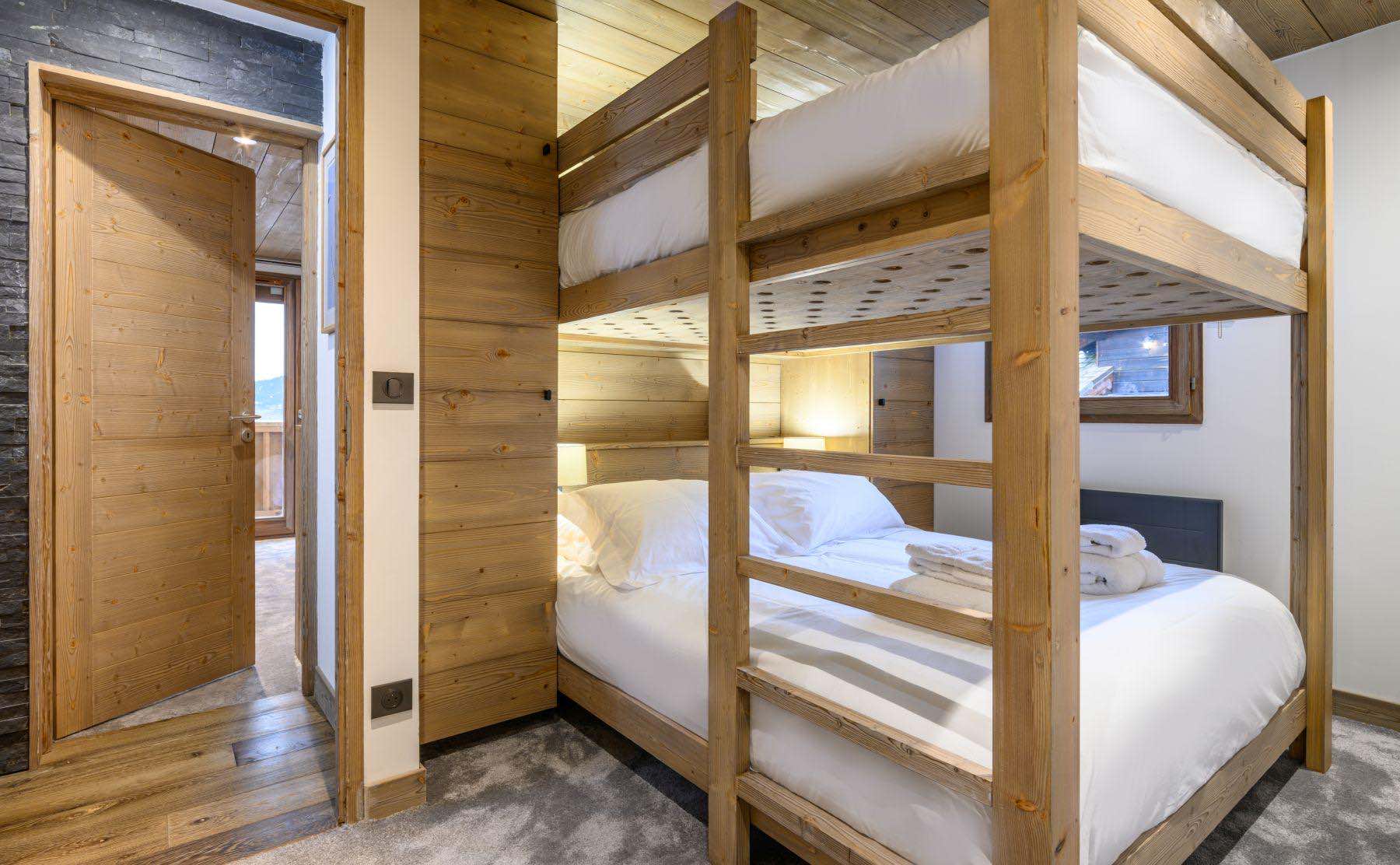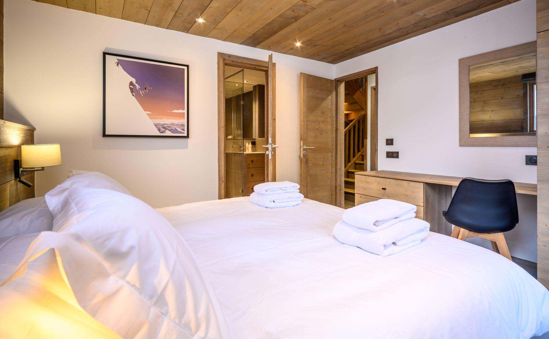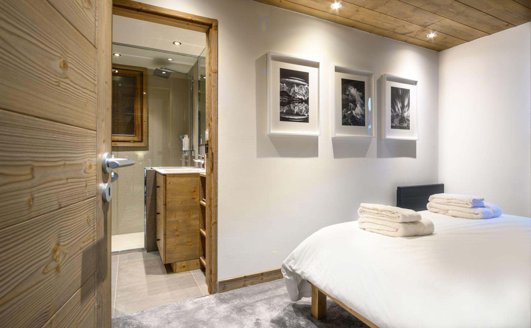 The chalet’s six bedrooms have been thoughtfully arranged to suit a variety of group configurations. Four rooms can be set up as either doubles or twins, alongside one bedroom featuring a double bunk bed and another sleeping three with a bunk bed and single. Each bedroom is tastefully furnished in a simple, welcoming style, complete with soft linens and a restful feel. All rooms benefit from private en-suite bathrooms for added comfort and convenience.