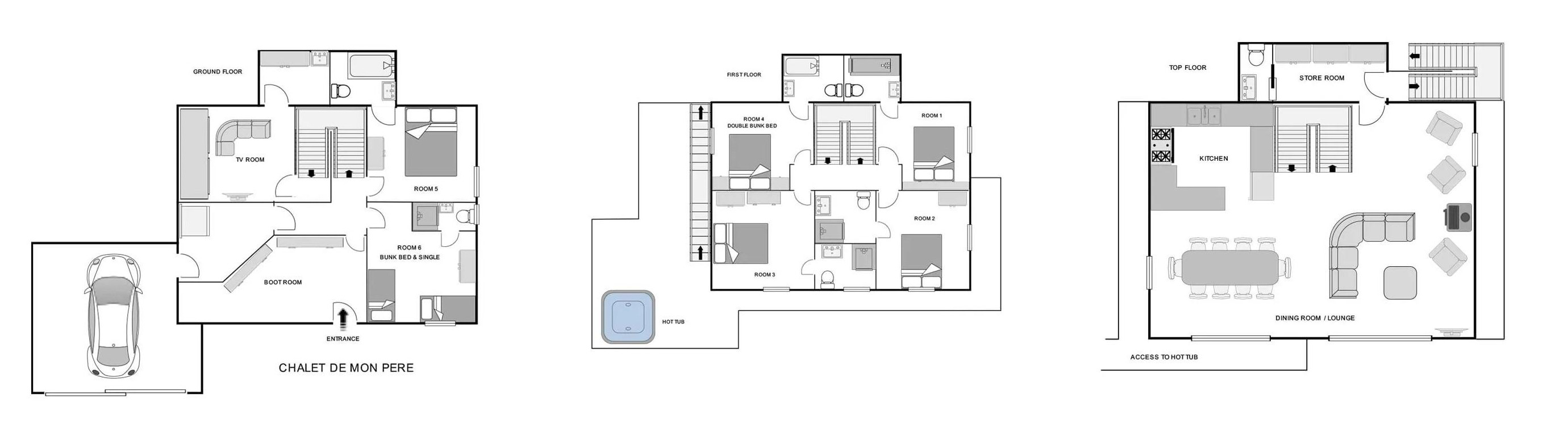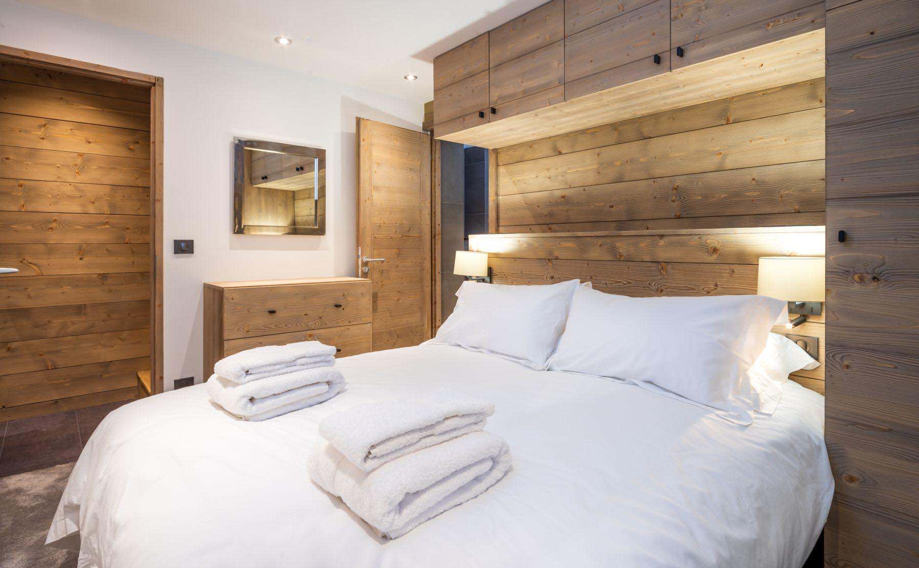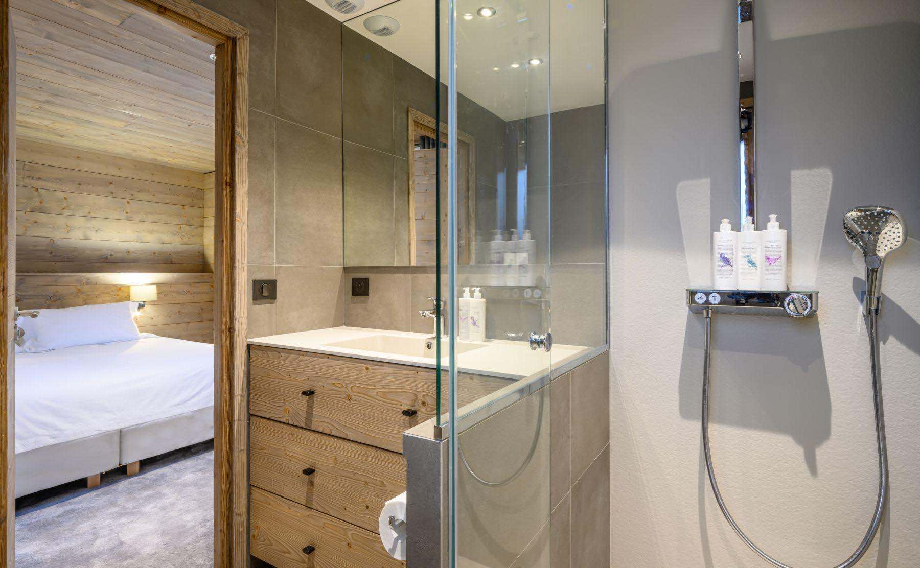 The chalet’s six bedrooms have been thoughtfully arranged to suit a variety of group configurations. Four rooms can be set up as either doubles or twins, alongside one bedroom featuring a double bunk bed and another sleeping three with a bunk bed and single. Each bedroom is tastefully furnished in a simple, welcoming style, complete with soft linens and a restful feel. All rooms benefit from private en-suite bathrooms for added comfort and convenience.