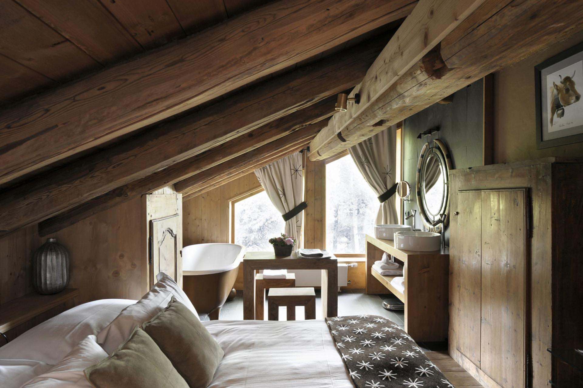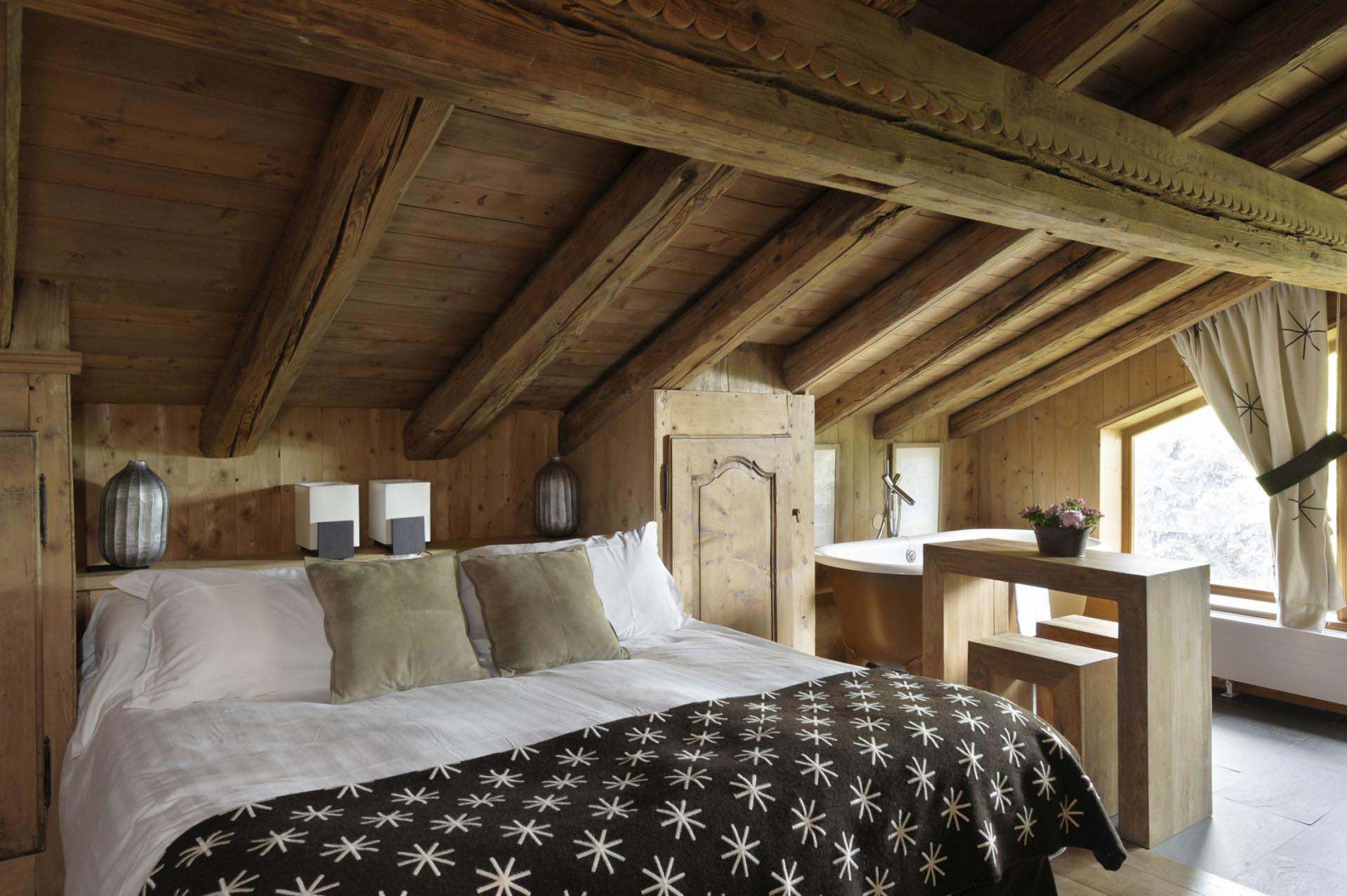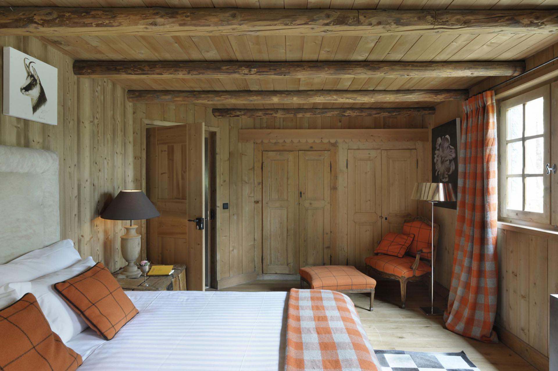 The master suite occupies an entire floor, featuring an open-plan bathroom, a grand walk-in wardrobe, and breathtaking views of the Jaillet mountain range. On the ground floor, another serene bedroom with sloping ceilings and a contemporary design shares the same panorama. Three additional bedrooms, each decorated in warm blue, red, and orange hues, are designed for ultimate comfort and coziness.