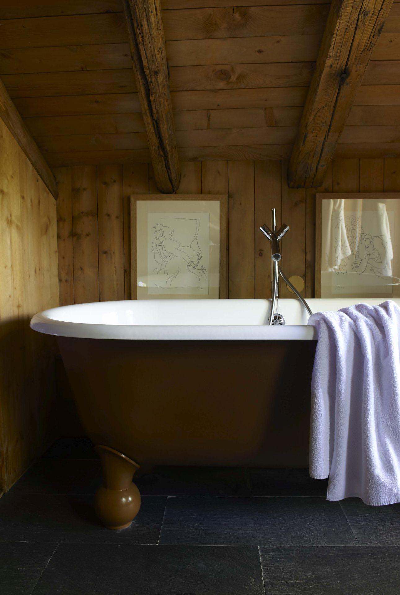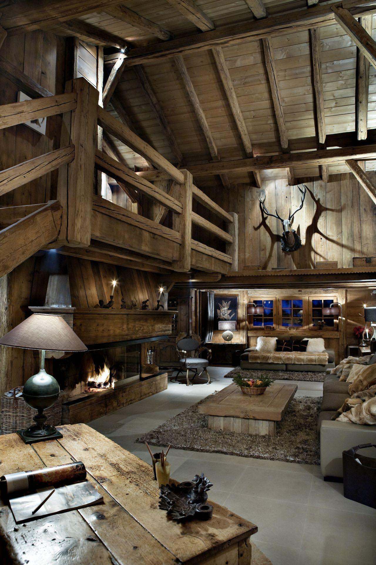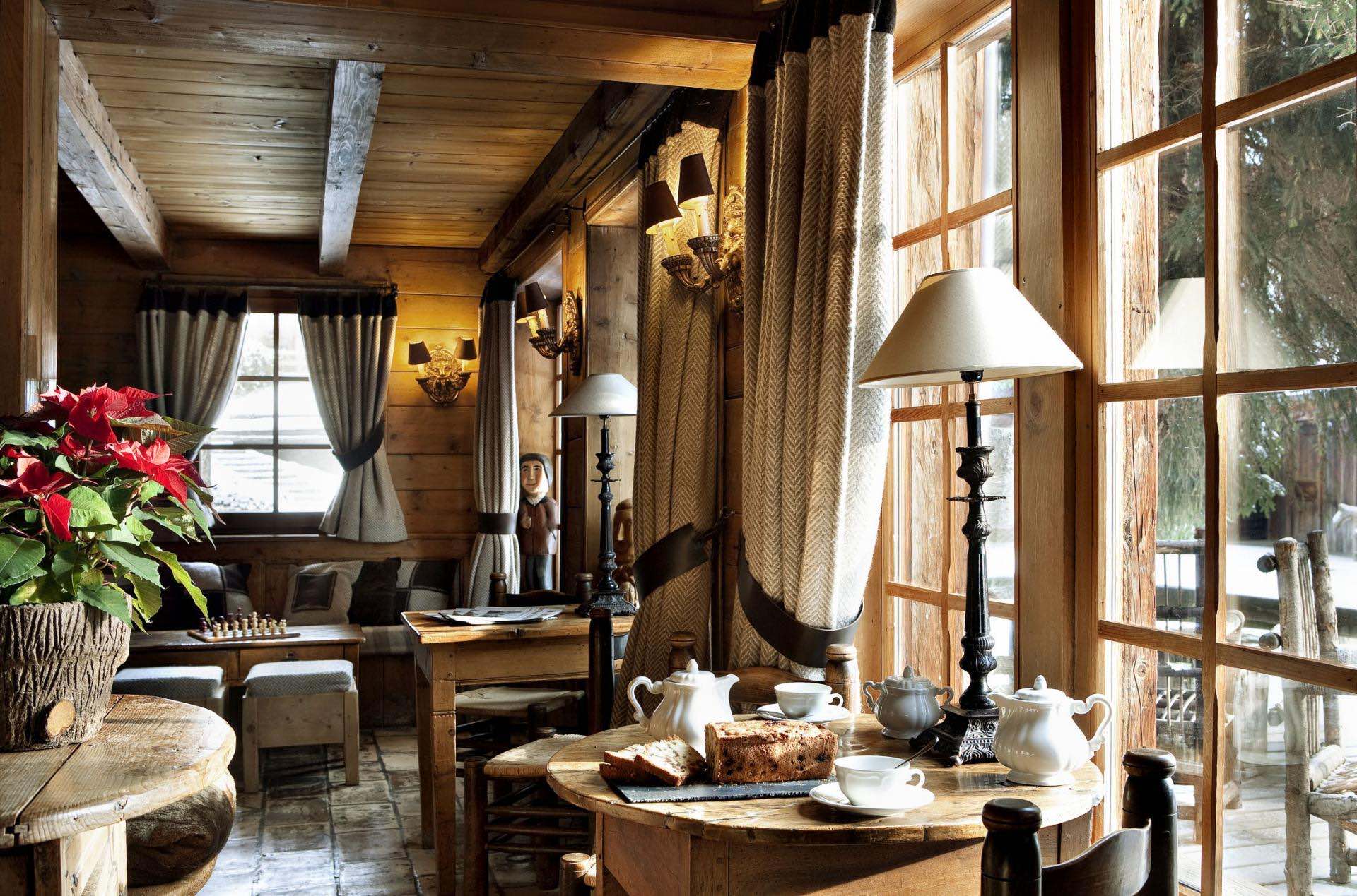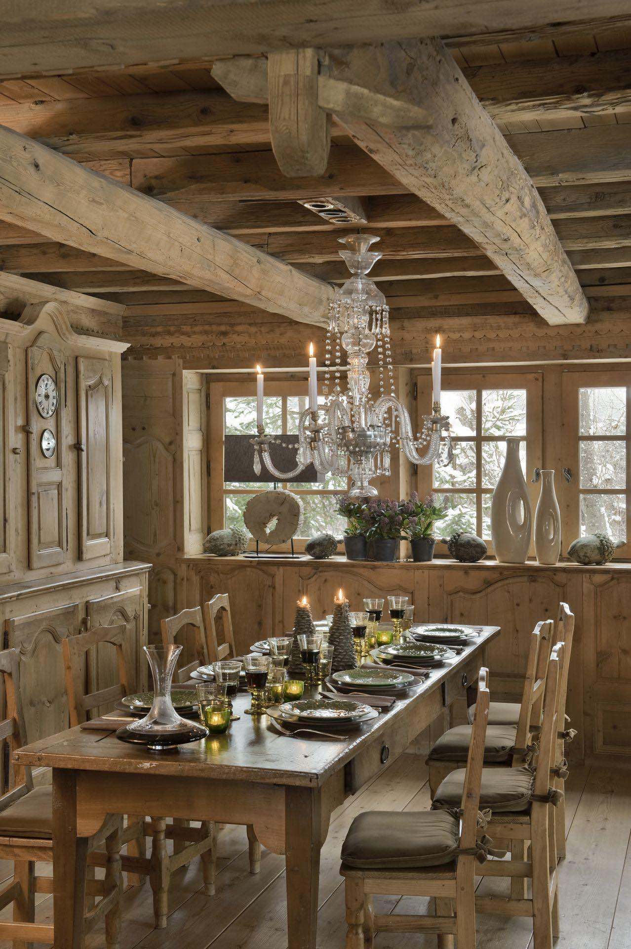 At the centre of the chalet, a vast living room with soaring beams, a magnificent fireplace, and a quiet desk area forms the heart of the home. The adjoining dining room opens onto a generous private terrace, perfect for sharing special moments.