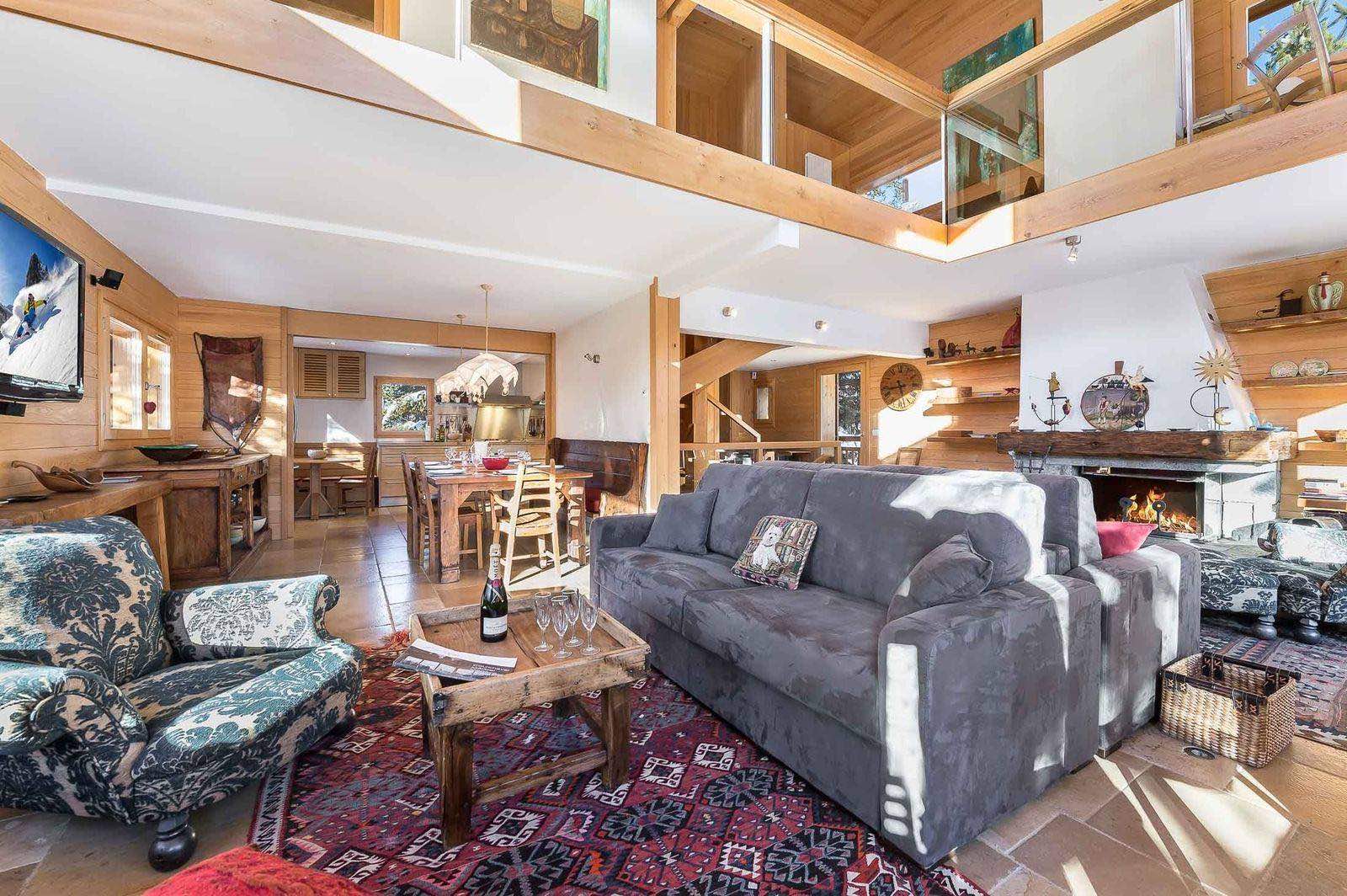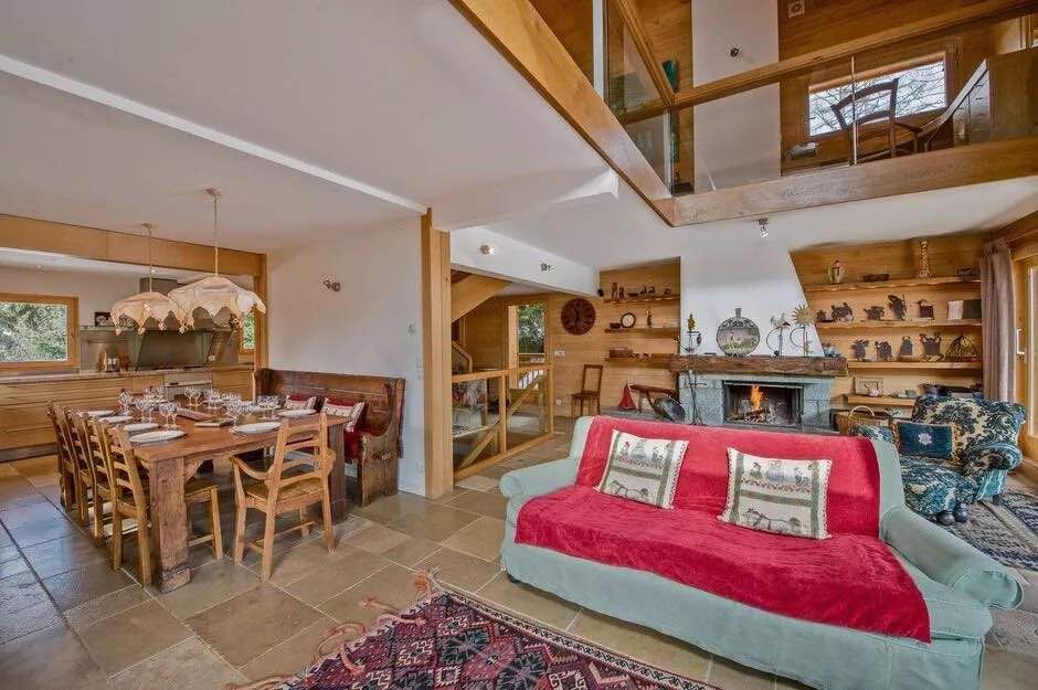 The heart of the home is the inviting living area, where a grand stone-and-wood fireplace brings warmth to both the lounge and dining space on winter evenings. Guests can enjoy meals in the charming dining room or step outside to the panoramic terrace, perfect for a Savoyard lunch with sweeping views of the peaks.