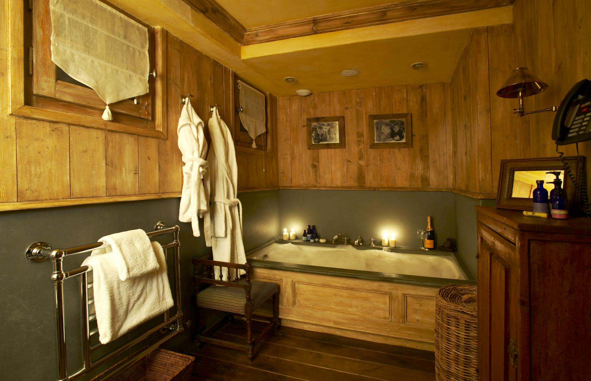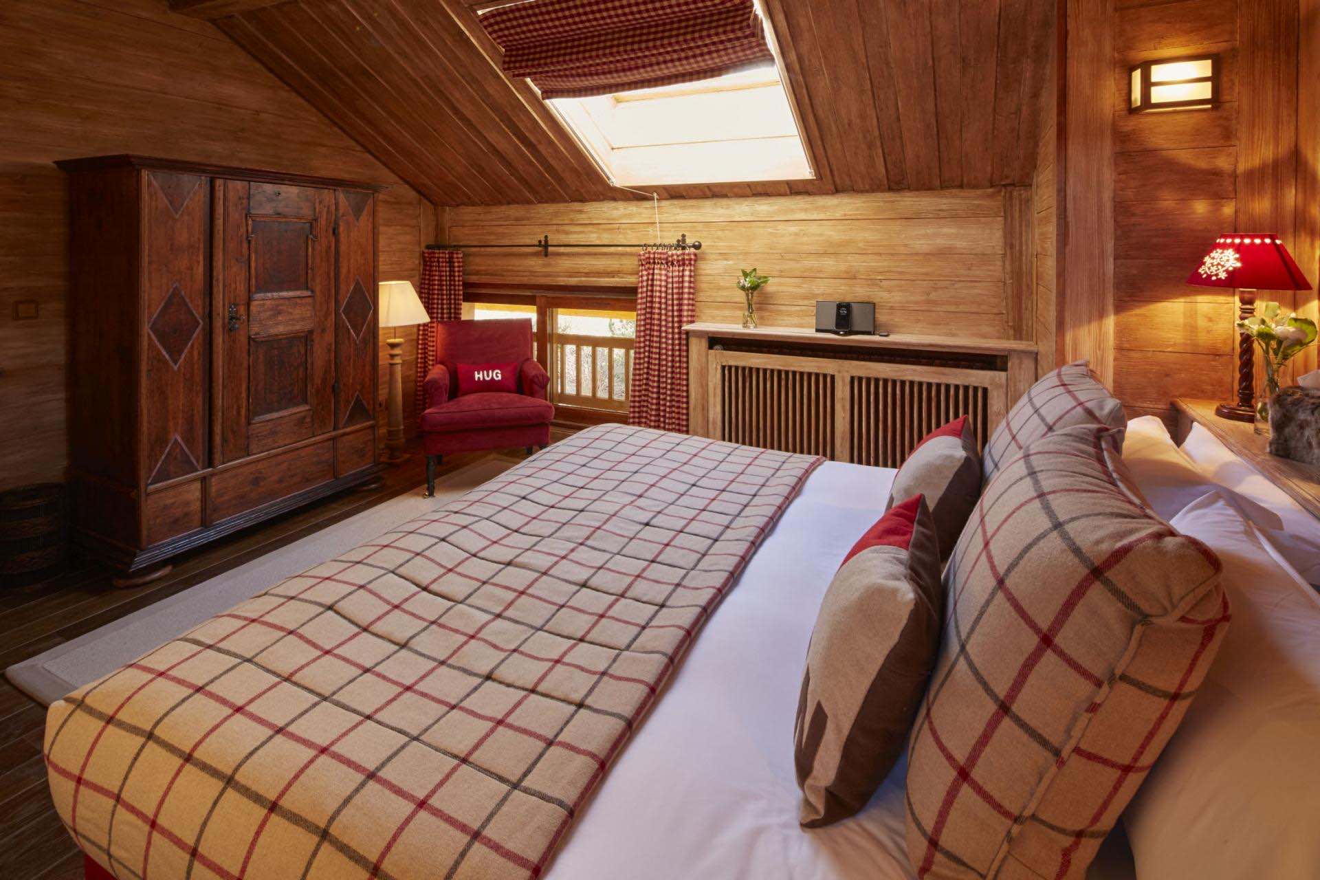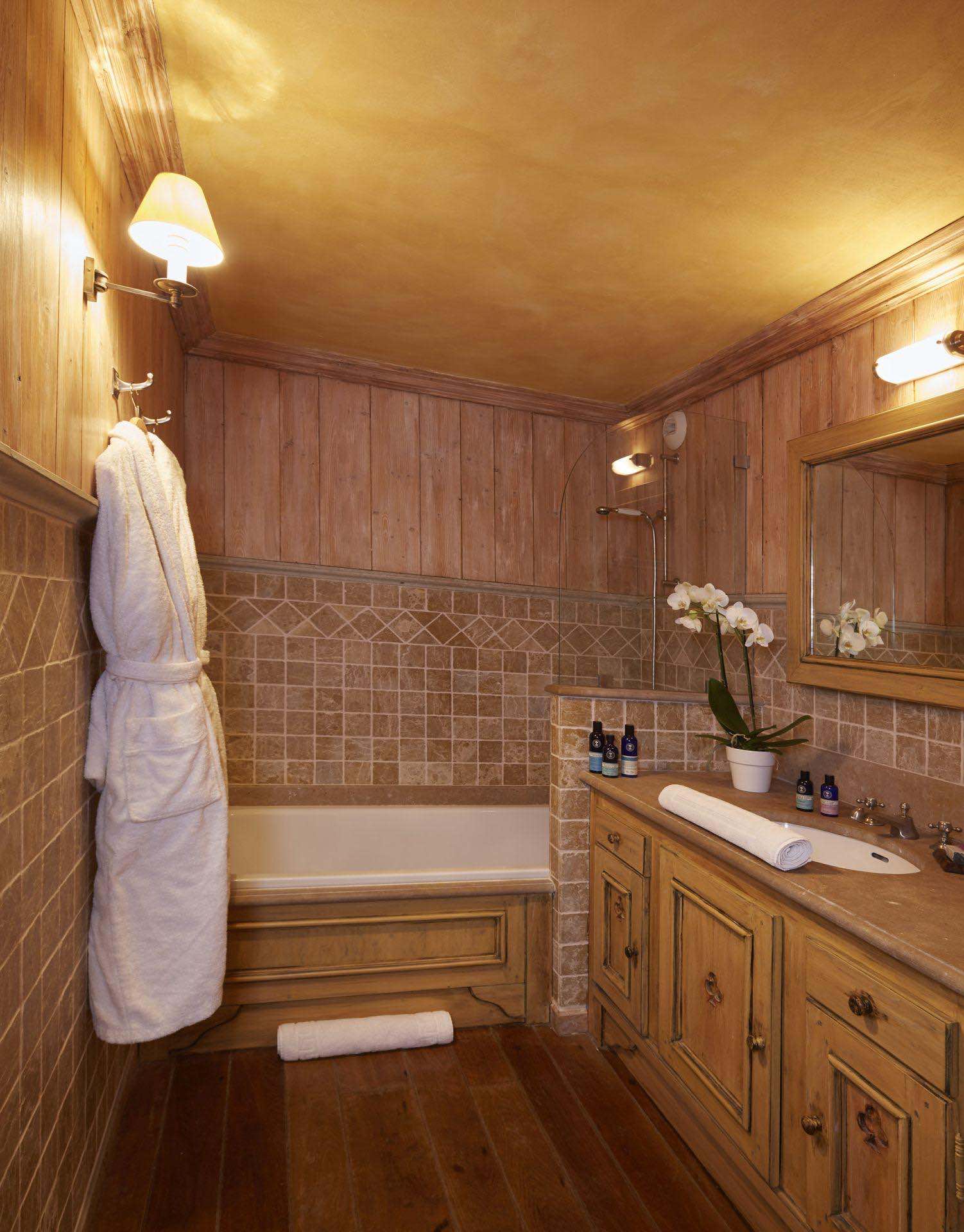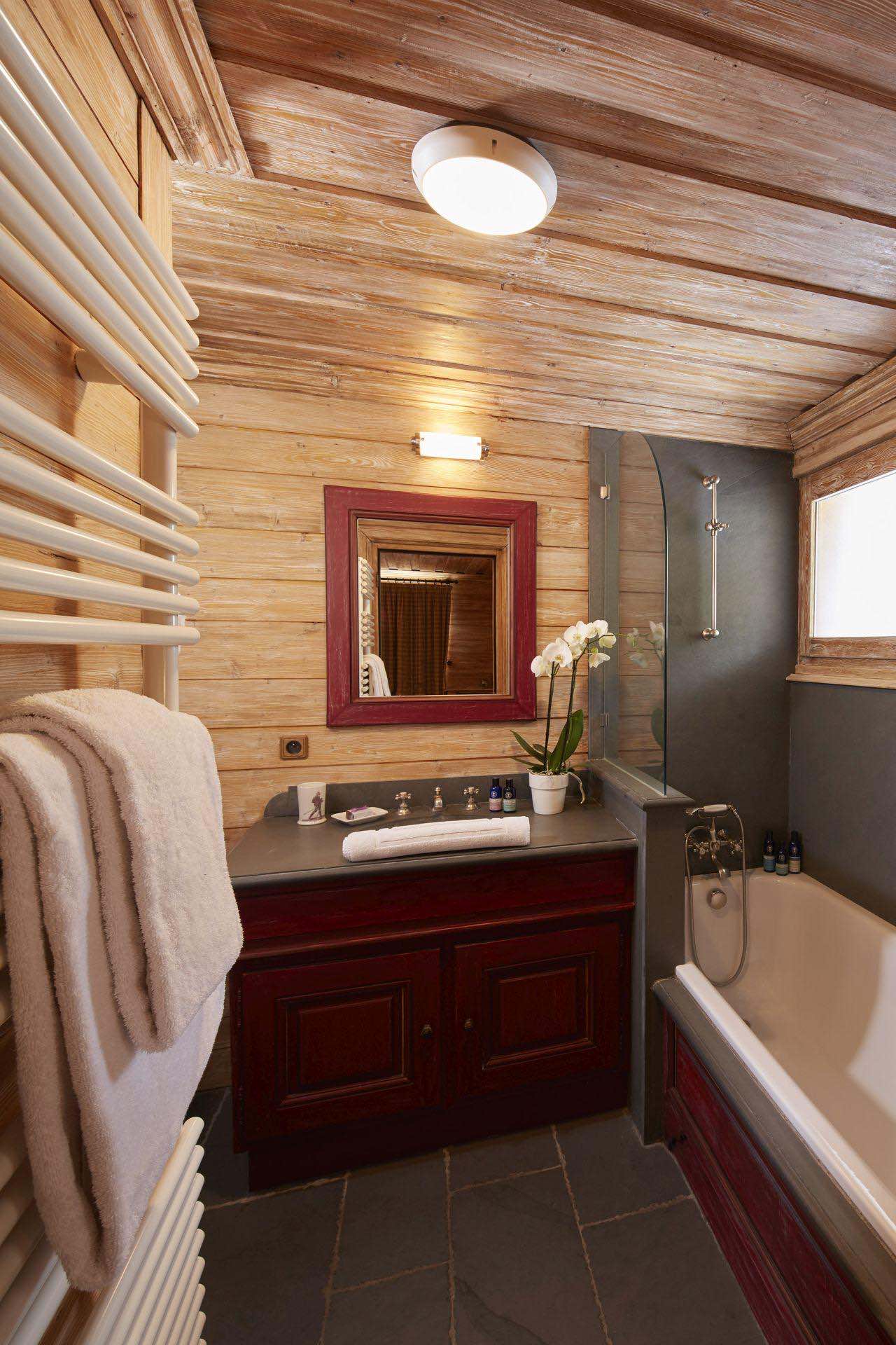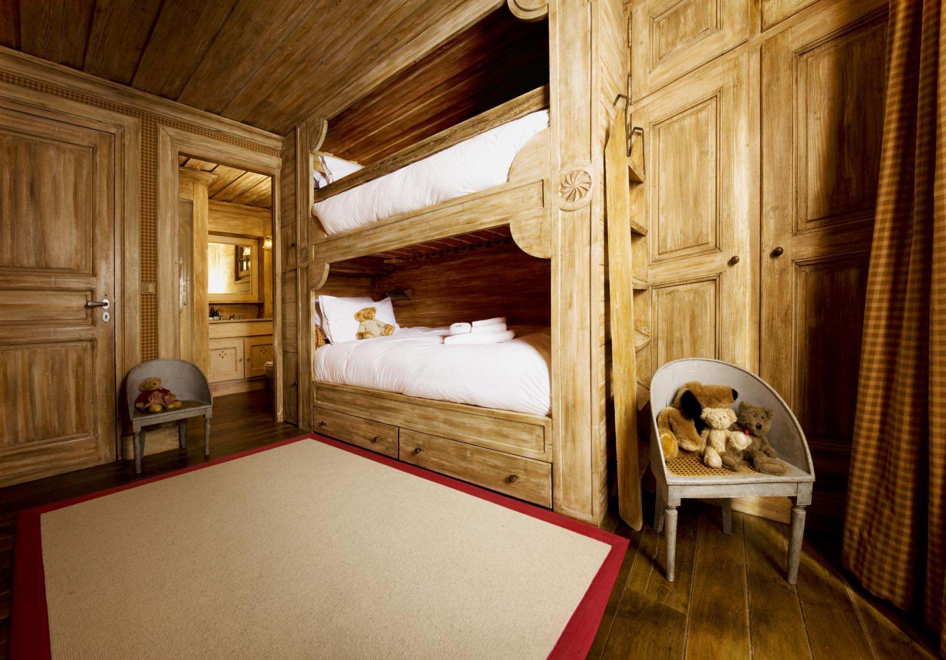 Accommodation at Chalet Foinsbois exudes alpine character, with rustic timber interiors complemented by warm red and soft white accents. The master suite on the first floor includes its own study, while five further double bedrooms—four of which can convert into twins—offer flexible arrangements for families or groups. A children’s bunk room and an additional small bunk room linked to a lower-ground bedroom provide the perfect set-up for younger guests. Bathrooms are traditional yet comfortable, with most rooms enjoying their own en-suite facilities.