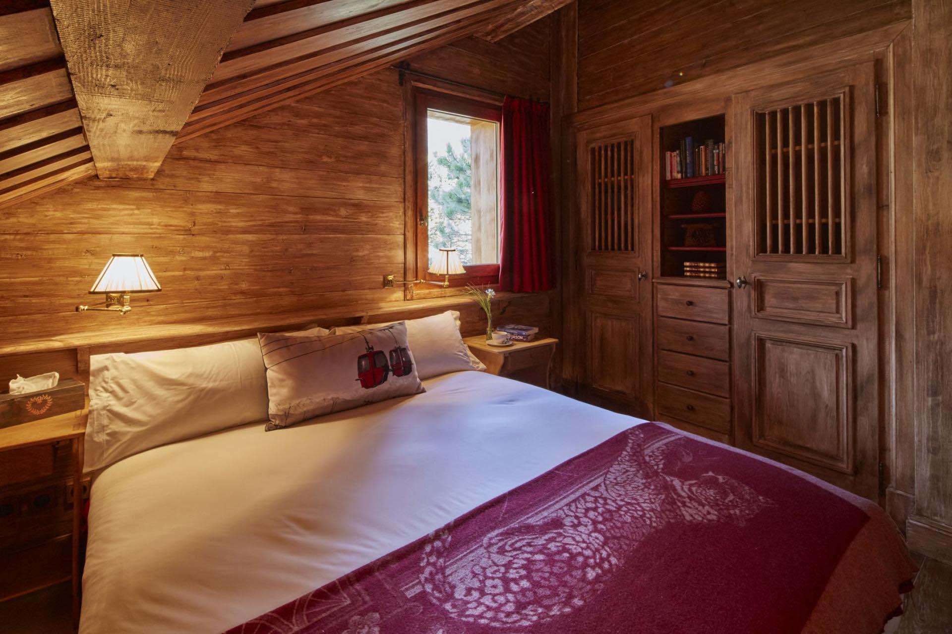 Built from traditional stone and wood, Chalet Foinsbois perfectly blends the spirit of a classic alpine lodge with the sophistication of a country manor. Guests are welcomed through an impressive entrance hall into the heart of the chalet—a stylish open-plan lounge and dining room anchored by a striking dual-aspect stone fireplace. With wood-panelled walls and ceilings, deep armchairs, shelves of vintage books, and the gentle crackle of the fire, the space radiates authentic alpine warmth. The adjoining dining table, complete with a cosy banquette corner, invites intimate and convivial meals. Step out onto the chalet’s terraces and balconies to breathe in crisp mountain air and admire sweeping views of snow-dusted peaks.