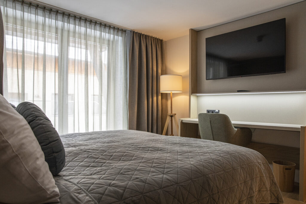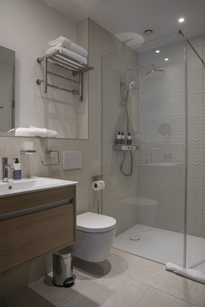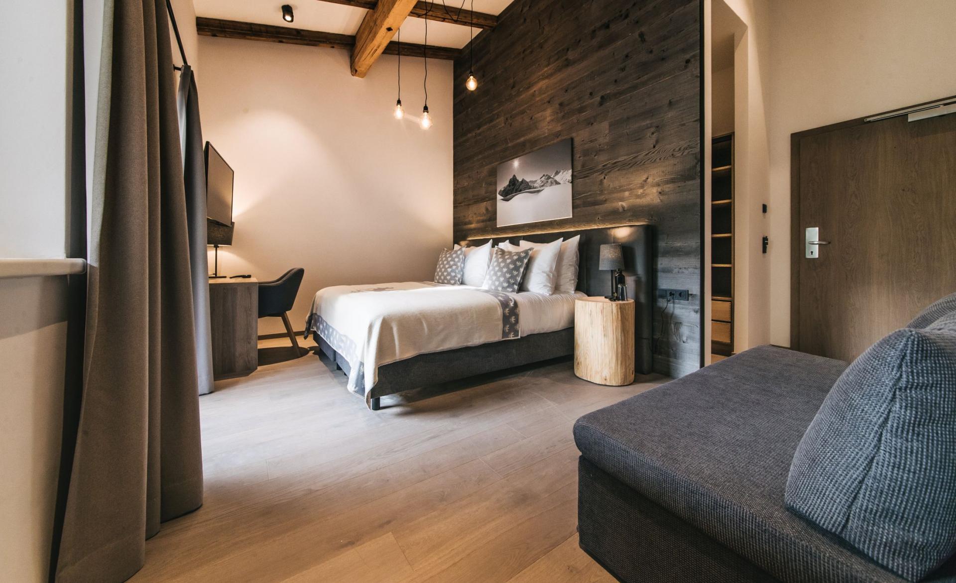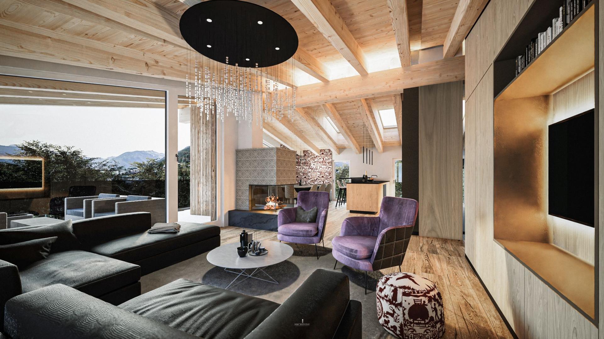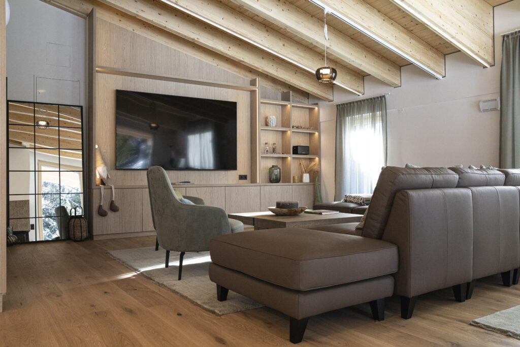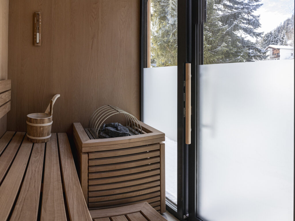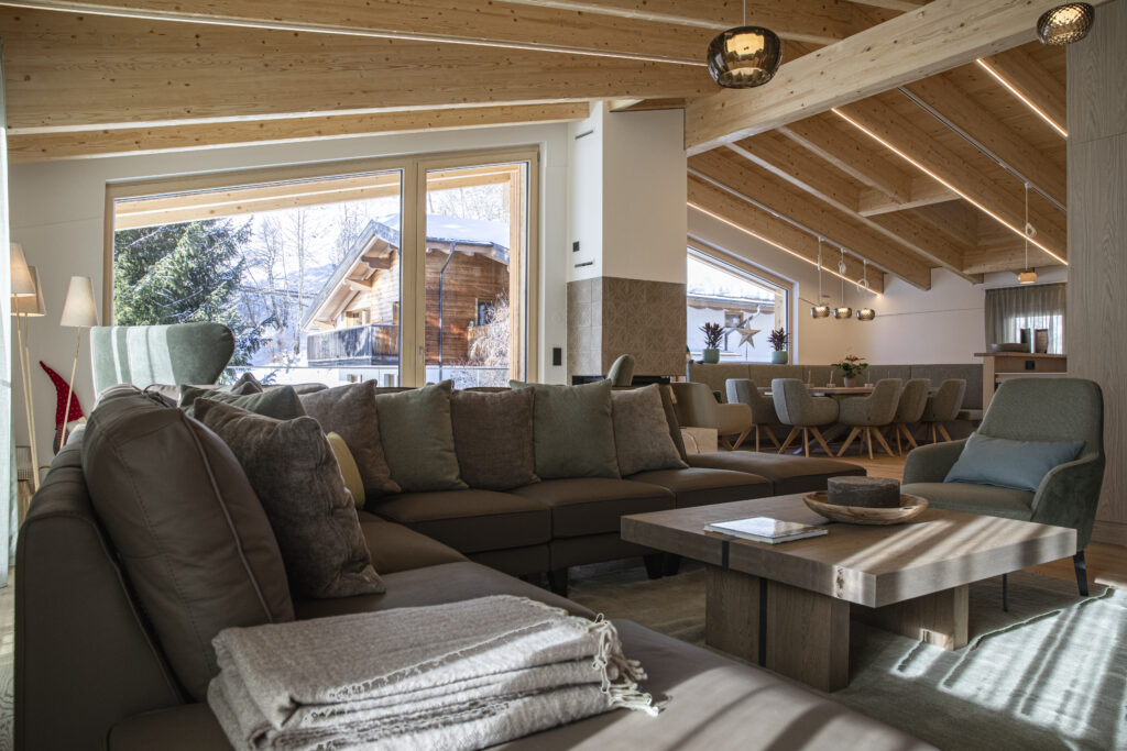 On the ground floor, a second lounge provides yet another inviting space to unwind, opening onto a charming terrace. Guests can gather around the firepit with an apéritif, relax in the outdoor sauna after a day on the slopes, or let children play in the snow-filled private gardens surrounding the wellness area.