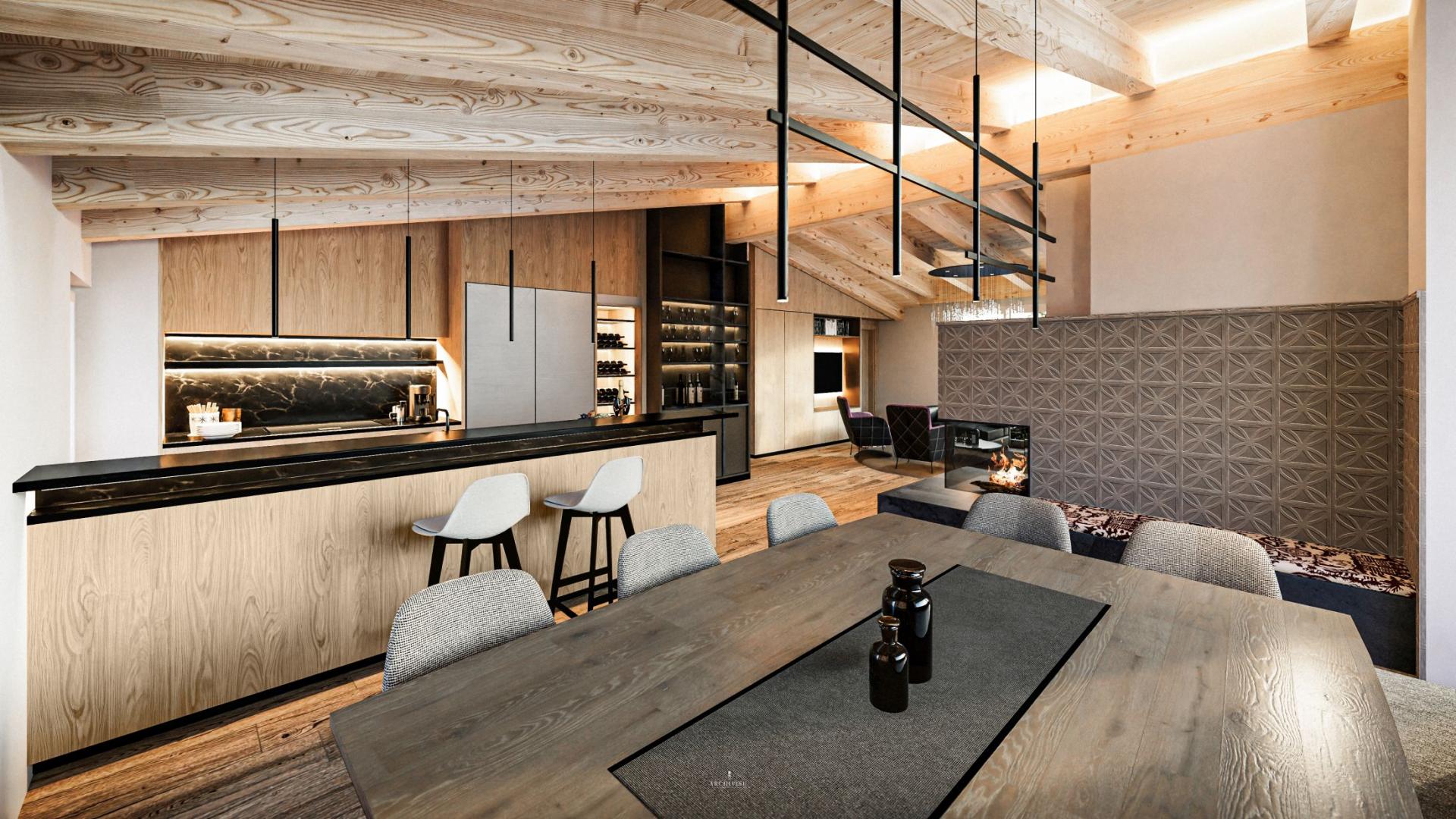 The chalet’s main living spaces are located on the top floor, designed with an open-plan layout beneath vaulted wooden ceilings. Skylights and expansive windows bathe the lounge, dining, and kitchen areas in natural light while framing beautiful mountain views. A cosy feature fireplace separates the plush lounge seating and television area from the kitchen and dining space, where a private chef can prepare meals in the show kitchen before they’re enjoyed at the elegant 10-person table. From here, step out onto a spacious balcony with outdoor seating, perfect for soaking up the alpine atmosphere.