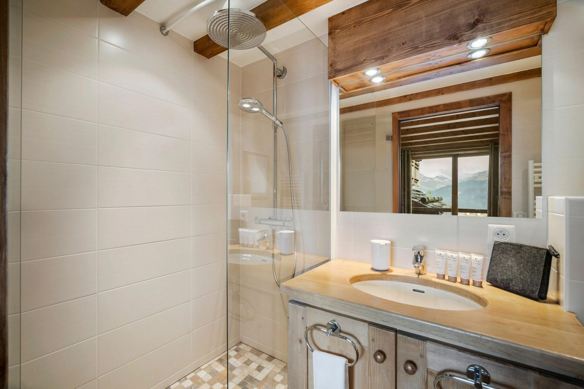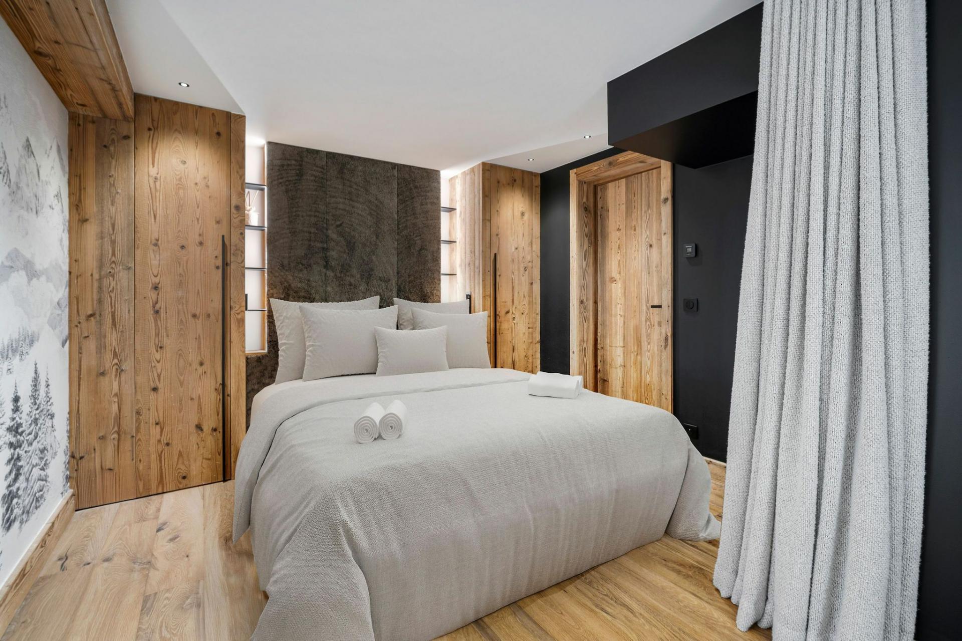 Six double bedrooms are spread throughout the chalet, comfortably accommodating 12 guests. Each room continues the modern-alpine aesthetic with warm, homely touches. The master suite and its en-suite bathroom occupy the entire top floor, enjoying breathtaking views over the valley. All but one of the remaining double bedrooms also feature en-suite facilities for added privacy and comfort.