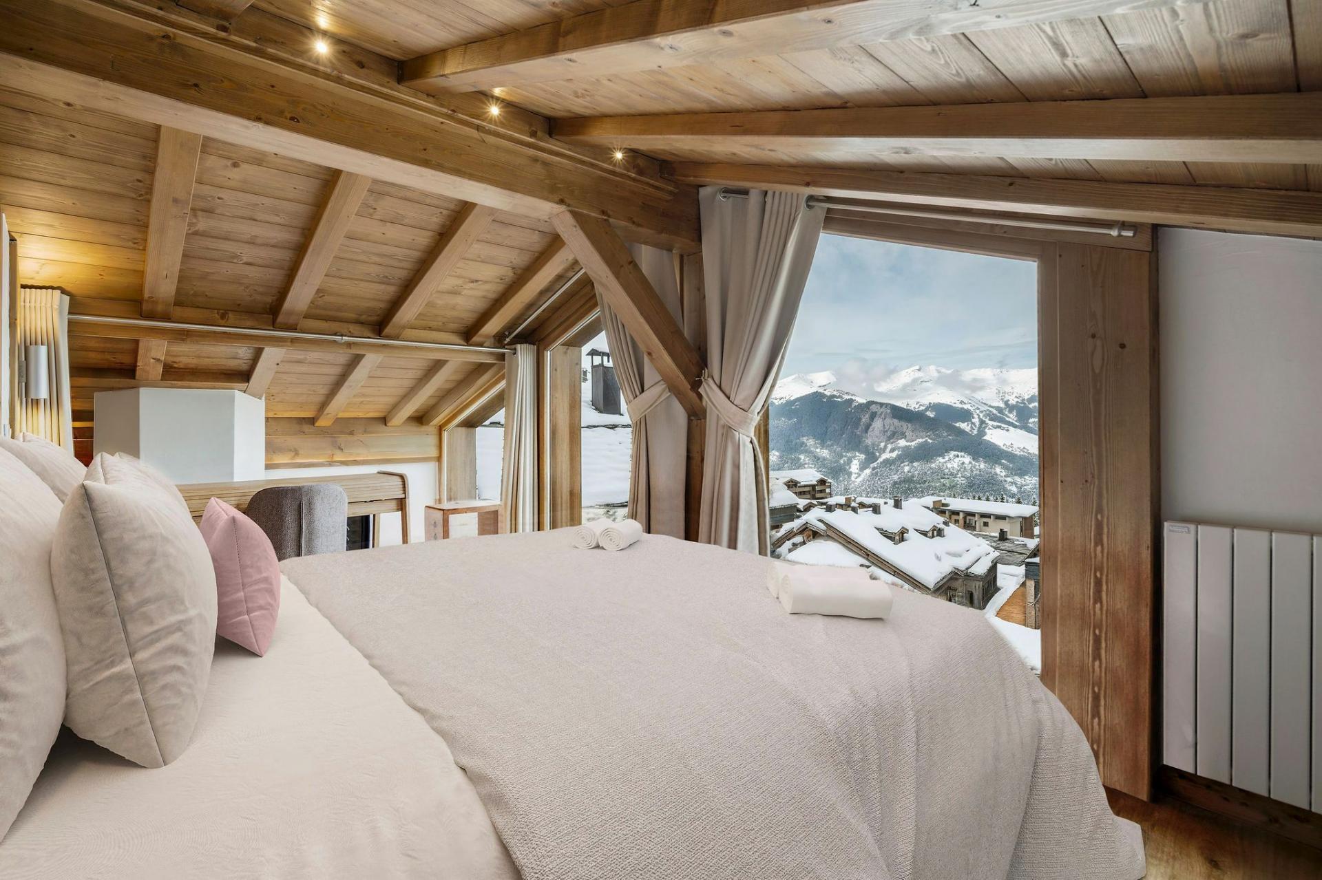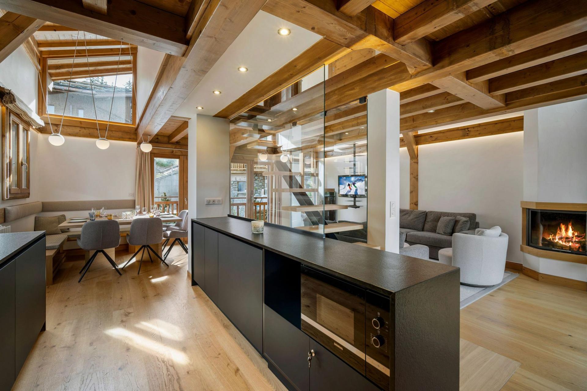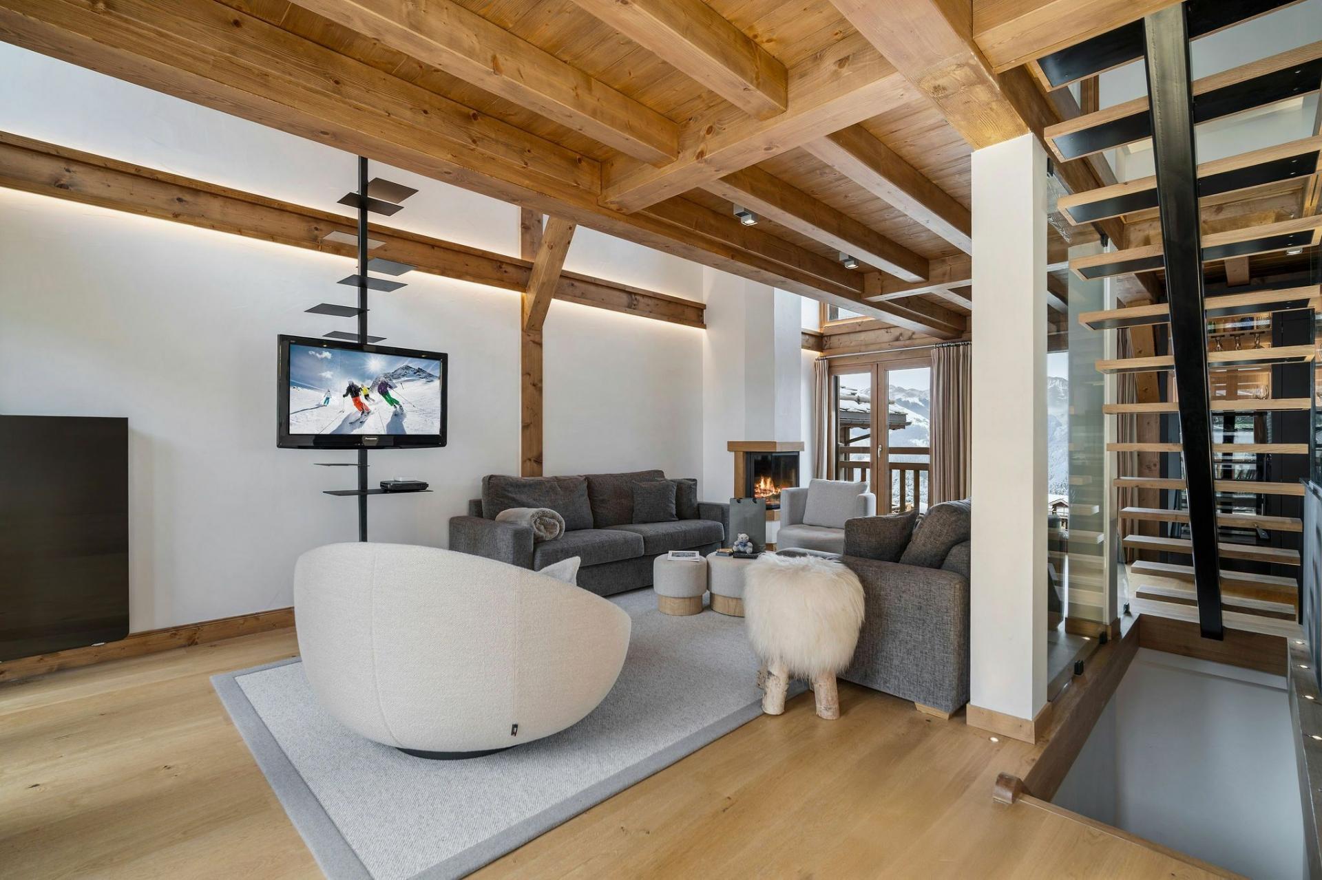 The main living area occupies the third floor, where a contemporary open-plan layout creates a welcoming hub for the chalet. Soft furnishings and a neutral colour palette complement the exposed wooden beams, while floor-to-ceiling windows and vaulted ceilings flood the space with natural light, enhancing the airy, spacious feel. After a day on the slopes, guests can unwind in the cosy TV lounge as the private chef prepares dinner. A warm fireplace and a glass of wine pair perfectly with the panoramic views framed by the large windows. Meals can be enjoyed around the dining table, followed by time out on the terrace to fully take in the snowy landscape.