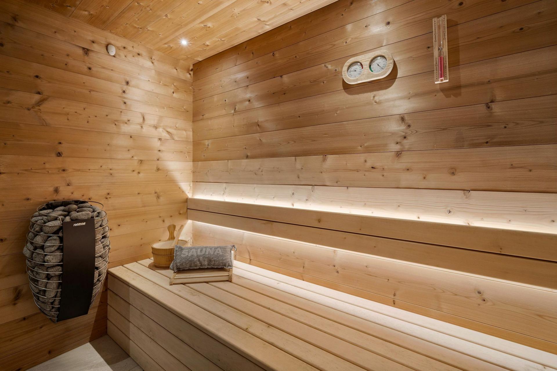 The chalet’s spa area, located on the lowest level, is designed for complete relaxation. An indoor swimming pool overlooks the winter scenery, offering a refreshing dip after skiing. Beside the pool, a sauna provides the ideal place to ease tired muscles and rejuvenate for the days ahead.