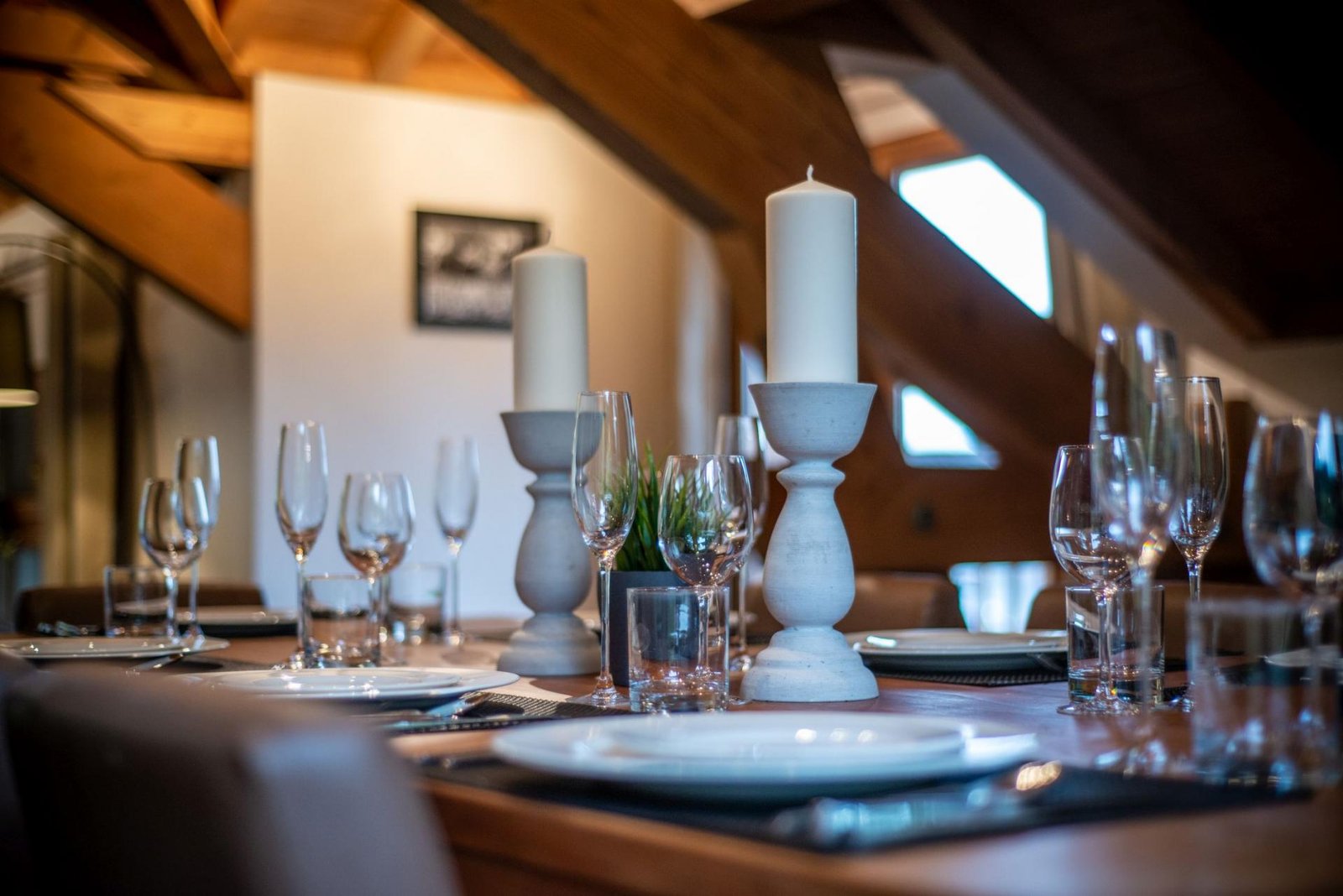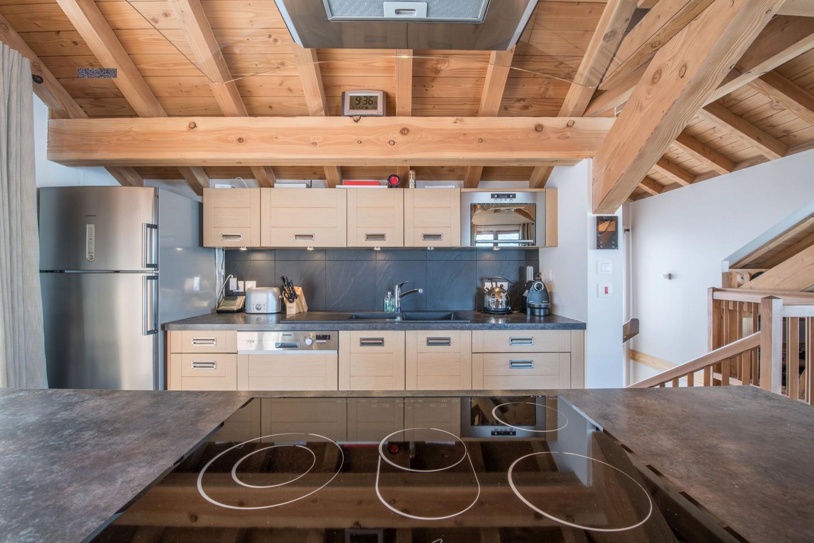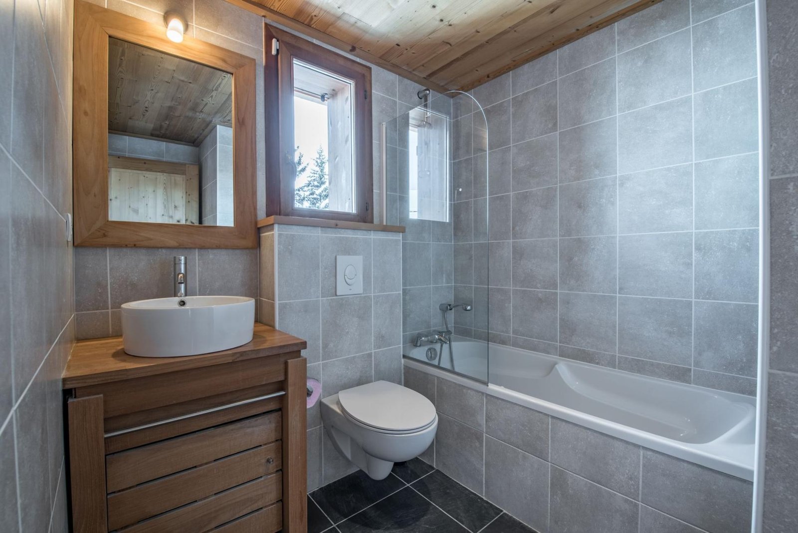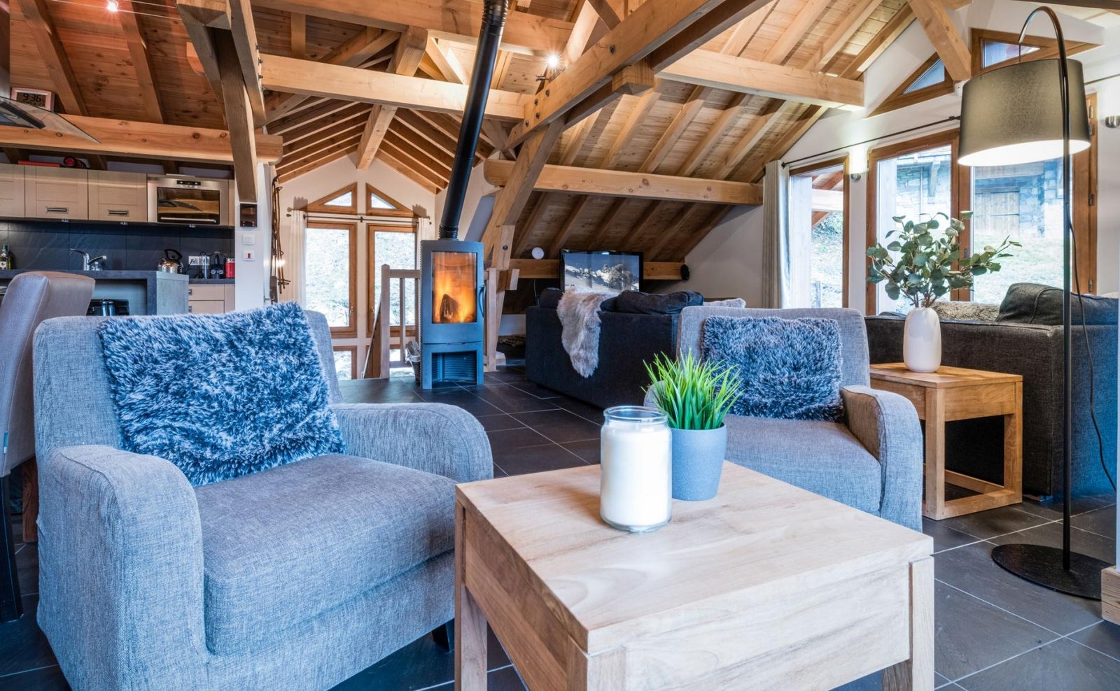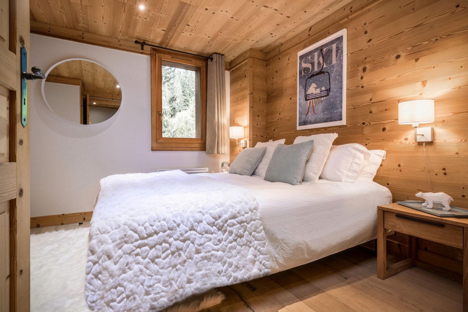 At the heart of the chalet is a stunning open-plan living space beneath vaulted wooden ceilings. Large windows frame picturesque forest and mountain views, while a crackling log fire creates a warm and inviting atmosphere after a day on the slopes. The adjoining dining area and fully equipped kitchen provide the perfect space for socialising, whether enjoying breakfast or a gourmet evening meal prepared by your private chef.