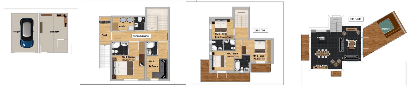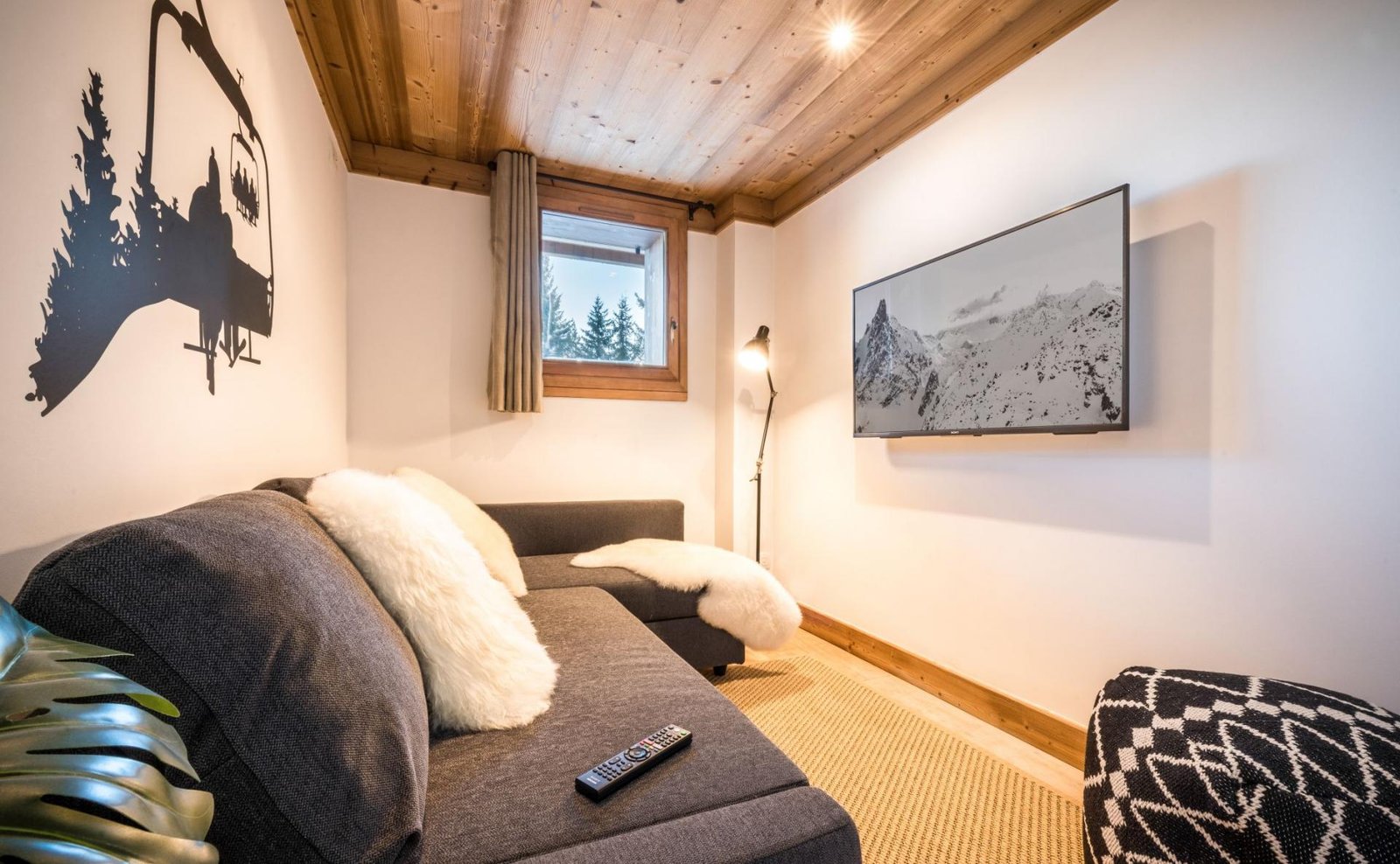 Sleeping up to 8–10 guests, the chalet is arranged over three floors and features four individually styled en-suite bedrooms, each inspired by alpine wildlife. A cosy TV lounge with a sofa bed offers additional flexibility, making it ideal for families or groups of friends.