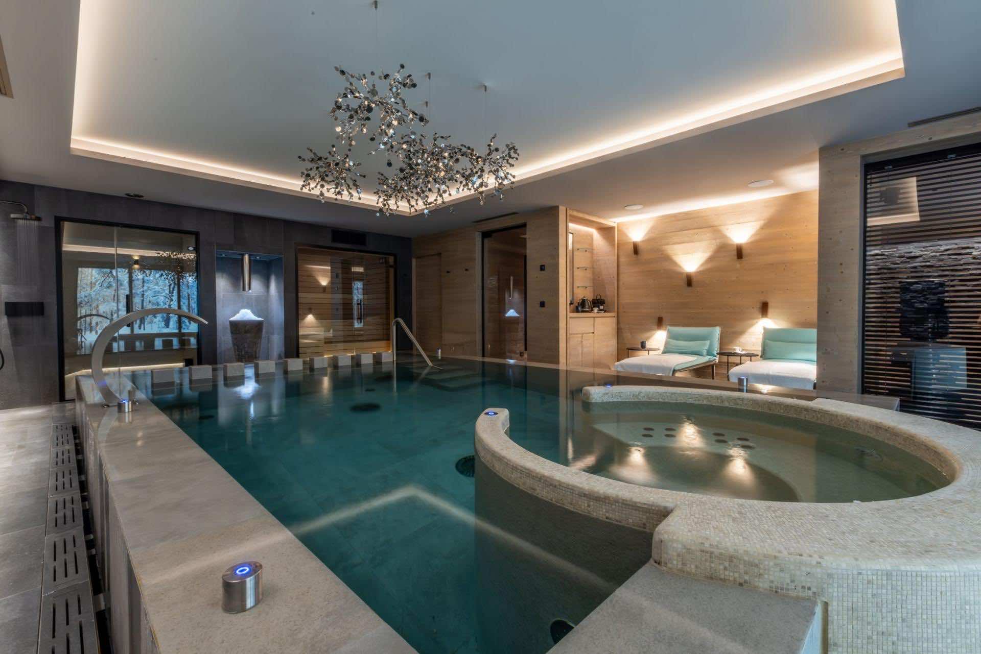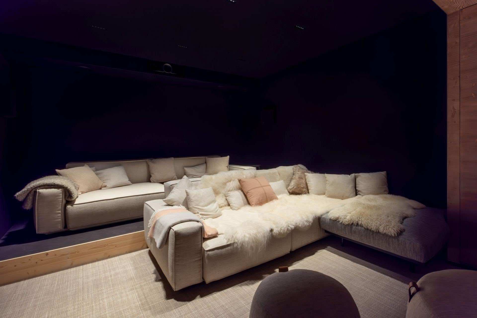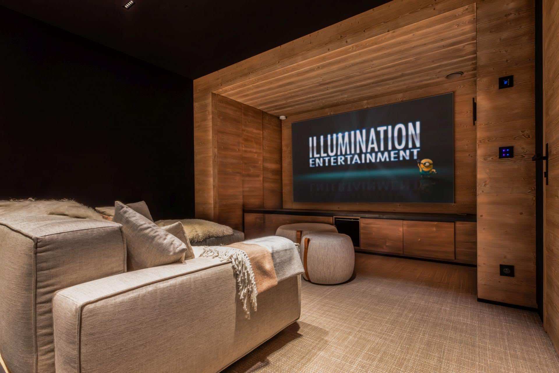 The chalet’s pièce de résistance is its exquisite spa and wellness area, created for complete relaxation and rejuvenation. The indoor pool, set against a striking faux mountain backdrop, provides a tranquil escape, with an enclosed seating area and massage jets to soothe tired muscles. A sauna, Hammam, and calm relaxation zone offer further opportunities to unwind, while a well-equipped fitness area caters to guests looking to stay active. As evening falls, gather in the plush cinema room, where deep, comfortable sofas invite you to settle in for a cozy film night.