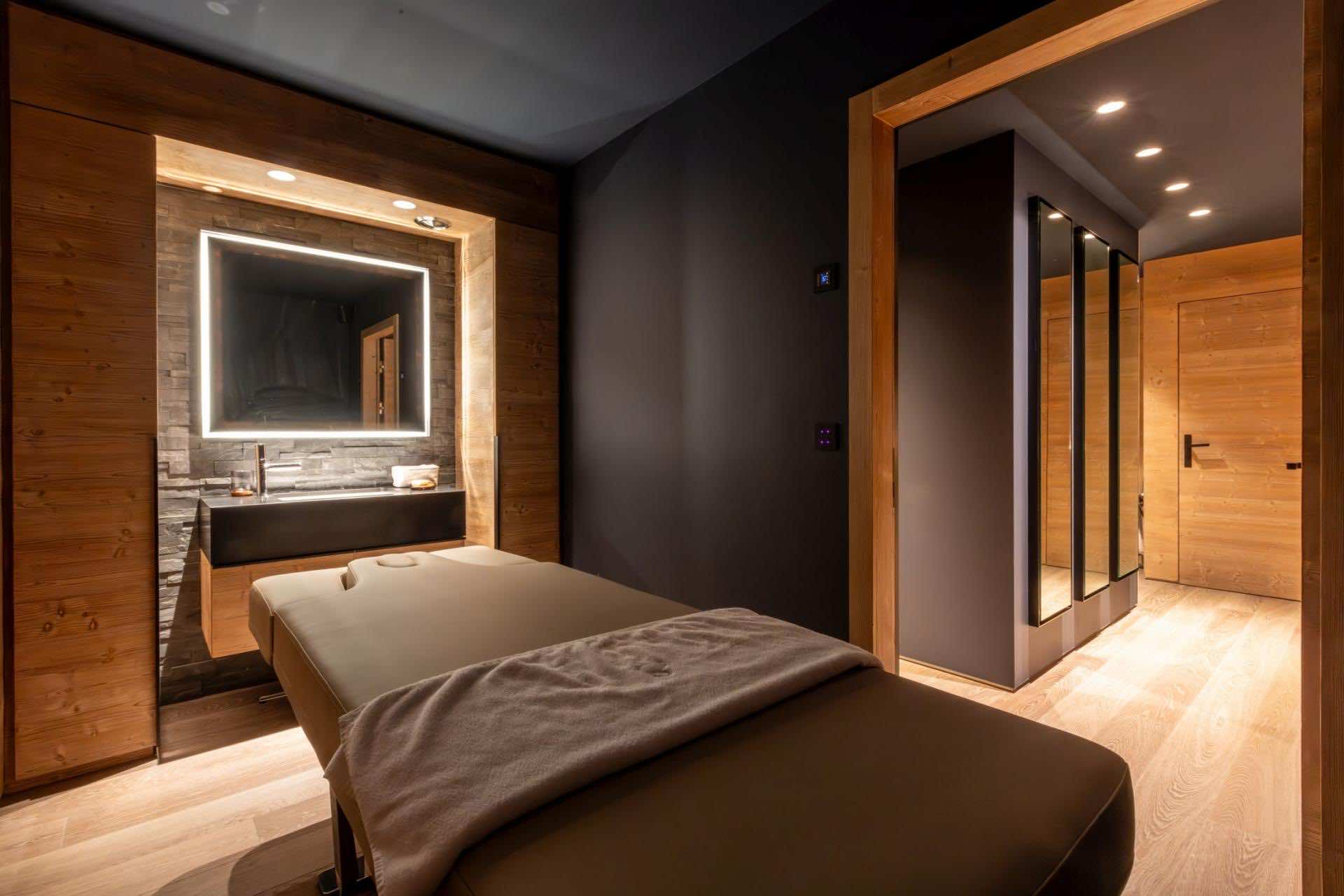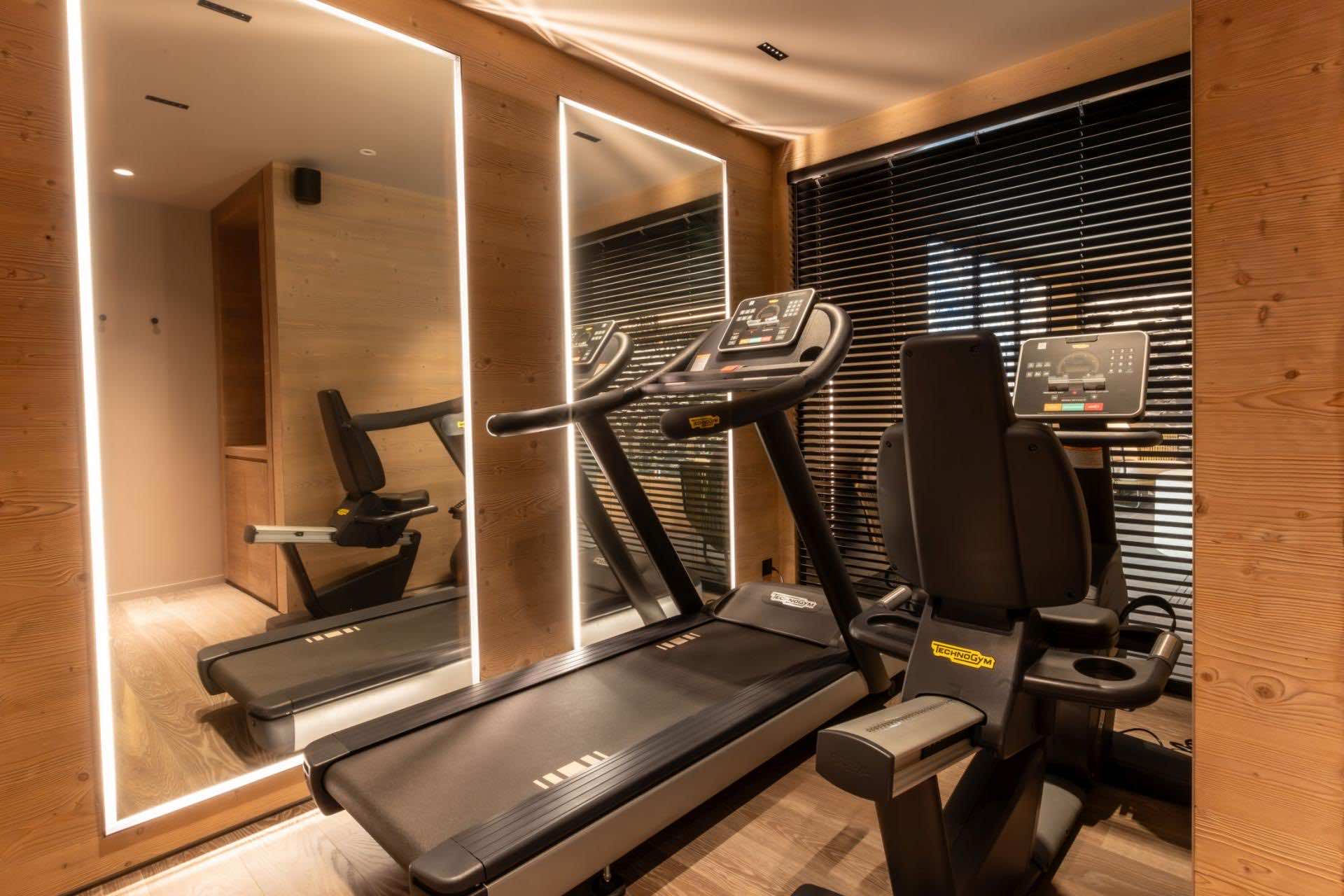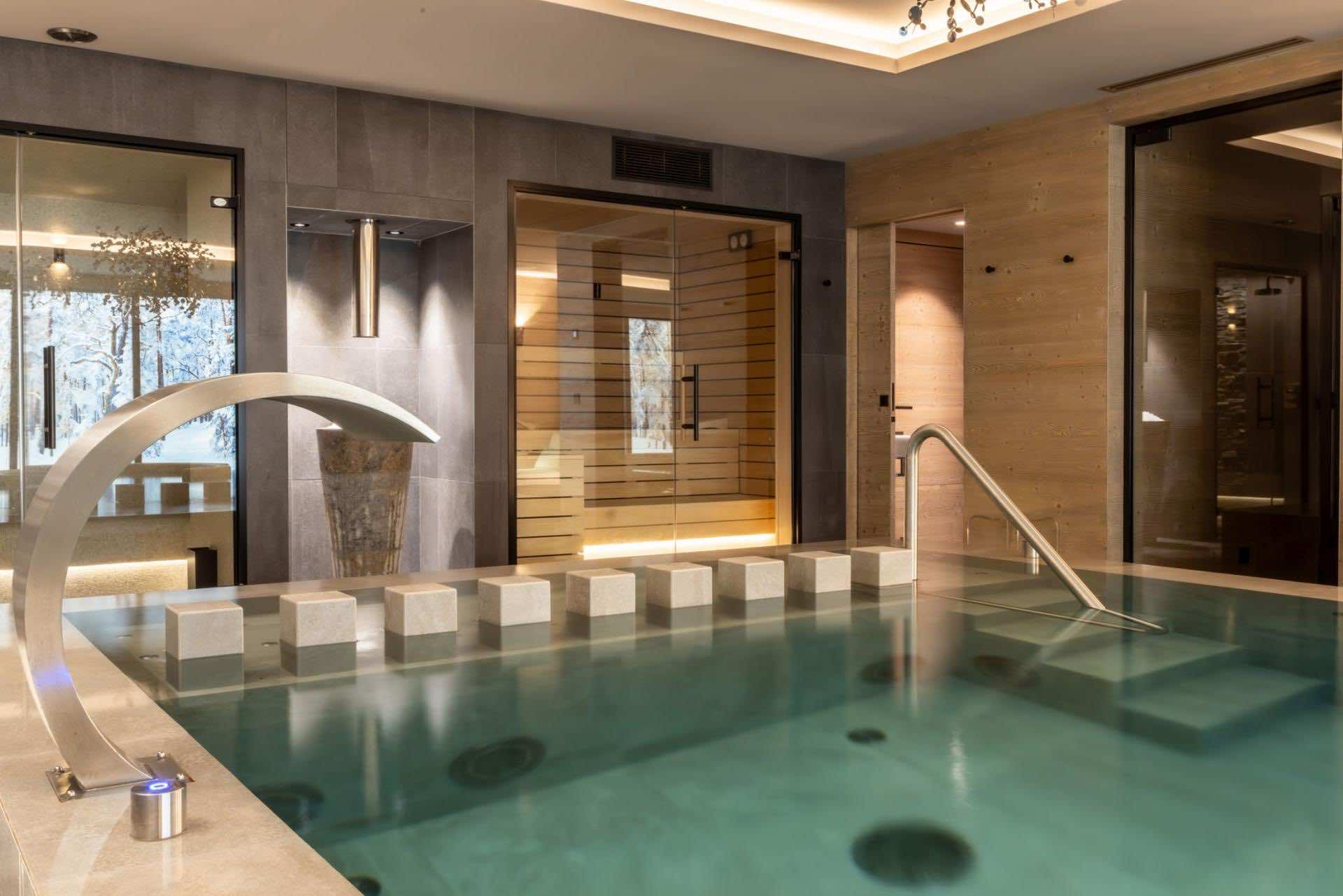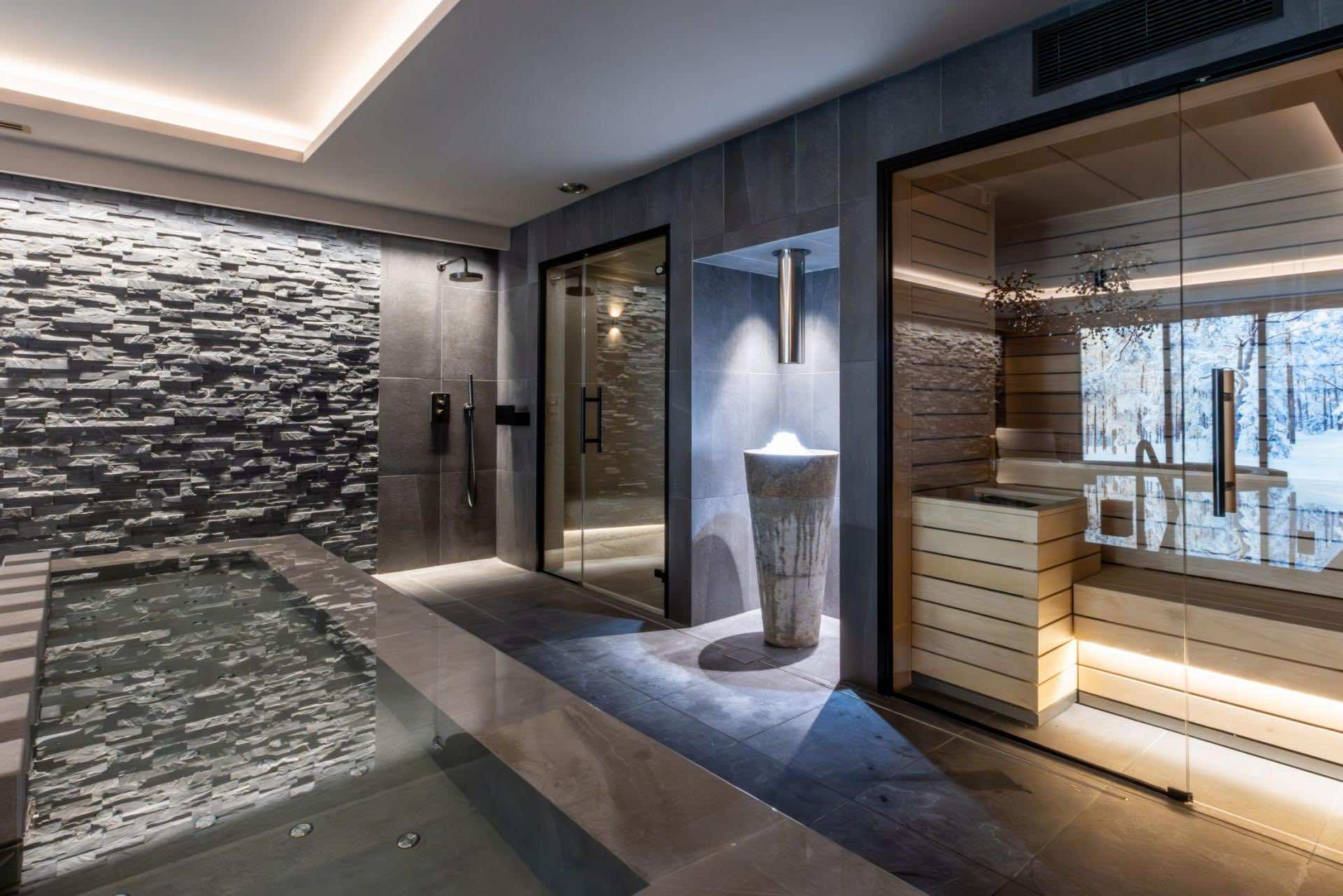 The chalet’s pièce de résistance is its exquisite spa and wellness area, created for complete relaxation and rejuvenation. The indoor pool, set against a striking faux mountain backdrop, provides a tranquil escape, with an enclosed seating area and massage jets to soothe tired muscles. A sauna, Hammam, and calm relaxation zone offer further opportunities to unwind, while a well-equipped fitness area caters to guests looking to stay active. As evening falls, gather in the plush cinema room, where deep, comfortable sofas invite you to settle in for a cozy film night.