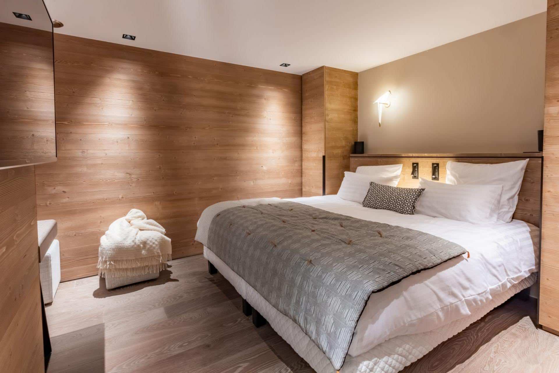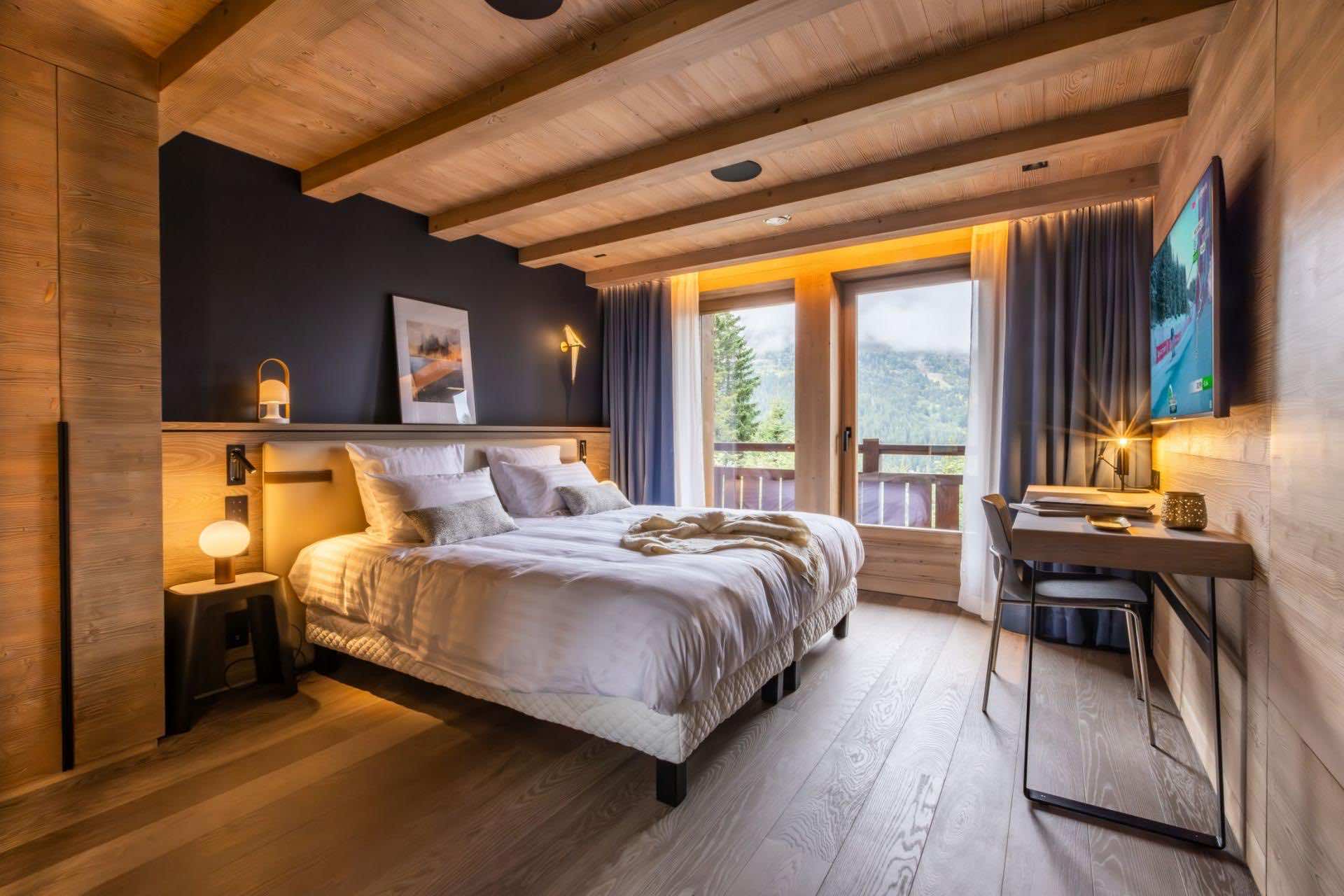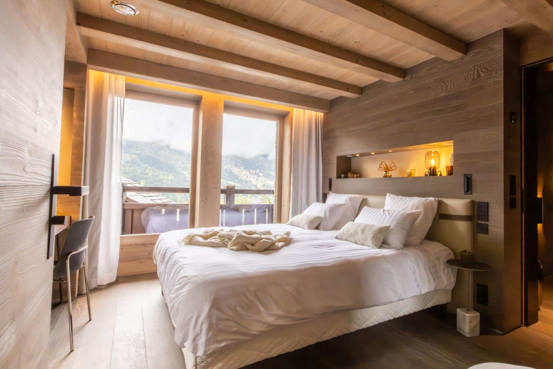 Chalet Kirana offers seven beautifully appointed bedrooms spread across two floors, comfortably hosting up to 14 guests. Each bedroom embodies modern alpine minimalism, blending natural textures with refined finishes to create serene and inviting retreats. All rooms feature sumptuous beds and private en-suite bathrooms with either a shower or bath. Most bedrooms also enjoy outdoor access via a balcony or terrace, allowing guests to savour peaceful moments surrounded by stunning mountain views. Every detail — from layout to materials — has been designed to ensure the utmost comfort and relaxation.