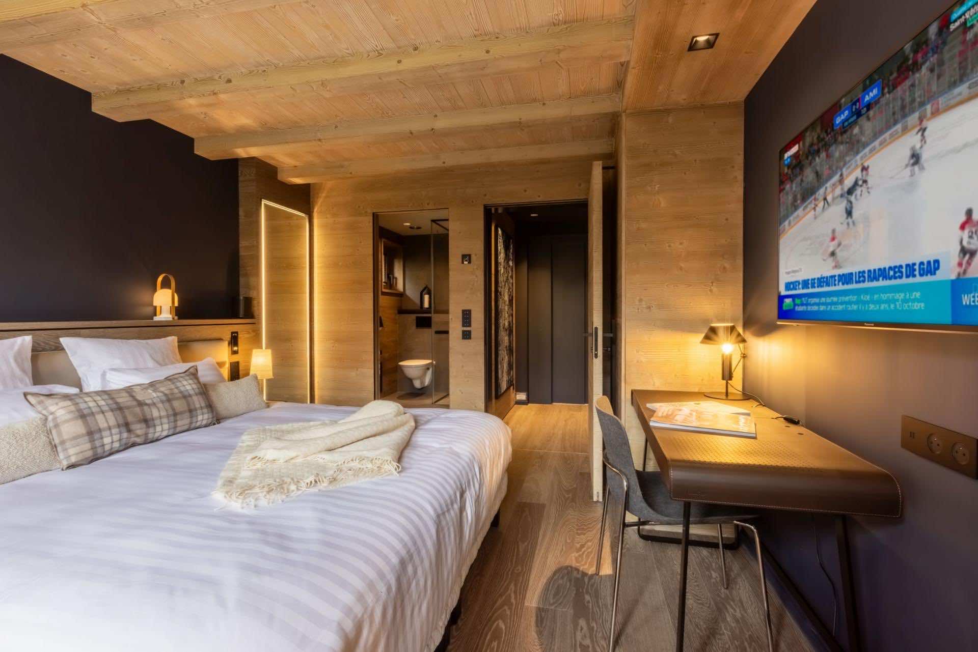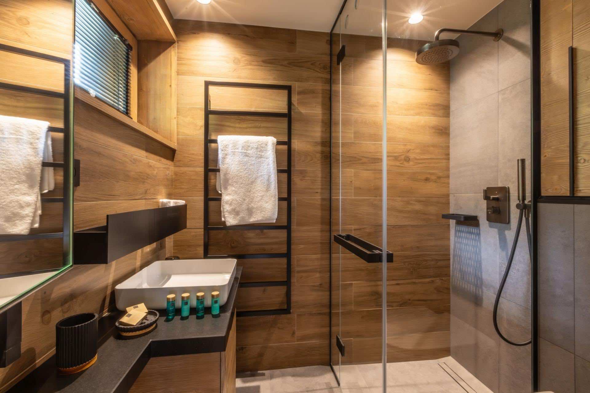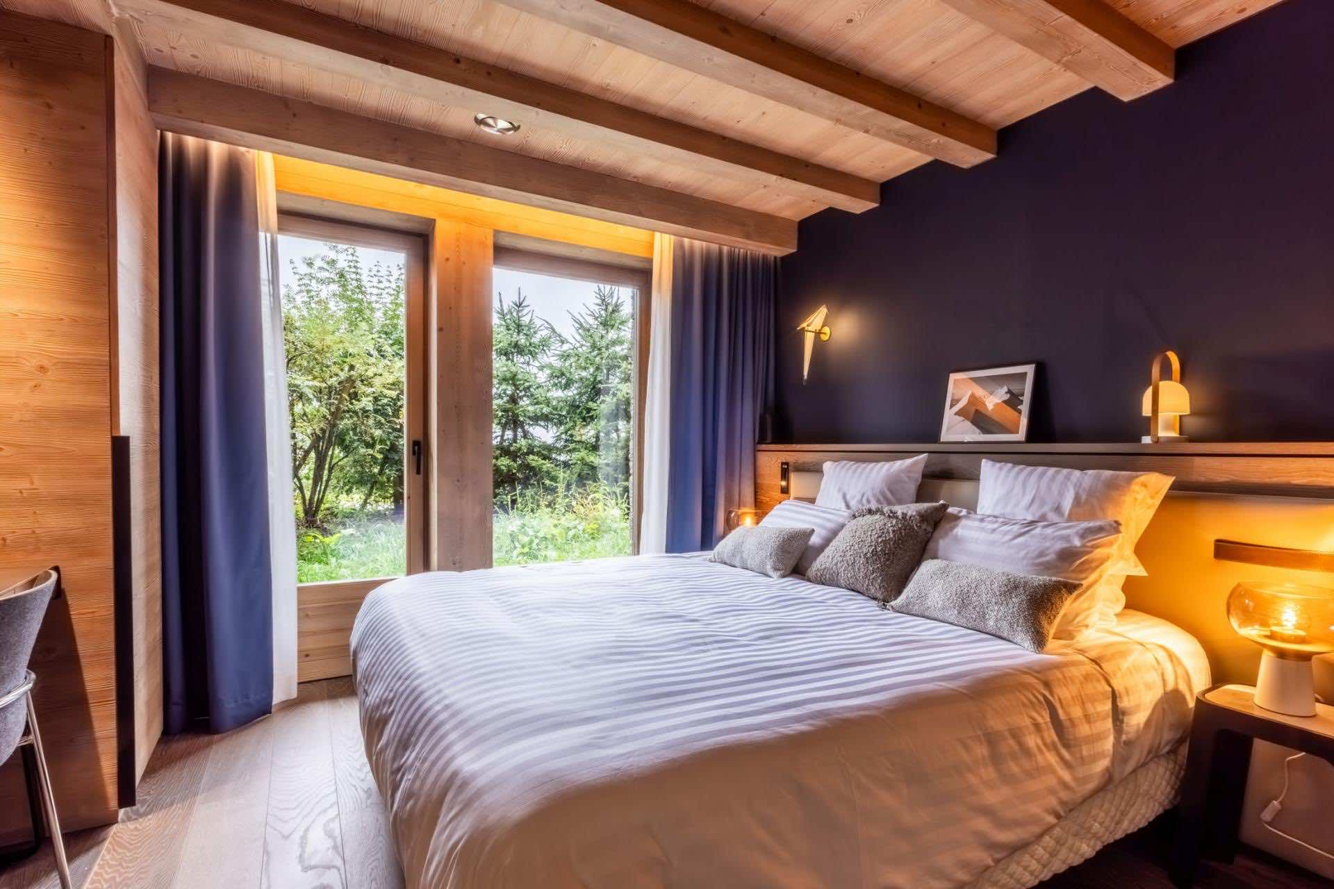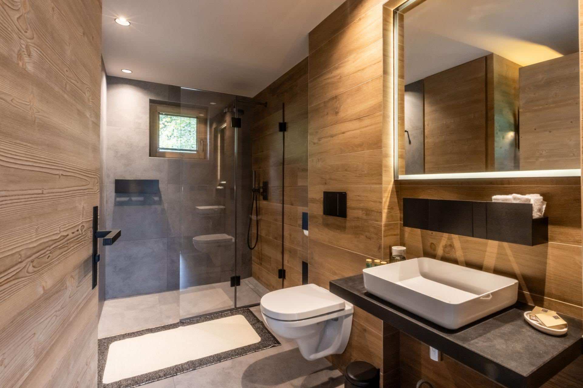 Chalet Kirana offers seven beautifully appointed bedrooms spread across two floors, comfortably hosting up to 14 guests. Each bedroom embodies modern alpine minimalism, blending natural textures with refined finishes to create serene and inviting retreats. All rooms feature sumptuous beds and private en-suite bathrooms with either a shower or bath. Most bedrooms also enjoy outdoor access via a balcony or terrace, allowing guests to savour peaceful moments surrounded by stunning mountain views. Every detail — from layout to materials — has been designed to ensure the utmost comfort and relaxation.