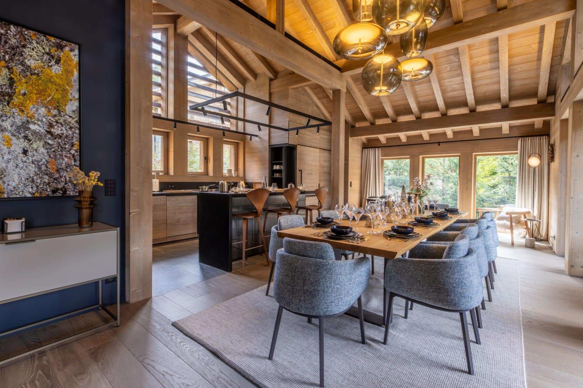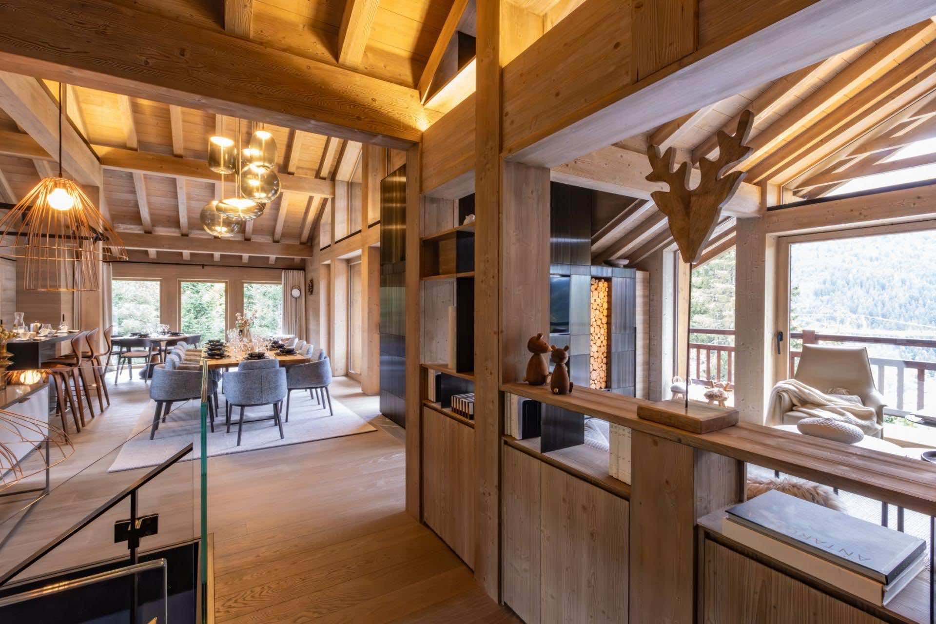 At the very top of Chalet Kirana lies the main living area — a stunning space that combines traditional alpine charm with contemporary sophistication. Vaulted ceilings with exposed beams lend a sense of grandeur, while large windows flood the room with natural light and frame picturesque mountain views. The expansive lounge, anchored by a sleek modern fireplace, offers a warm and inviting atmosphere for après-ski relaxation.