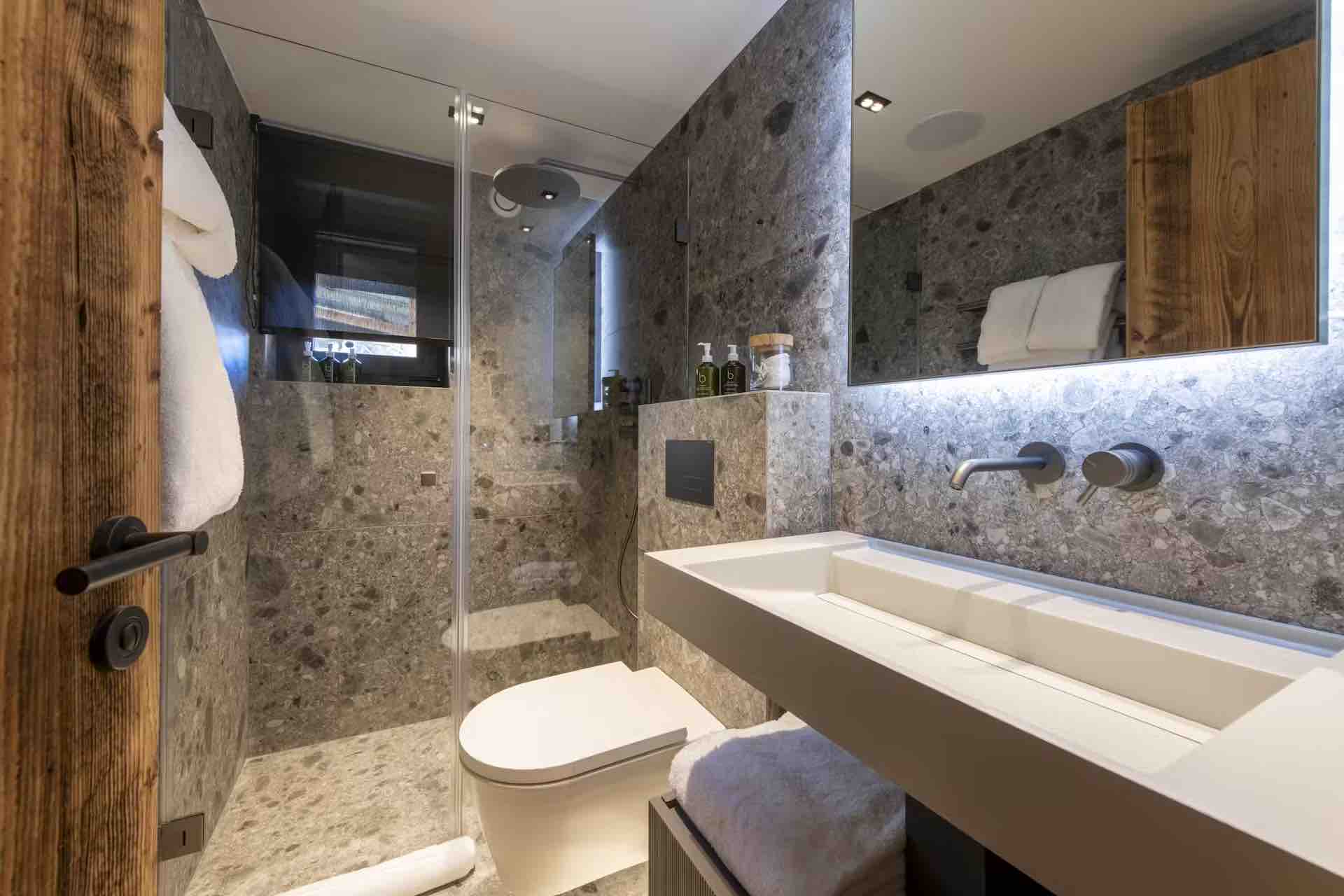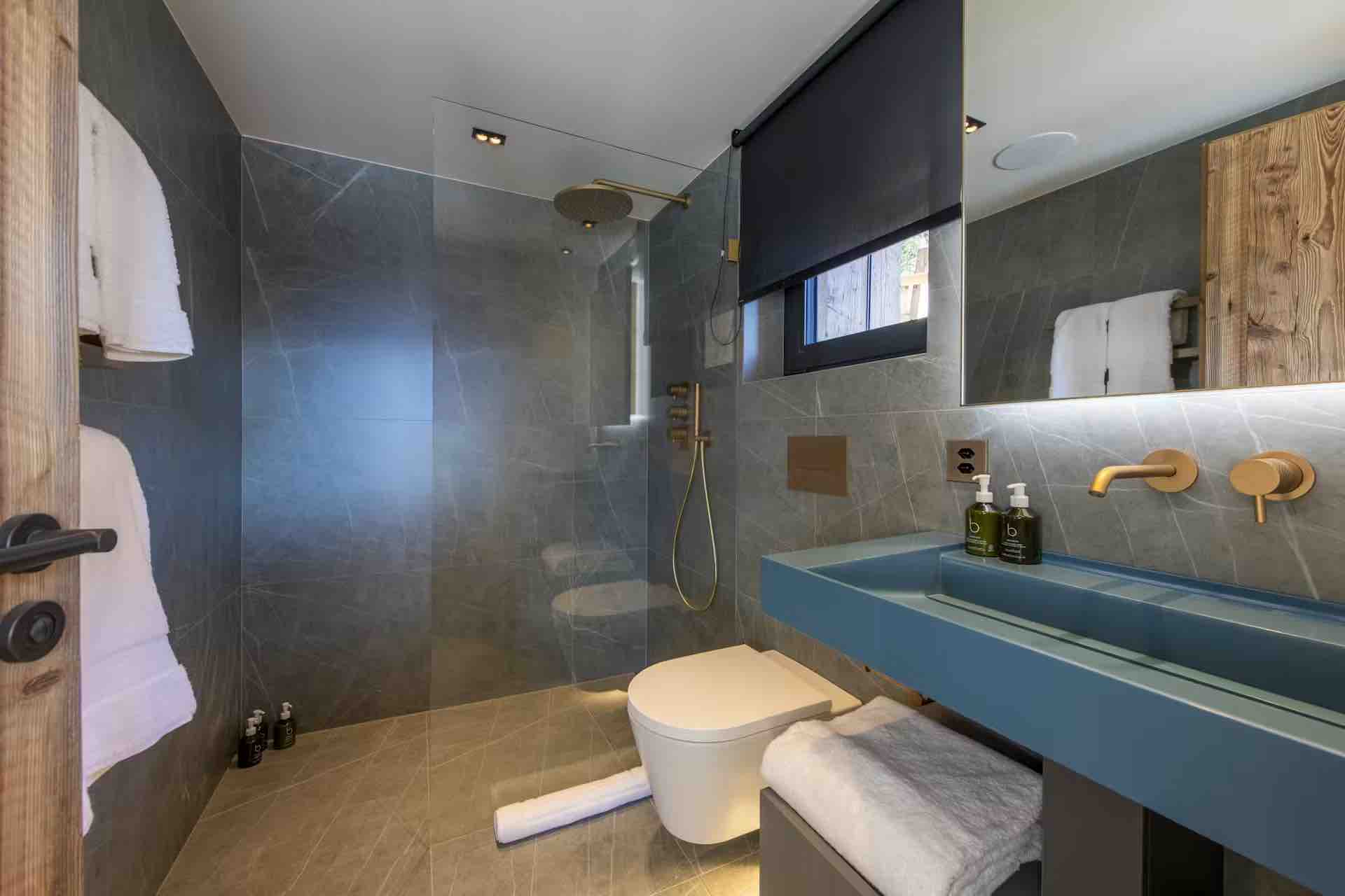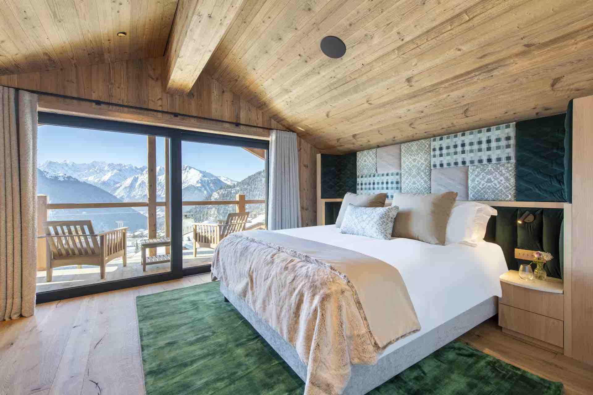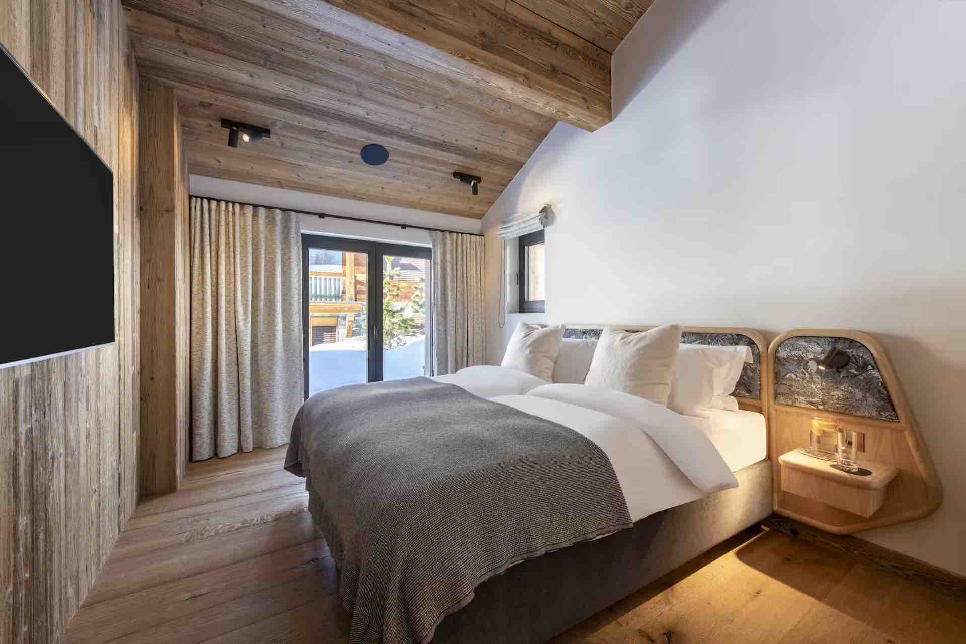 The chalet boasts five elegant bedrooms, accommodating up to 10 guests in style. Each room reflects a chic alpine aesthetic, blending warm tones with contemporary design to create a cozy yet luxurious ambiance. The top floor is home to the premier master suite, which includes a private terrace relaxation area. The remaining four bedrooms, all convertible to either double or twin setups, provide flexibility for different group arrangements. Each bedroom comes with an en-suite bathroom, and most have direct outdoor access for added convenience.