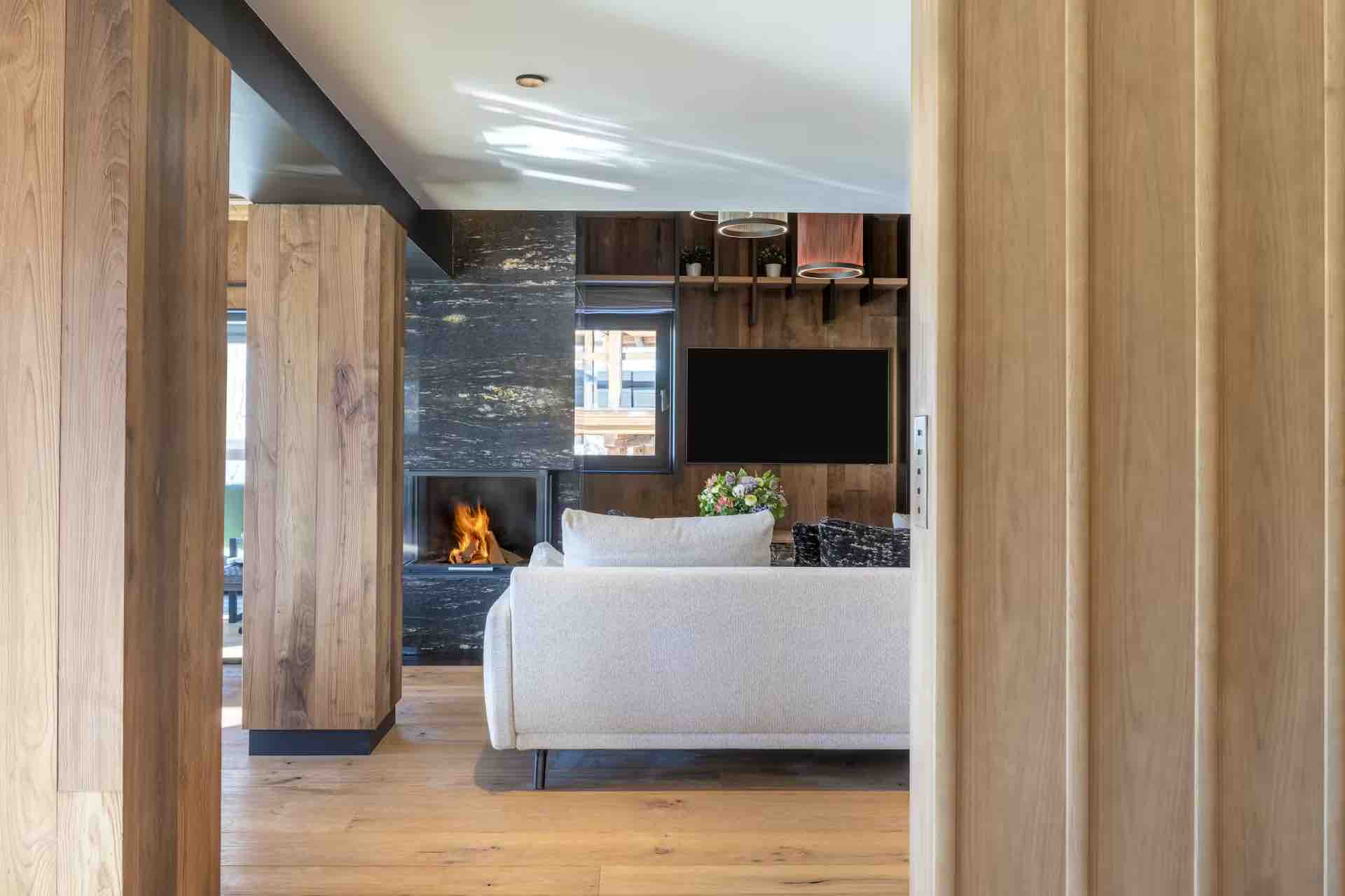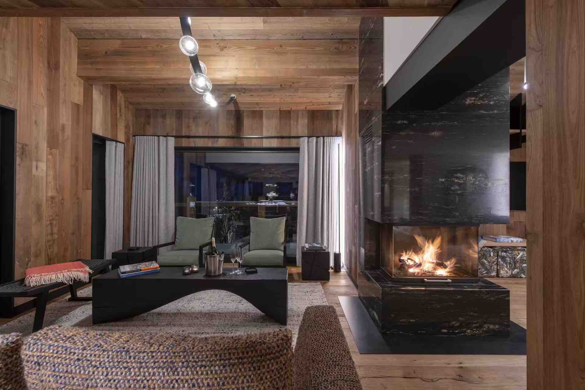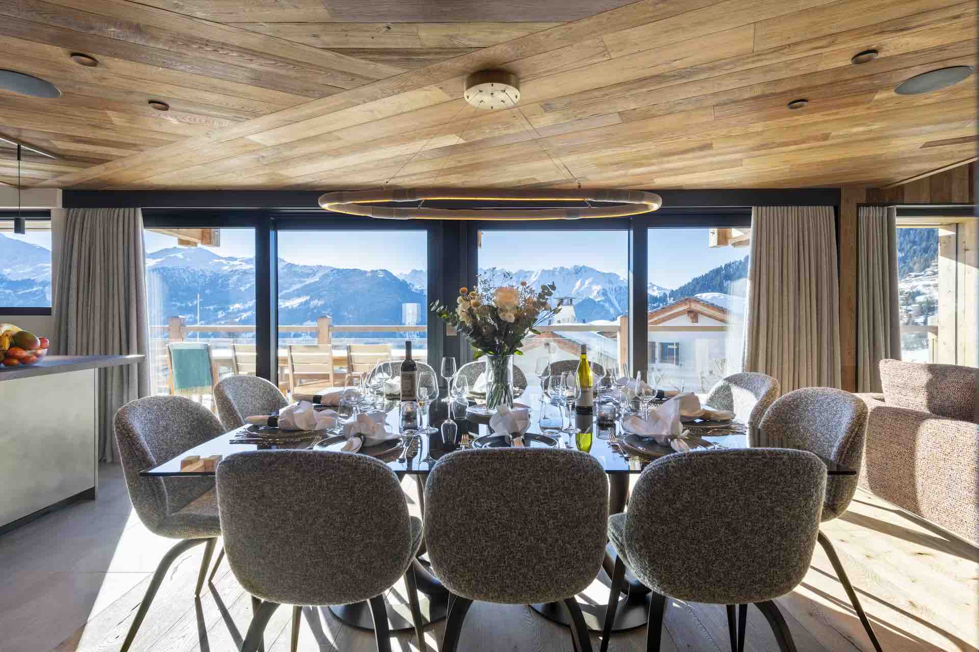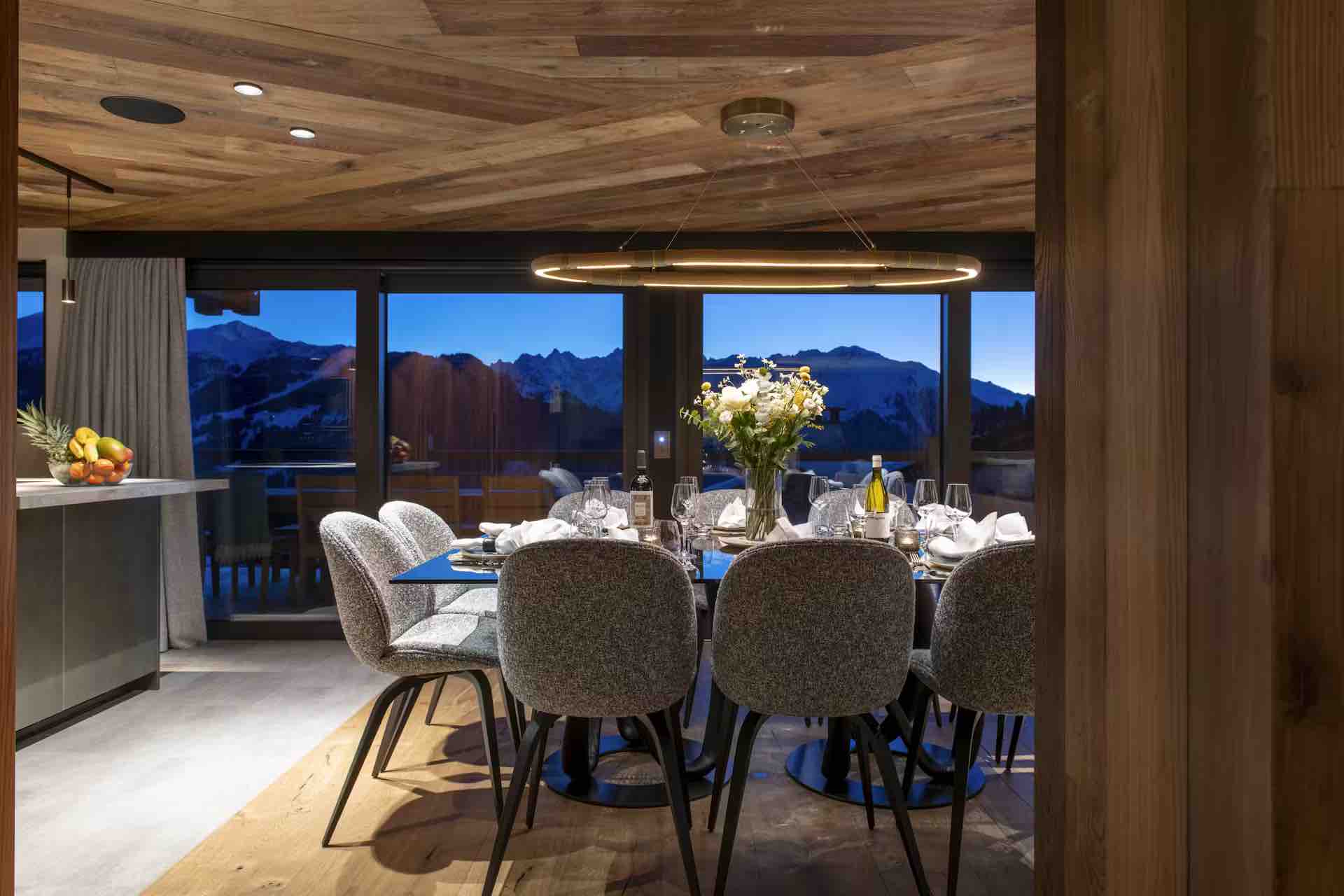 Upon entering Chalet Kitsilano, you’re welcomed into the expansive open-plan living area. A cozy lounge surrounds a sleek, towering fireplace, providing the perfect spot to relax, while a secondary seating area is strategically placed to make the most of the sweeping valley views. The living space flows seamlessly into the kitchen and dining area, which features a bespoke, fully equipped modern kitchen. The dining table is positioned to highlight the panoramic vistas framed by the floor-to-ceiling windows, creating a striking backdrop for meals. Sliding glass doors open onto a terrace, offering a serene setting for unwinding or enjoying a post-dinner Apéritif while soaking in the magnificent views.