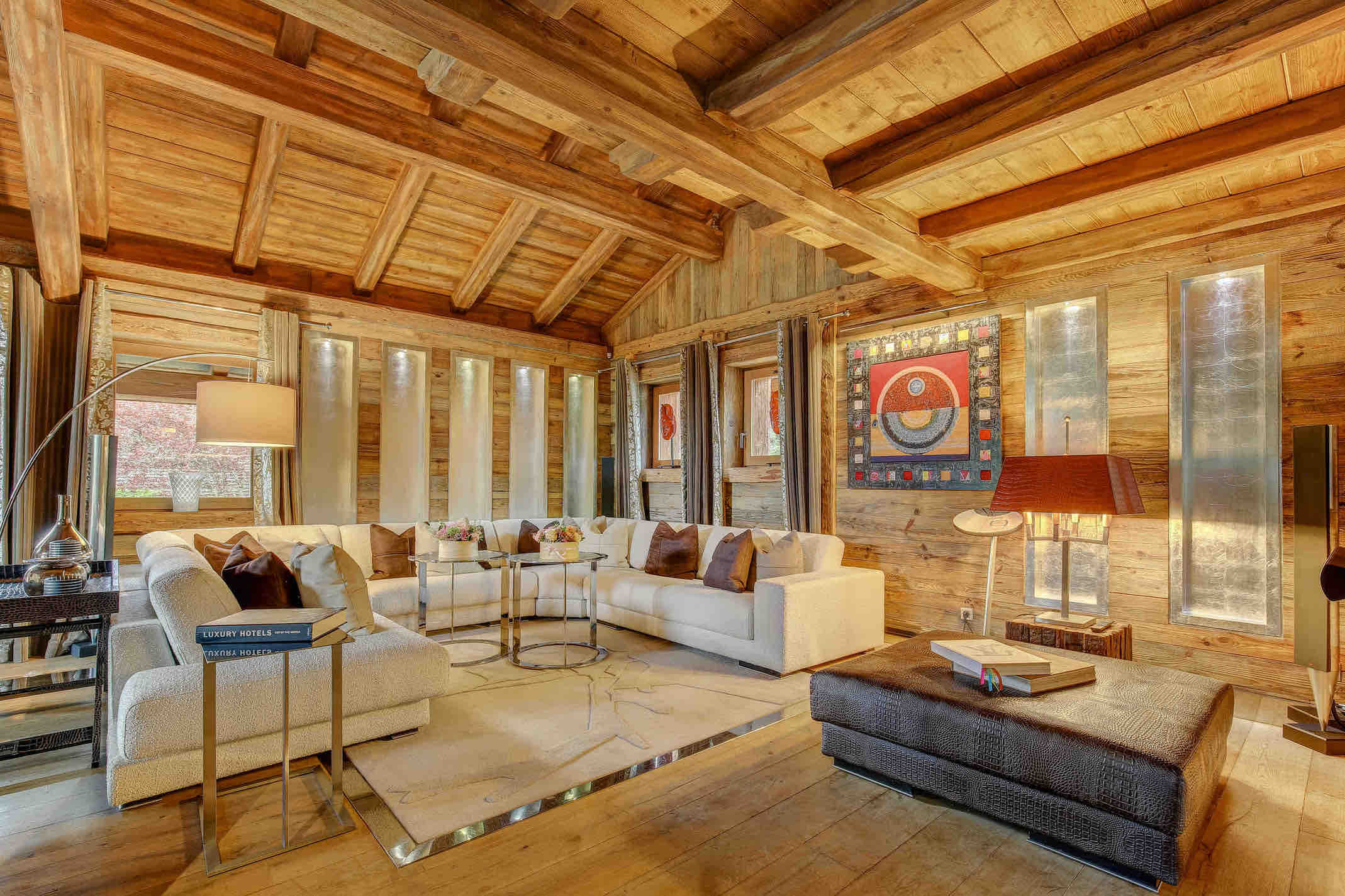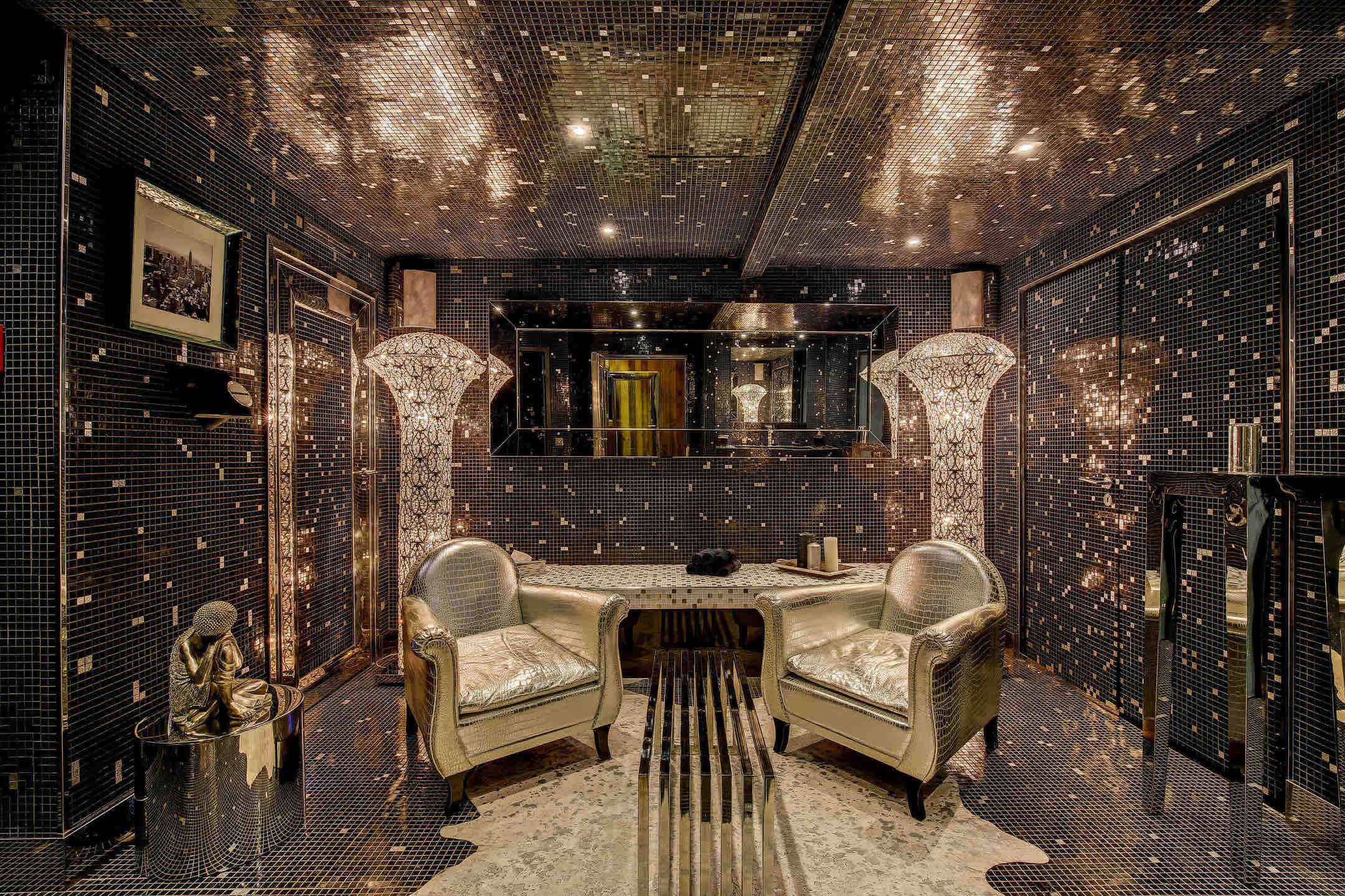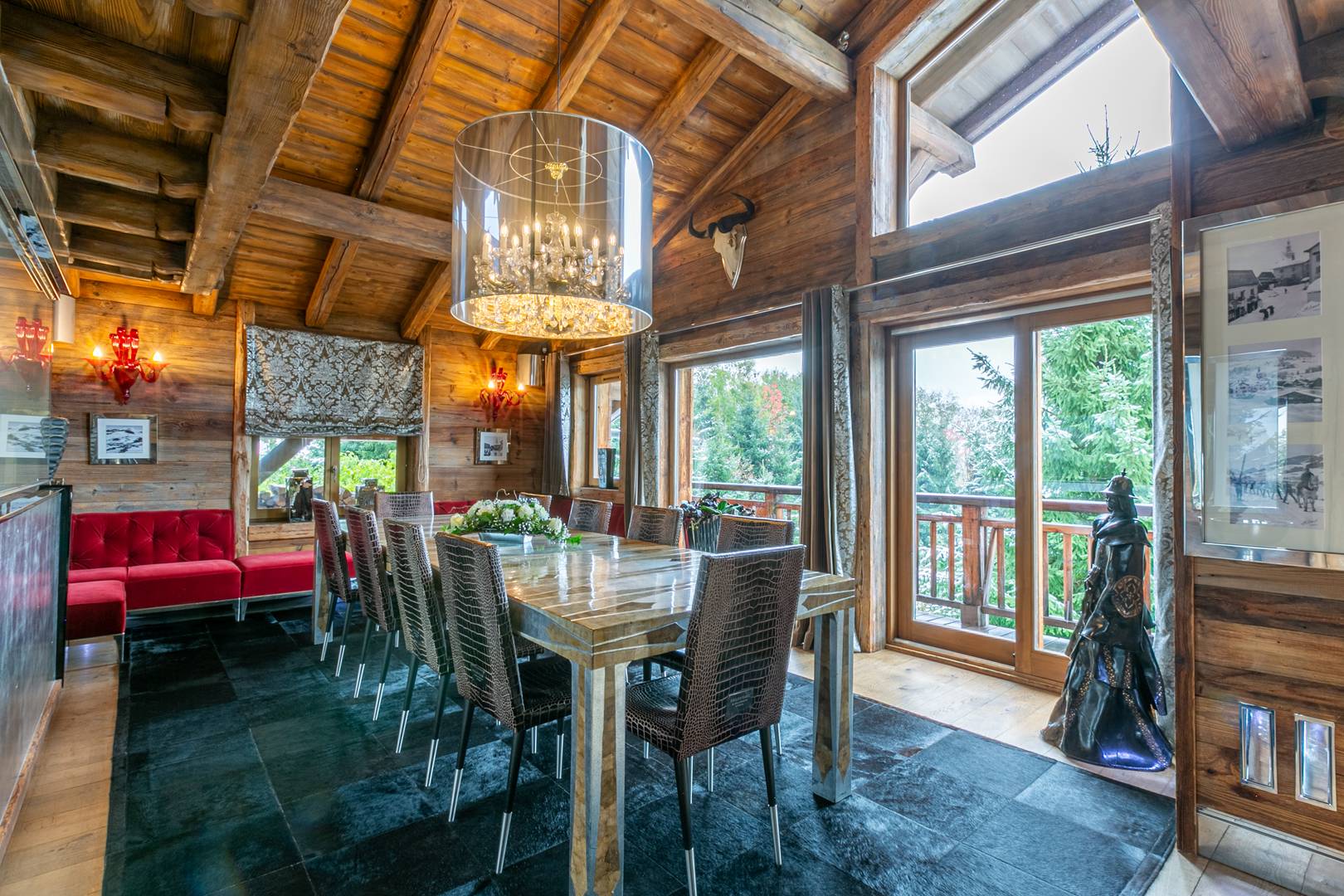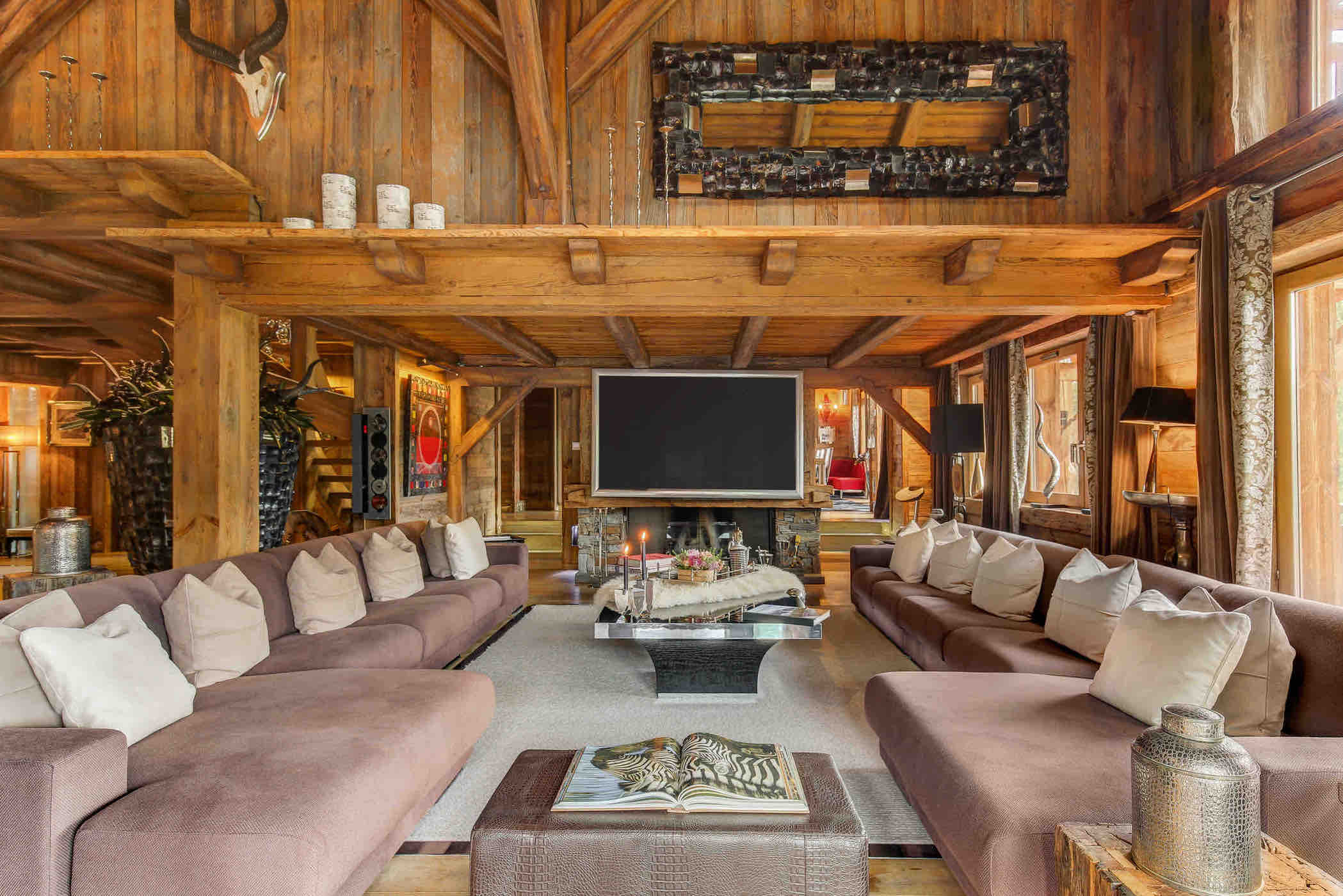 Spread across 1,700 square meters, the chalet blends traditional alpine charm with bold contemporary design, accented throughout with touches of white gold. Designer pieces by Philipp Plein fill the living areas, where fireplaces, floor-to-ceiling windows, and panoramic views create a dramatic yet welcoming atmosphere. The dining room is a statement of refinement, set with Hermès cutlery and plates beneath glittering crystal chandeliers, while a private cinema and bespoke wine cellar invite evenings of intimate leisure.