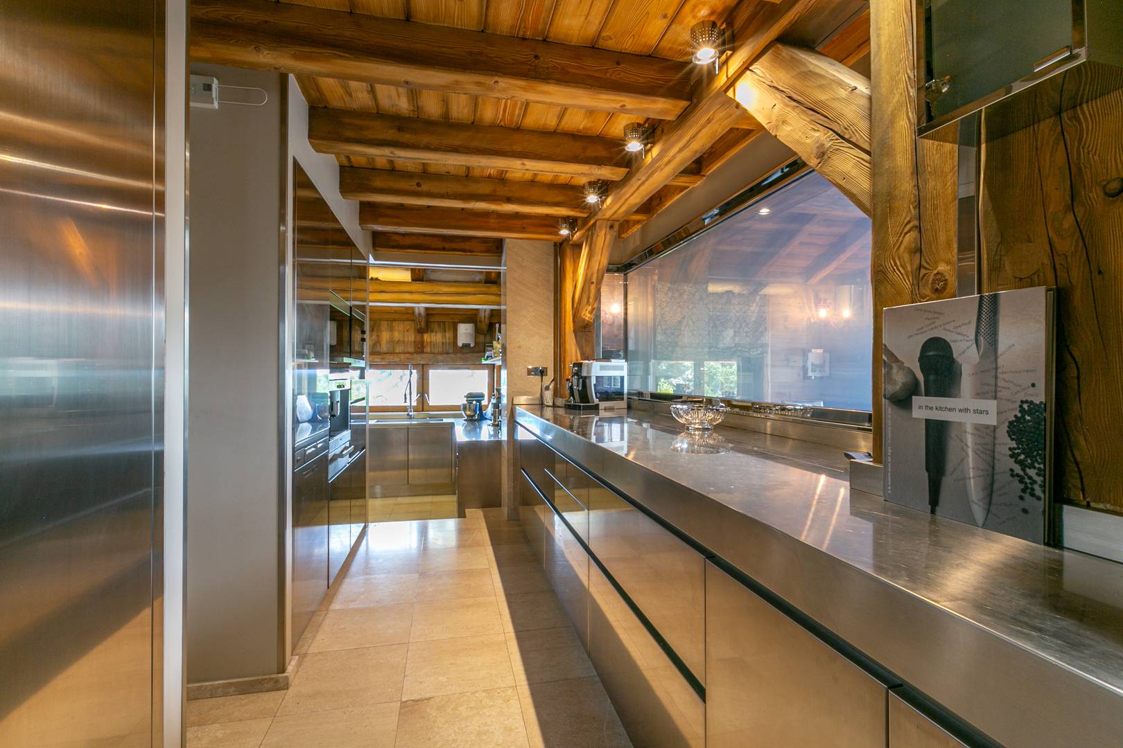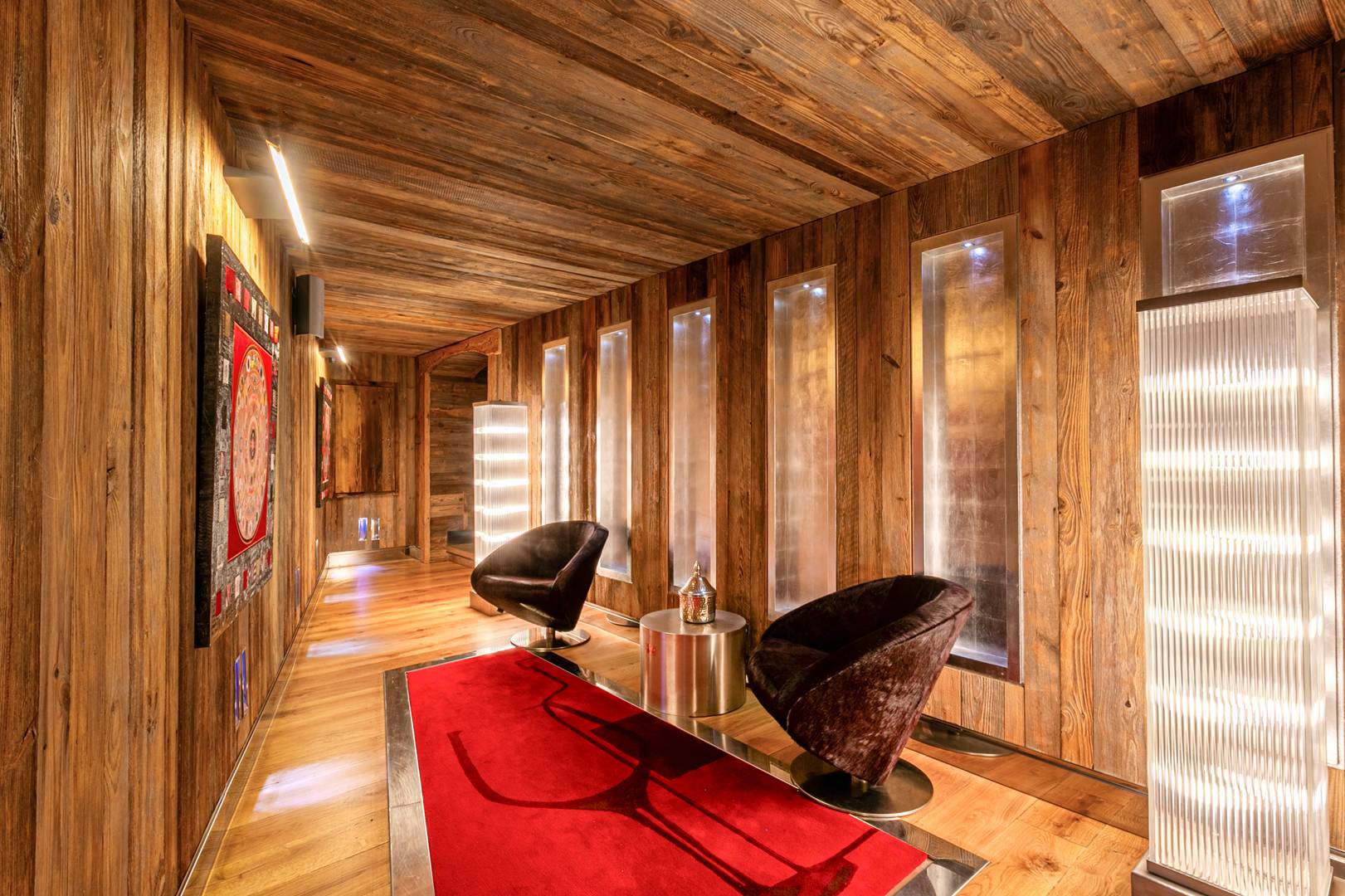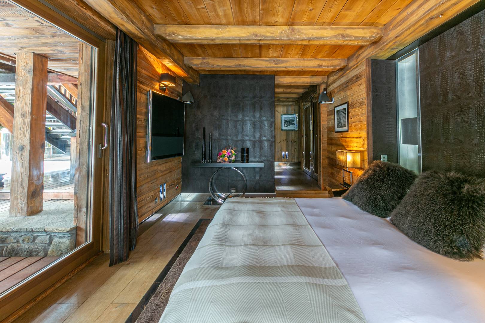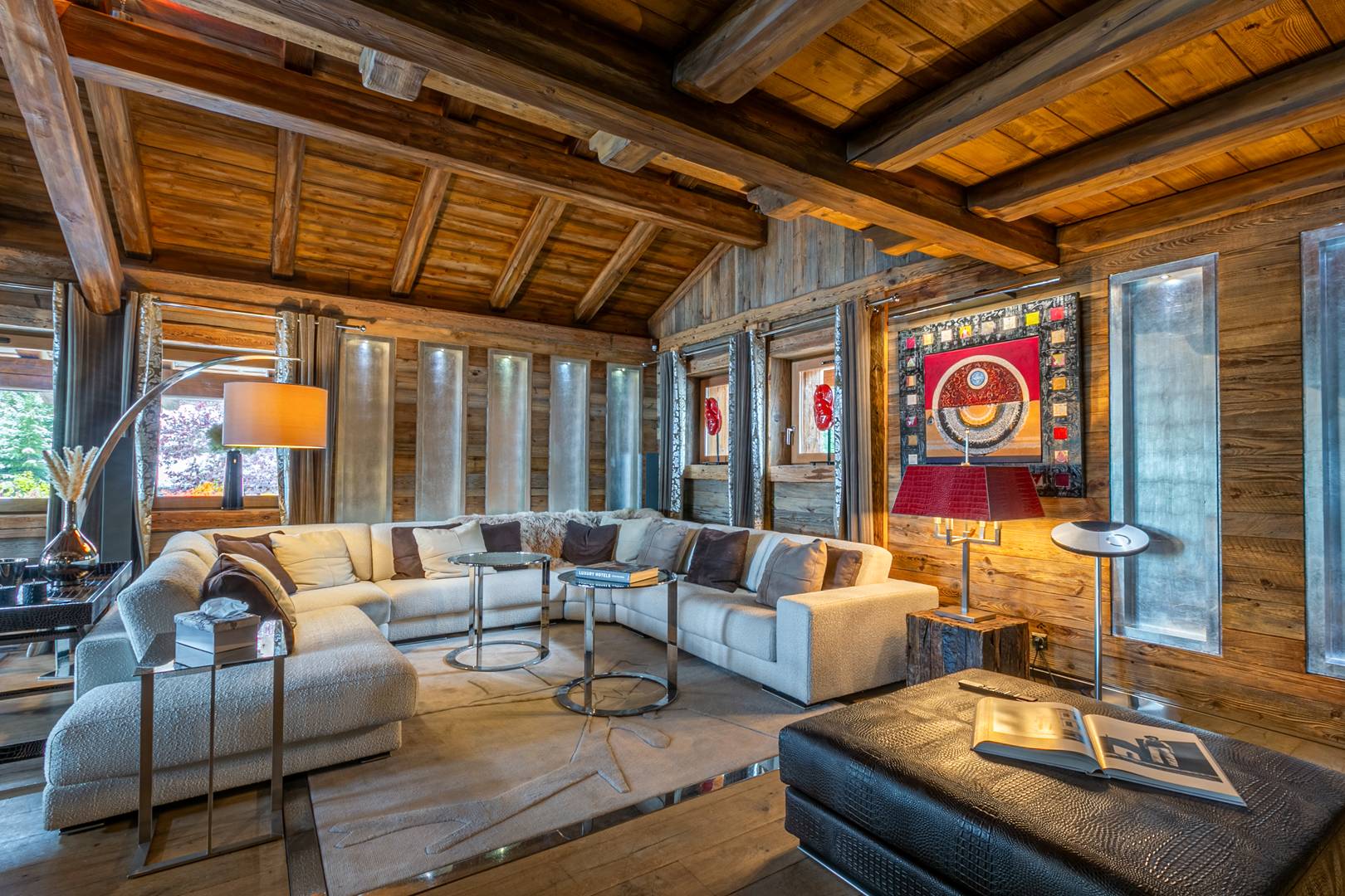 Spread across 1,700 square meters, the chalet blends traditional alpine charm with bold contemporary design, accented throughout with touches of white gold. Designer pieces by Philipp Plein fill the living areas, where fireplaces, floor-to-ceiling windows, and panoramic views create a dramatic yet welcoming atmosphere. The dining room is a statement of refinement, set with Hermès cutlery and plates beneath glittering crystal chandeliers, while a private cinema and bespoke wine cellar invite evenings of intimate leisure.