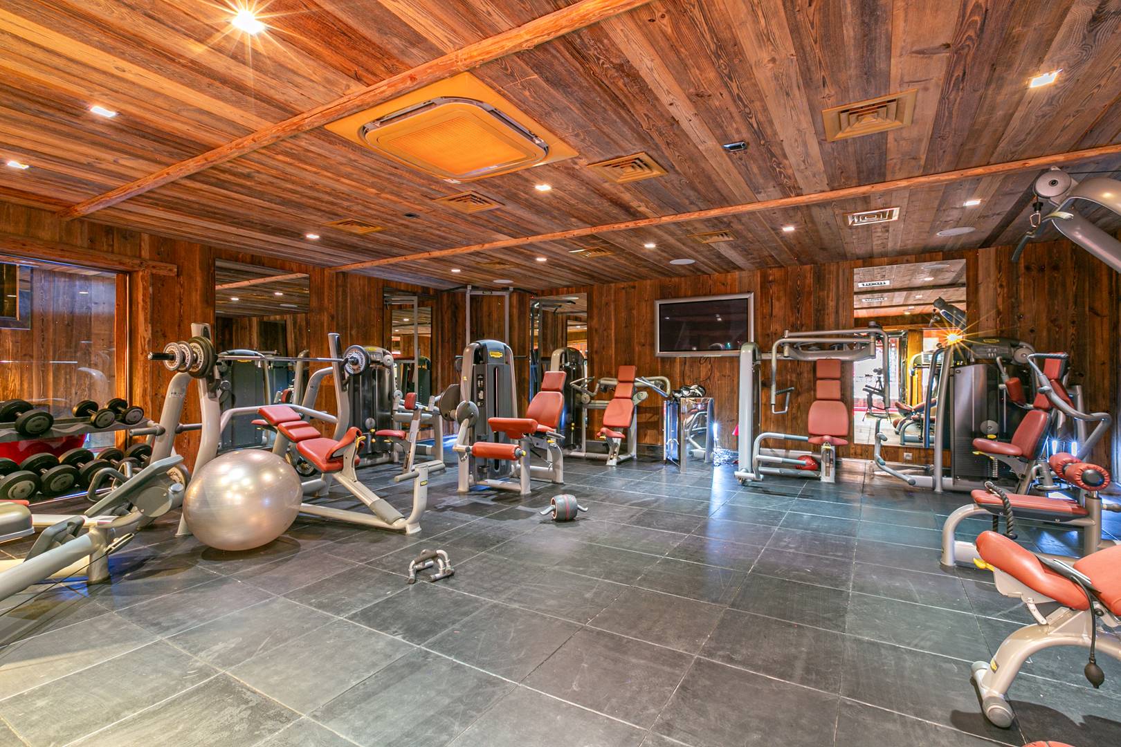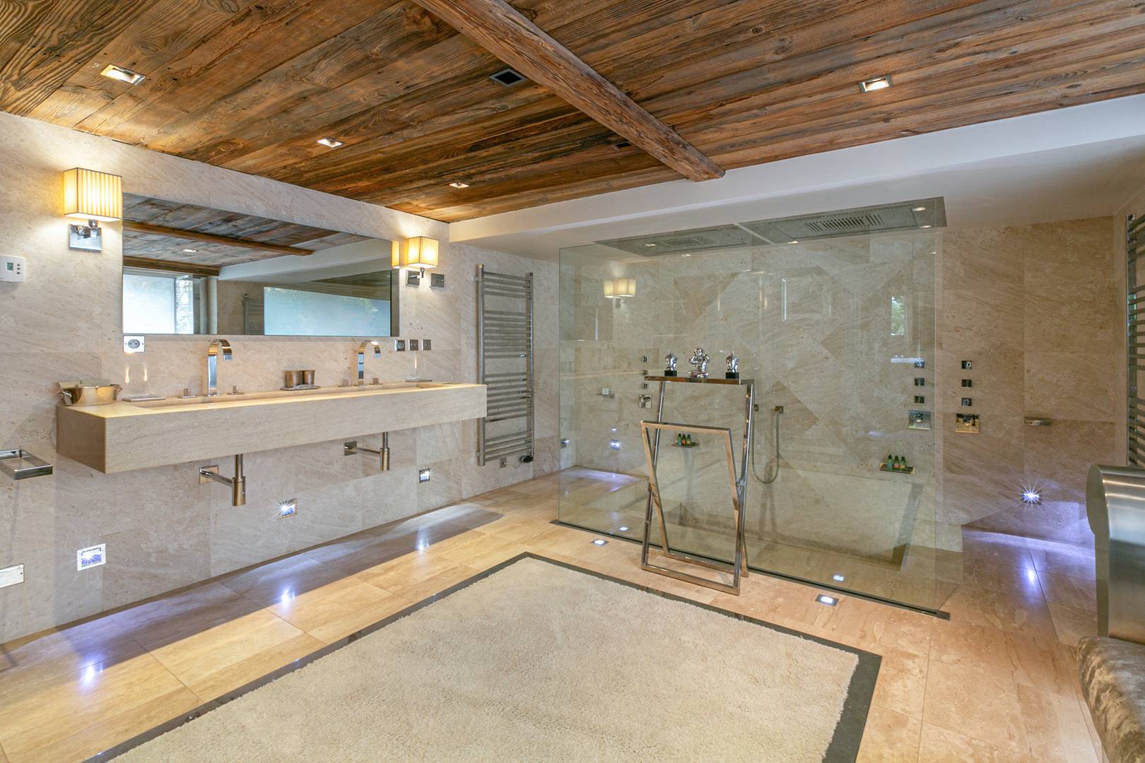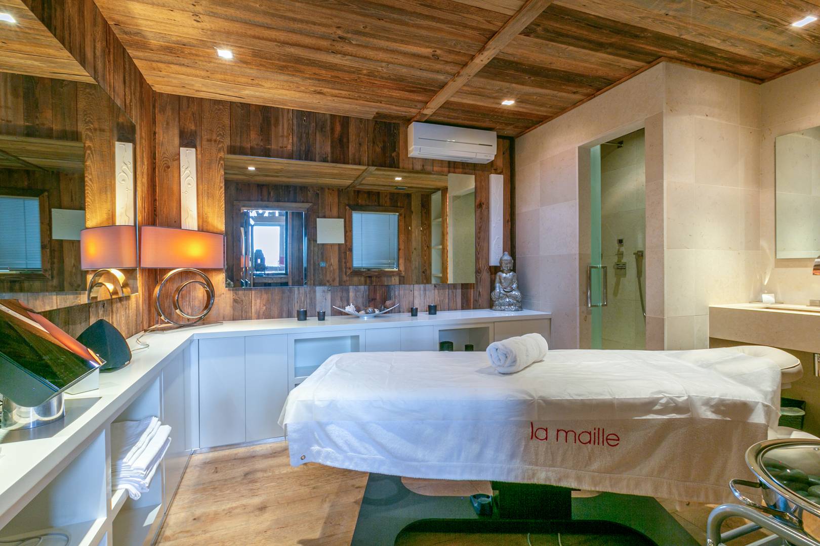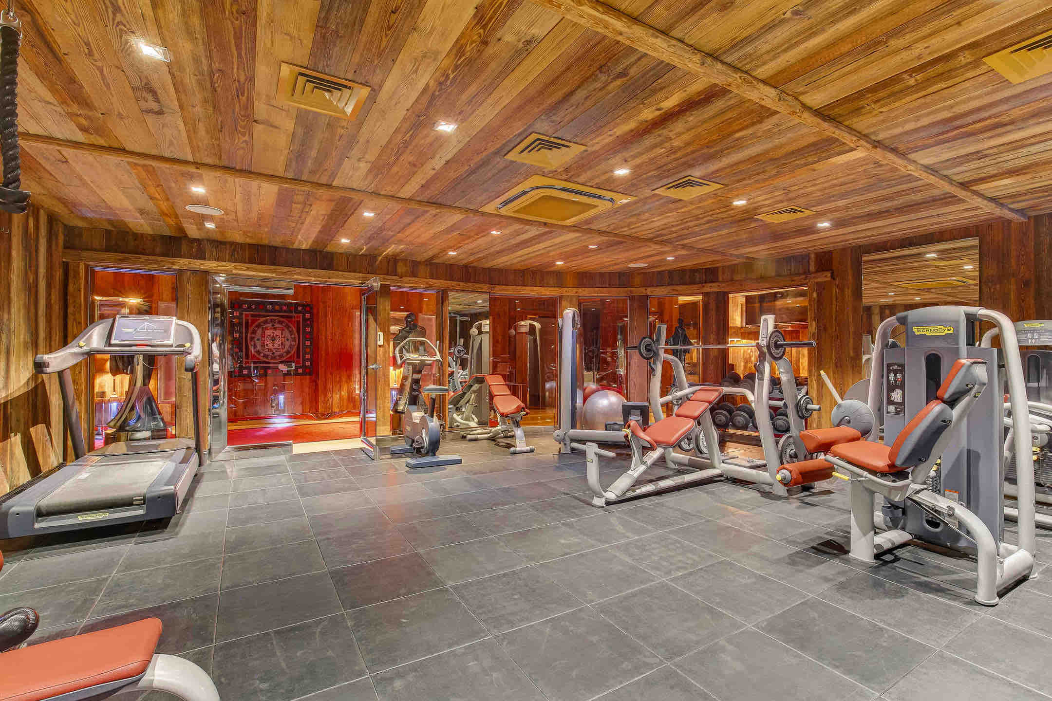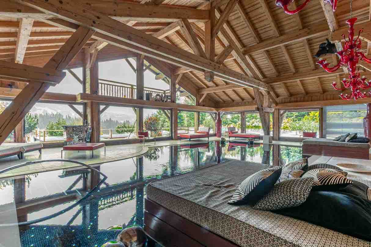 Wellness and leisure are at the heart of the experience. A 12×8 meter indoor heated pool looks out toward Mont Blanc, complemented by a private hammam, a serene spa and massage room, and a fully equipped gym with Technogym machines and mirrored walls.