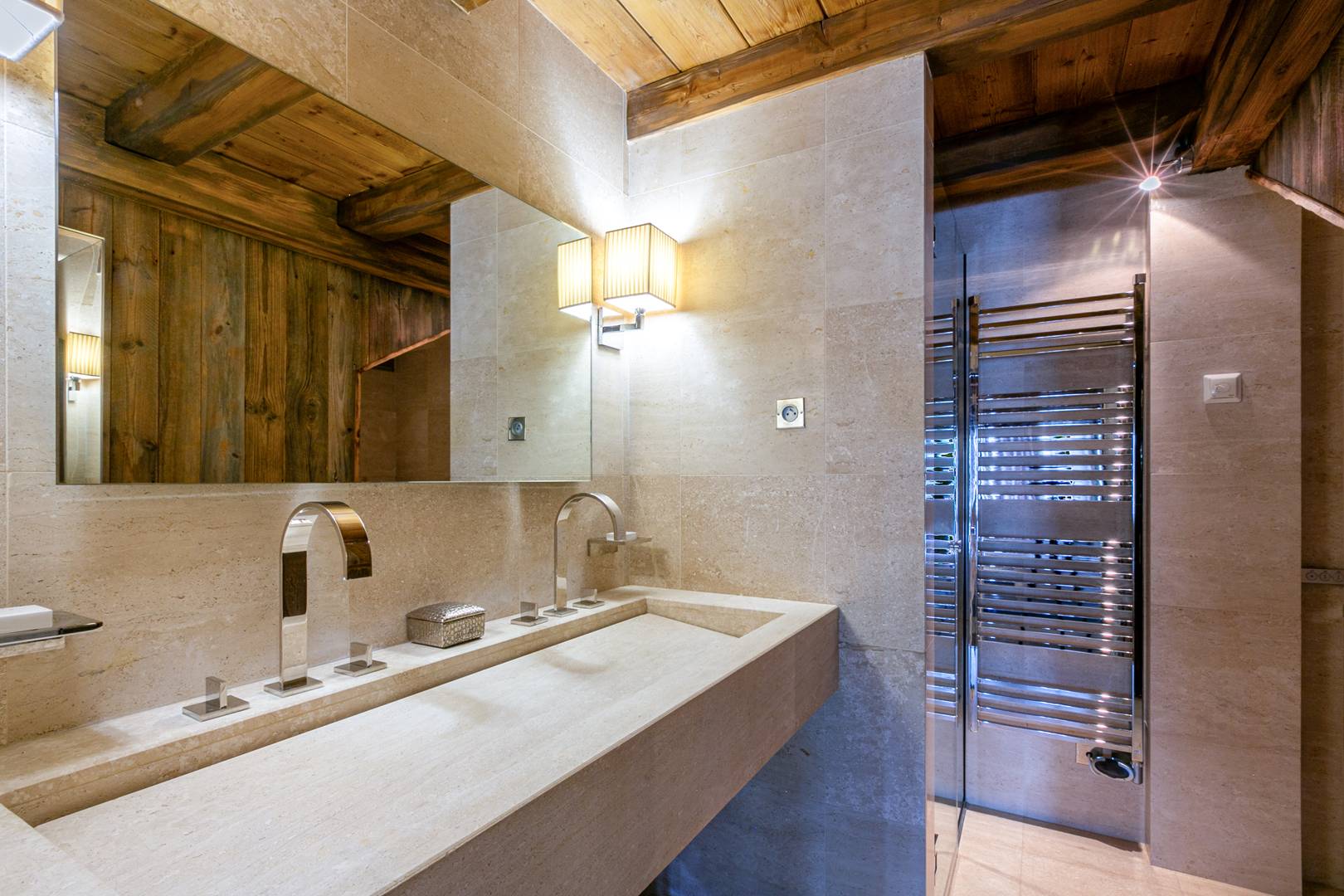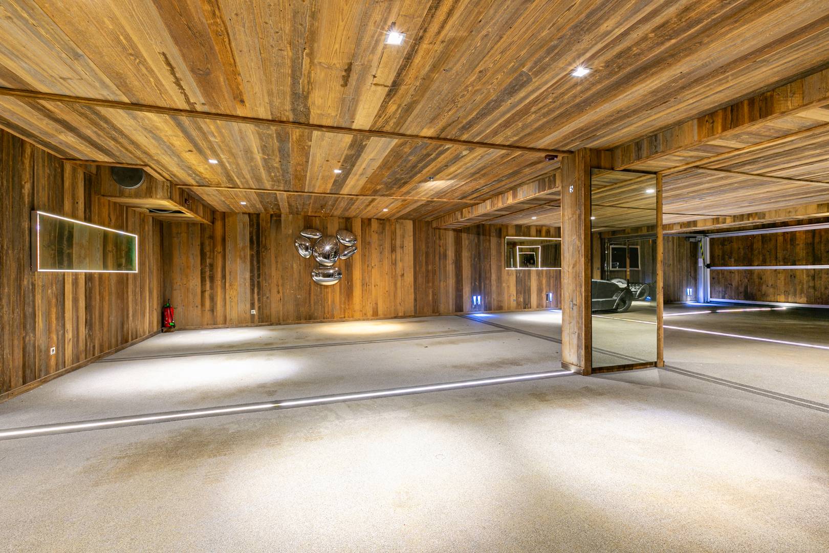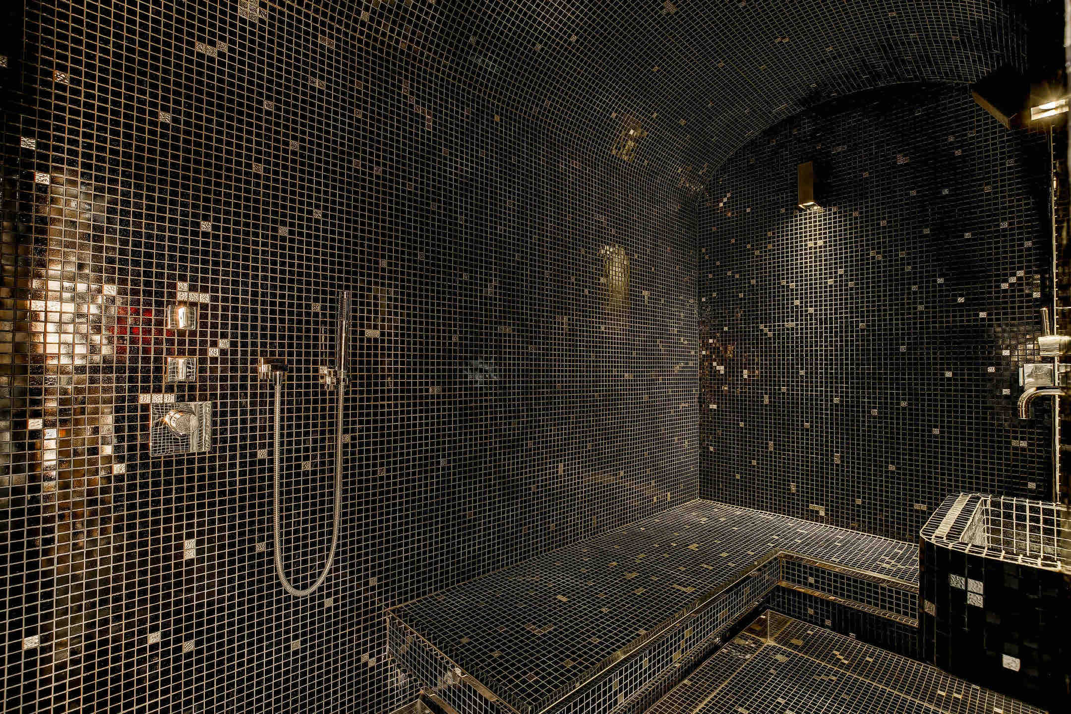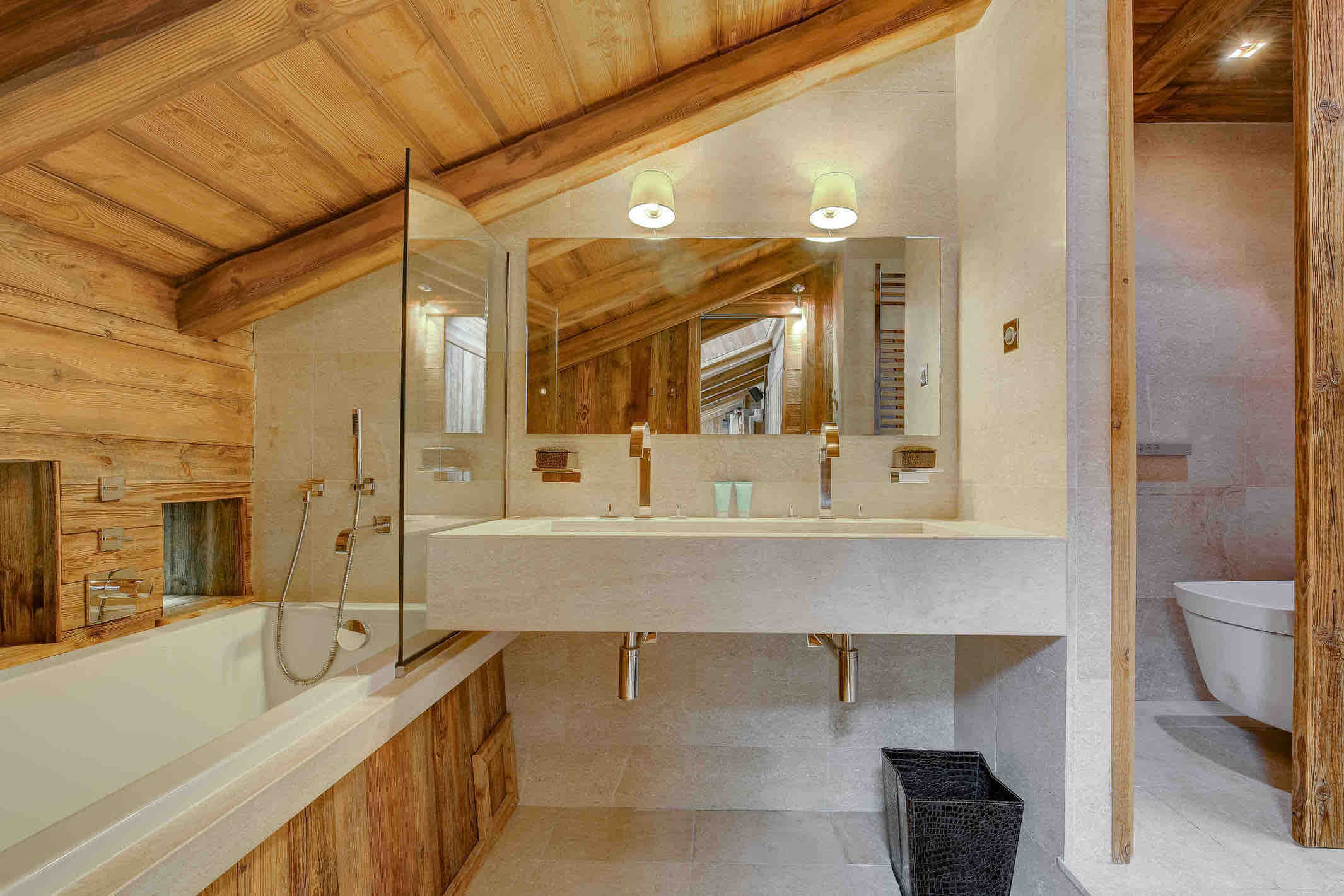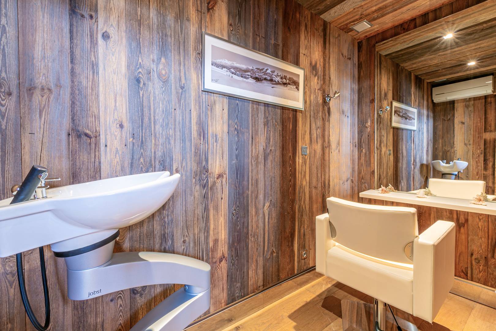 Wellness and leisure are at the heart of the experience. A 12×8 meter indoor heated pool looks out toward Mont Blanc, complemented by a private hammam, a serene spa and massage room, and a fully equipped gym with Technogym machines and mirrored walls.