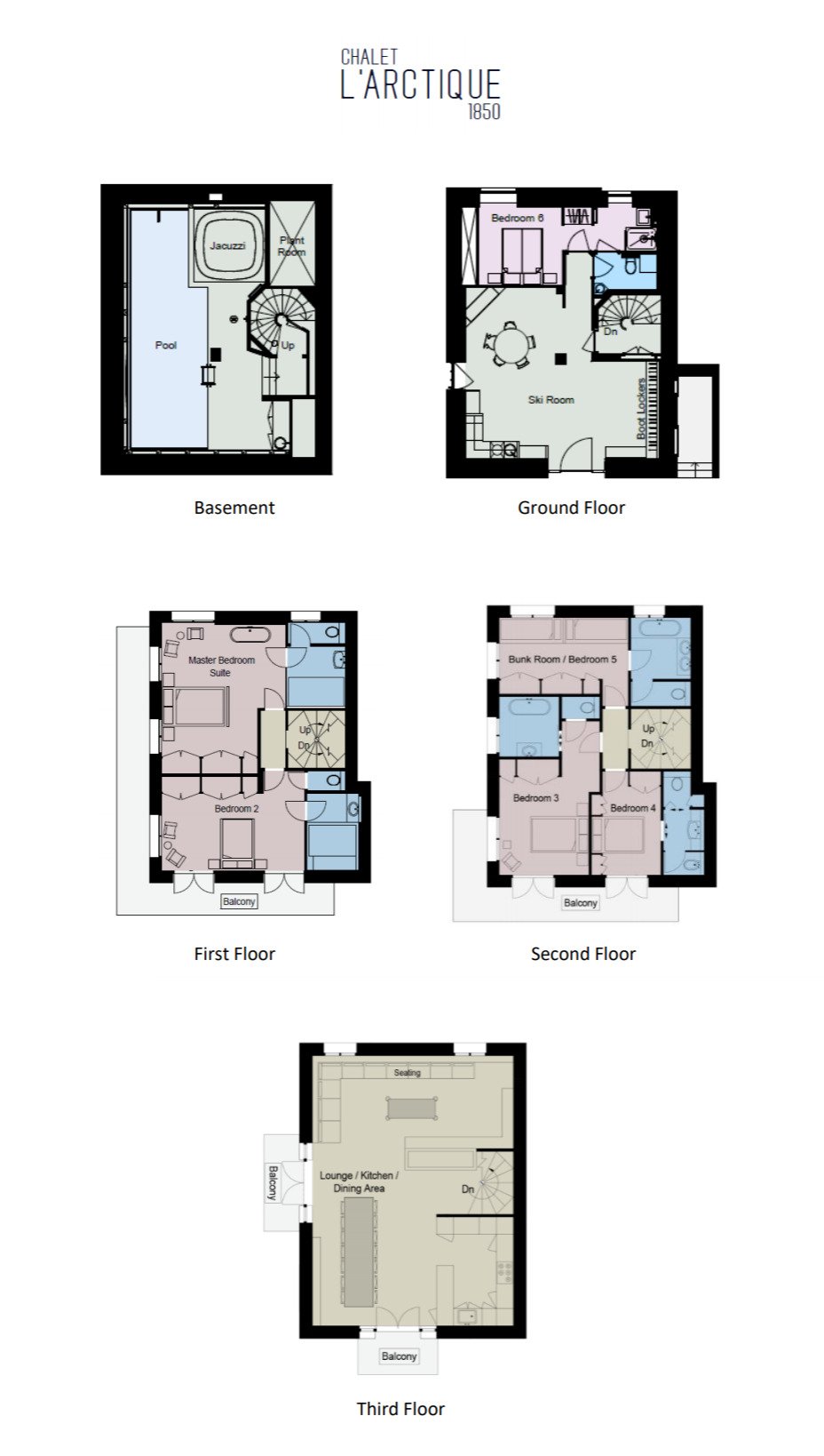 Spanning 330m² across five levels, Chalet l’Arctique is a stunning example of refined mountain living. Rich wood finishes and plush furnishings define its sophisticated alpine aesthetic, especially apparent in the expansive top-floor living spaces. This open-plan area includes a cosy lounge with a suspended open fireplace, an elegant dining area with a solid walnut table, and a sleek, fully equipped kitchen. Two balconies on this level offer panoramic views of the resort and the surrounding peaks, letting in fresh mountain air and natural light.