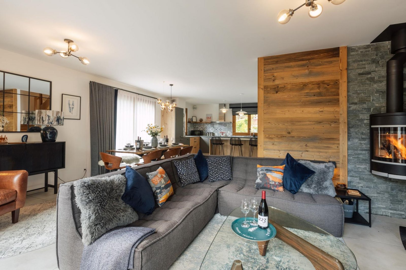 Step inside to discover light-filled, open-plan living spaces framed by stunning mountain views. Natural wood, soft textures, and carefully curated interiors create a warm and inviting atmosphere—perfect for relaxing after a day on the slopes. The spacious lounge, complete with a wood-burning fireplace, flows seamlessly into a well-equipped kitchen and dining area designed for sociable evenings and shared meals.