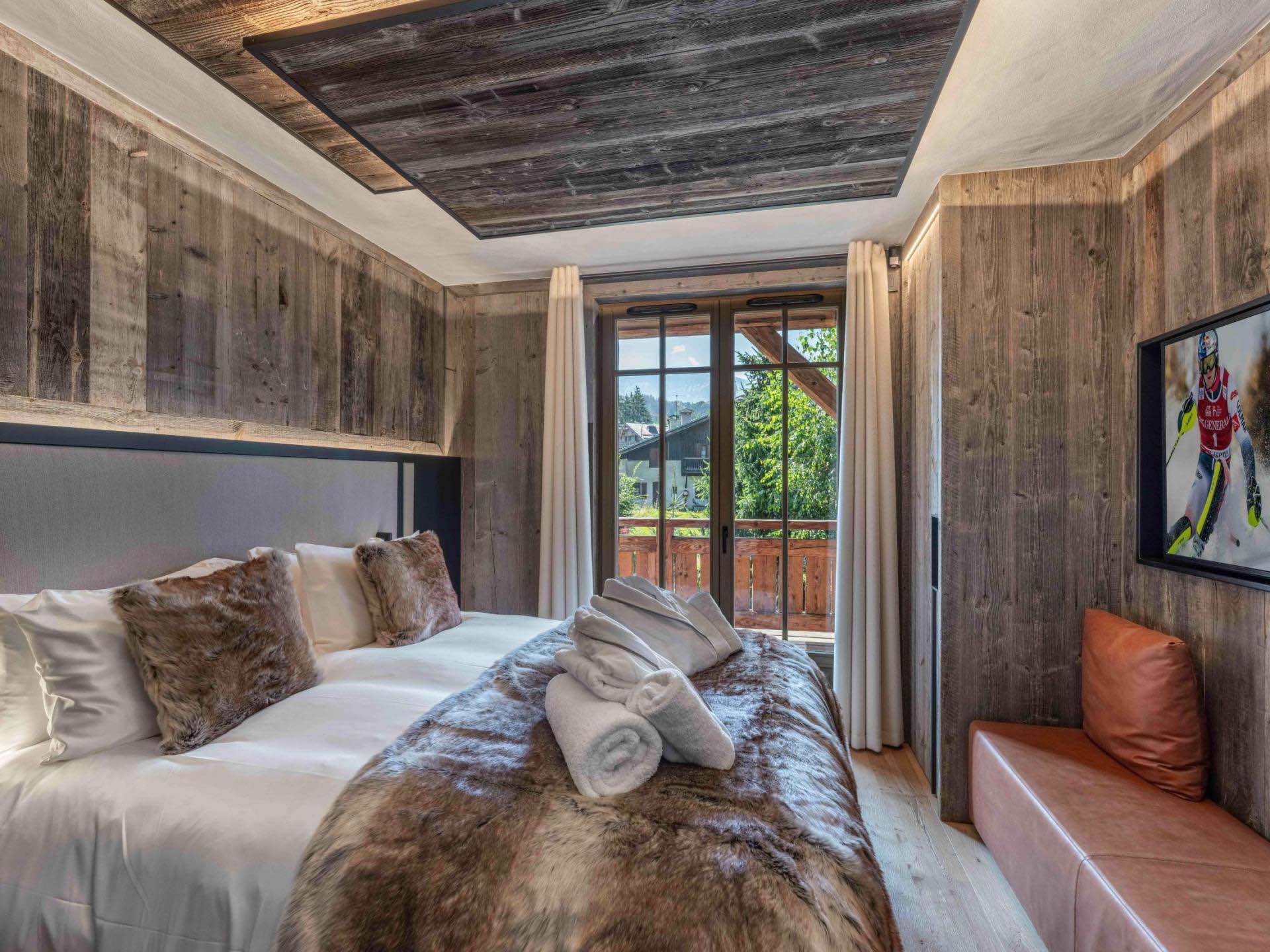 Designed to accommodate up to 15 guests, the chalet features seven beautifully appointed bedrooms, including a master suite and a dedicated children’s bunk room, all with en-suite bathrooms. The interiors combine aged wood, refined fabrics, and modern finishes, creating a warm yet sophisticated atmosphere throughout.