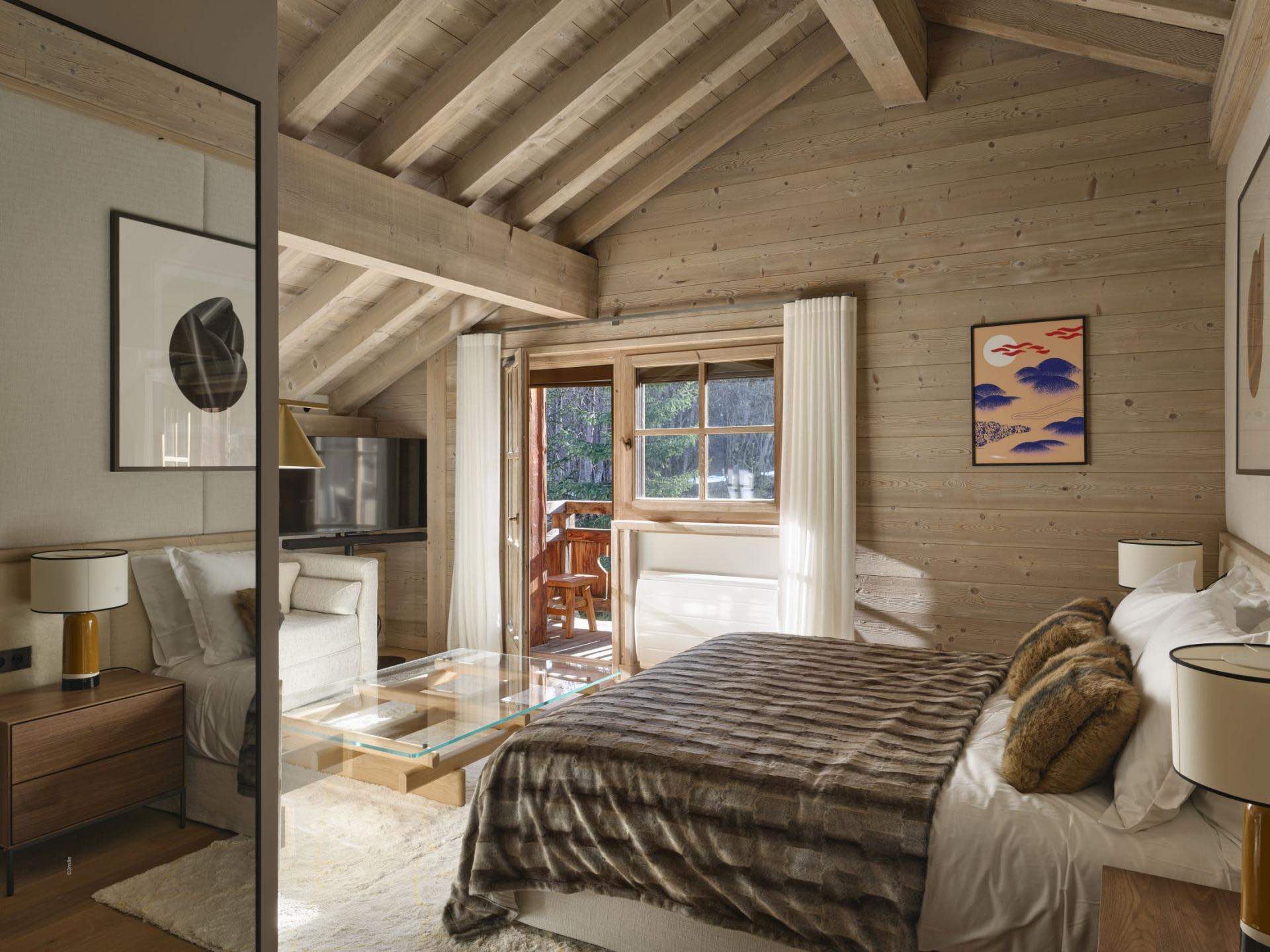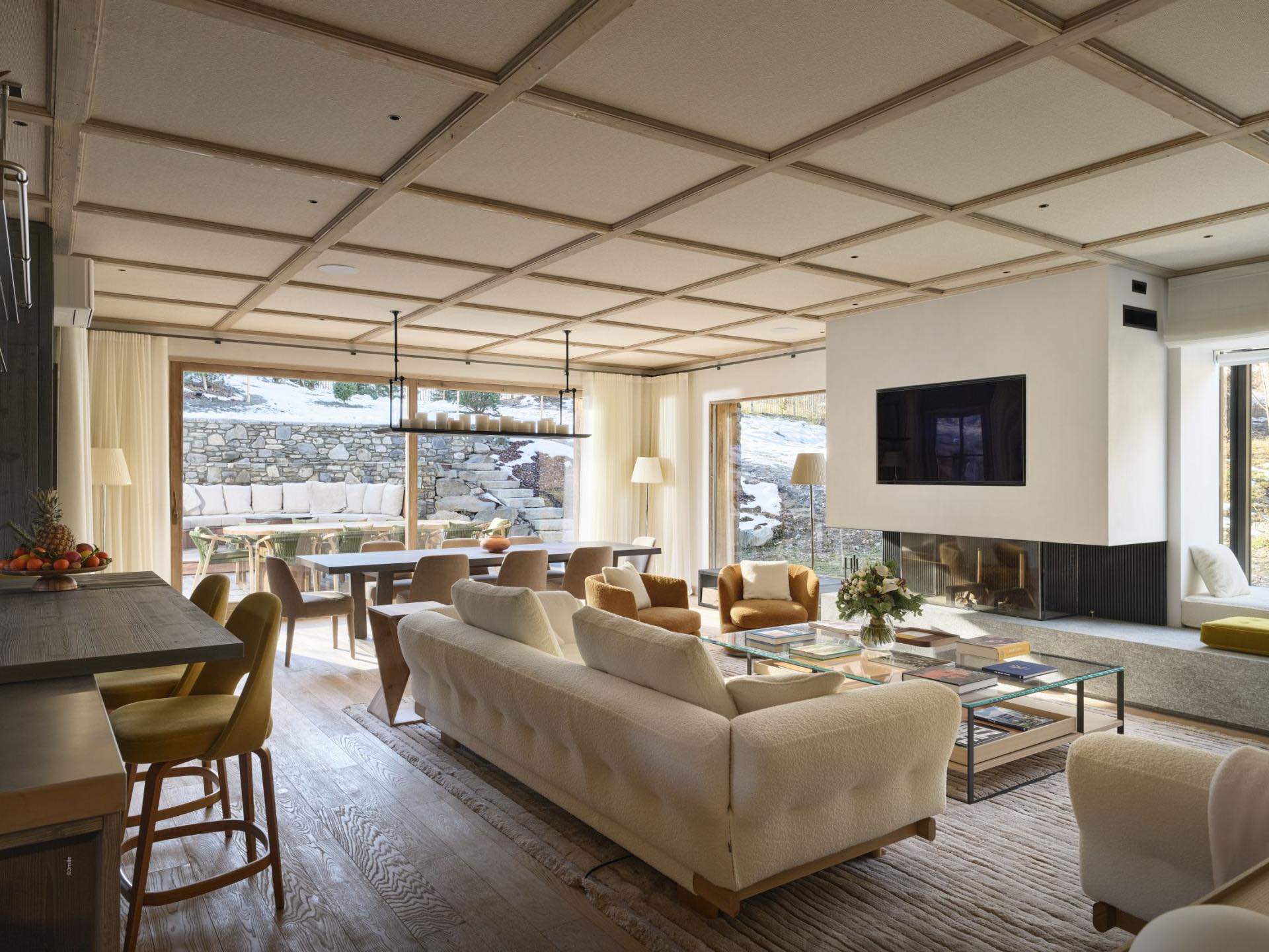 The heart of the chalet is its open-plan living space, where a welcoming lounge with a cozy fireplace flows seamlessly into the spacious dining area and fully equipped modern kitchen, a perfect setting for shared meals, stories and après-ski relaxation.