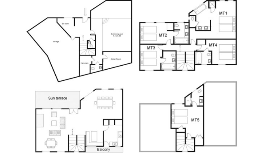 The ground floor houses the chalet’s serene wellness area, featuring a generous heated indoor pool with a jet stream counter current. Vaulted, arched windows and rustic beams add to the charm of this tranquil space, which also includes a Hammam—perfect for easing tired muscles after a day on the slopes.