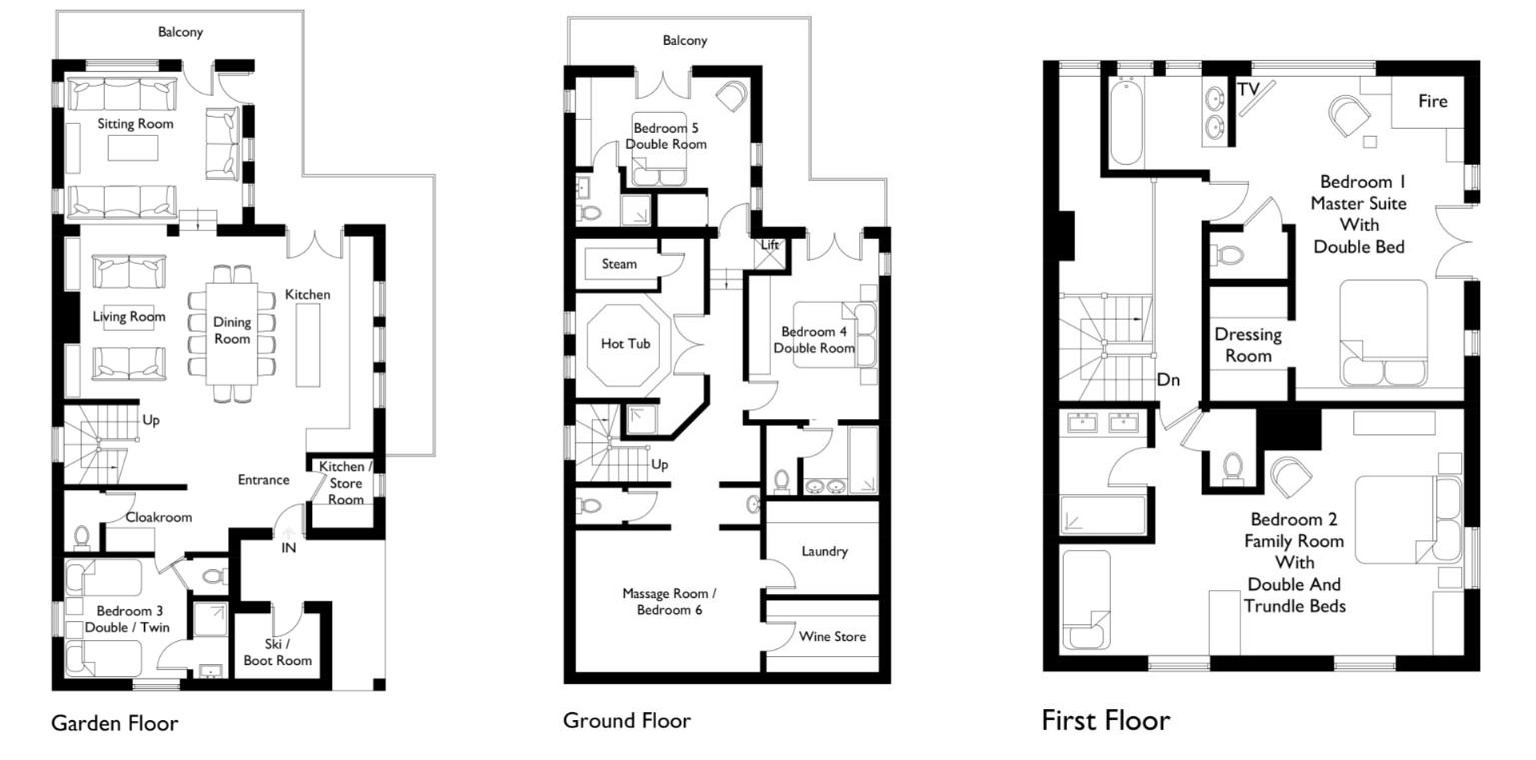 Accommodation is spread across five beautifully appointed en-suite bedrooms, all finished in a charming log-cabin style with plush linens, robes and generous bathrooms. The top floor hosts the master suite, complete with its own fireplace, private balcony and striking mountain views, along with a family room featuring additional trundle beds for children. The remaining bedrooms are equally comfortable and versatile, with one able to convert into a twin. Practical features such as a ski room with boot warmers, laundry facilities and parking complete this outstanding catered chalet, making Chalet Montana an exceptional base for a luxury ski holiday in Courchevel.