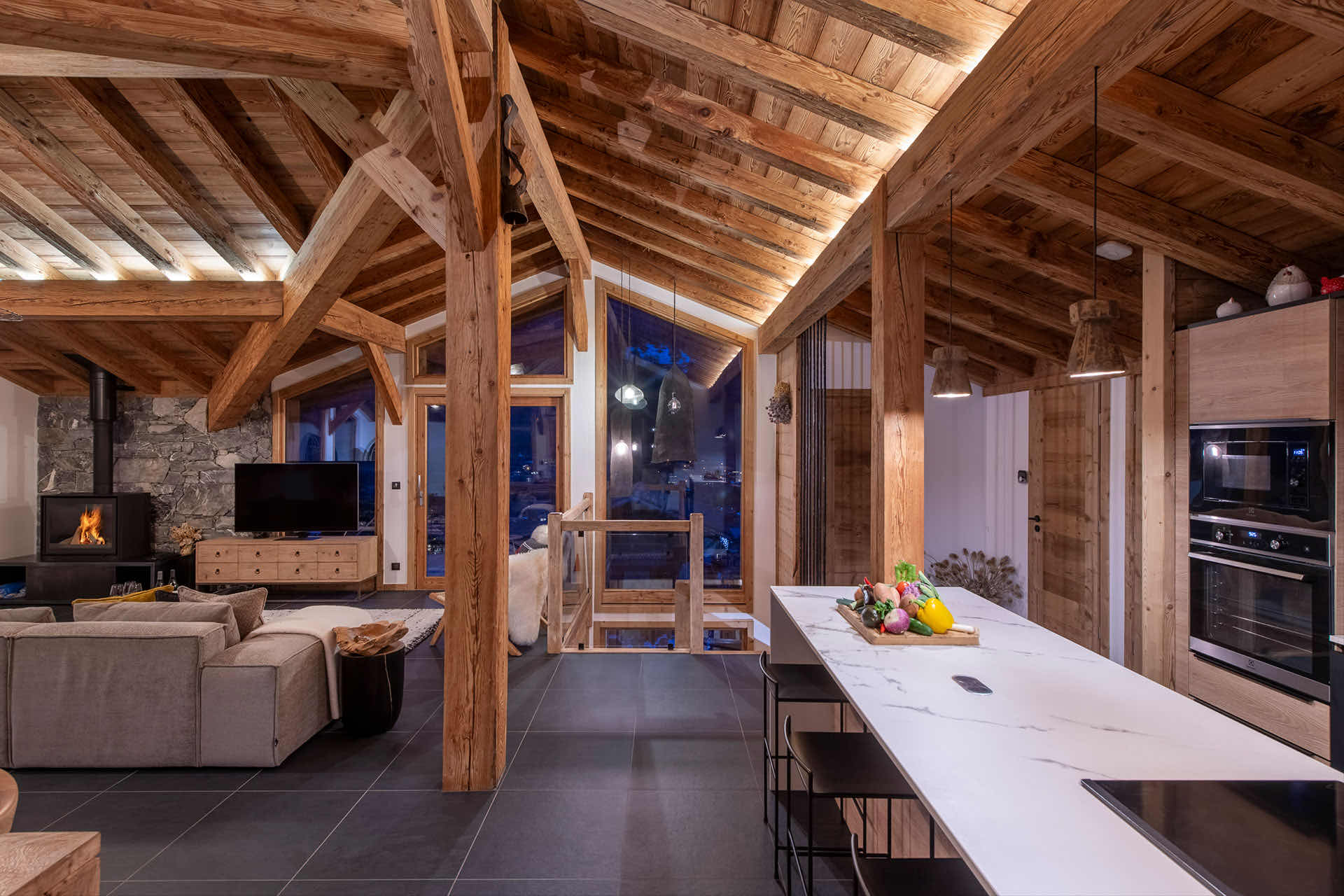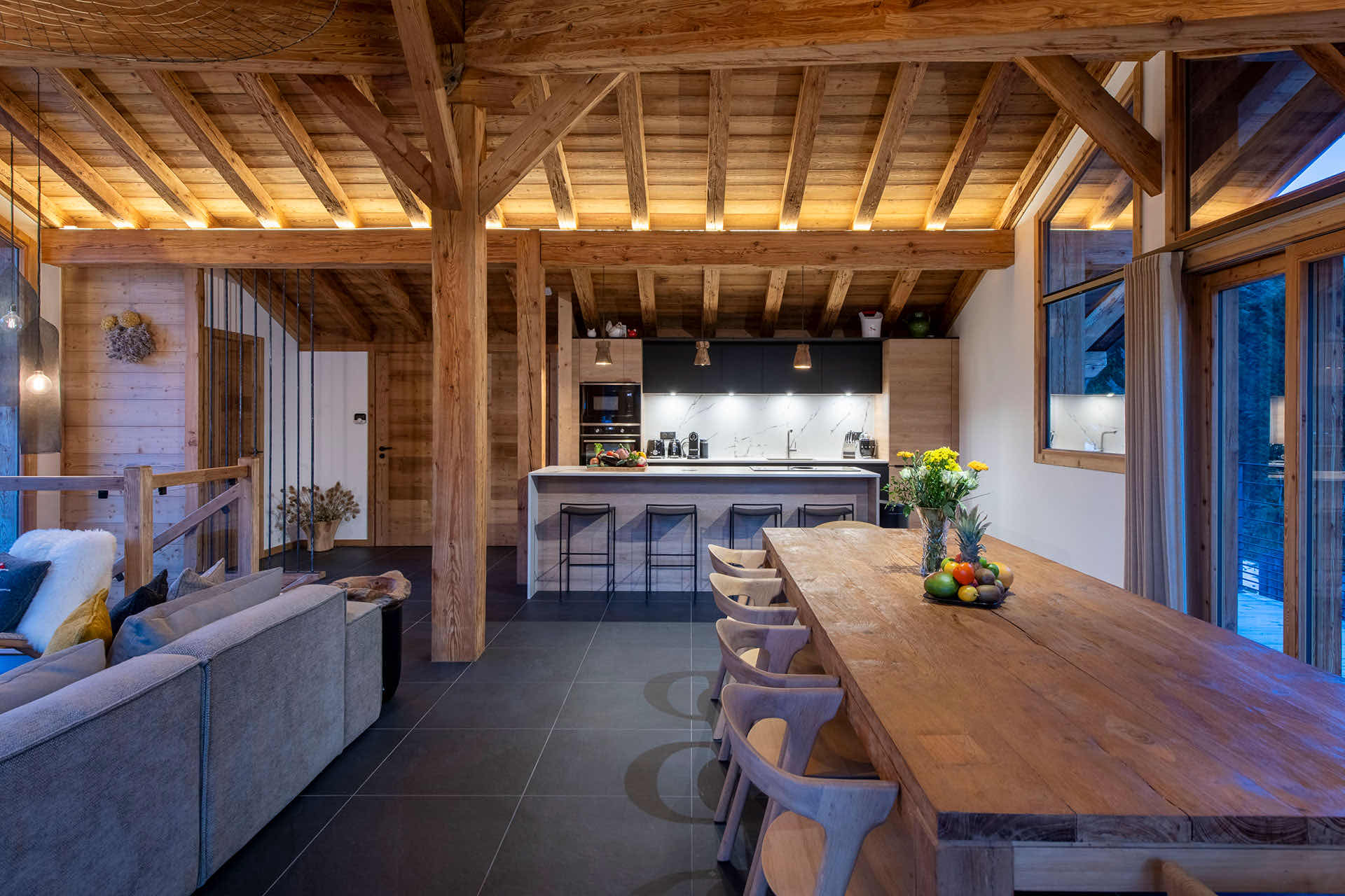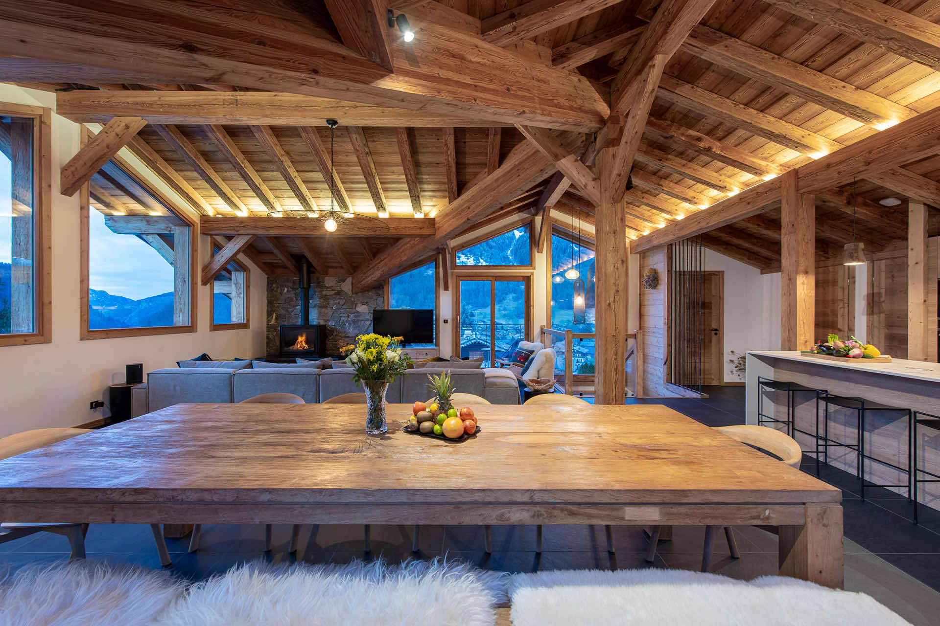 Spanning three floors and 240m², the chalet’s top level is dedicated to a stunning open-plan living space beneath an impressive vaulted wooden ceiling. Here, a generous lounge invites you to sink into plush modern sofas beside a cosy log-burner fireplace, framed by a striking stone accent wall that blends alpine charm with contemporary style. The dining table comfortably seats all 10 guests, with a mix of hand-crafted chairs and a bench draped in soft, fluffy throws. At the far end, a sleek, fully equipped kitchen features an elegant island breakfast bar, ideal for casual dining or après-ski nibbles. Floor-to-ceiling picture windows flood the space with natural light and frame breathtaking panoramas, best enjoyed from the balcony overlooking the valley.