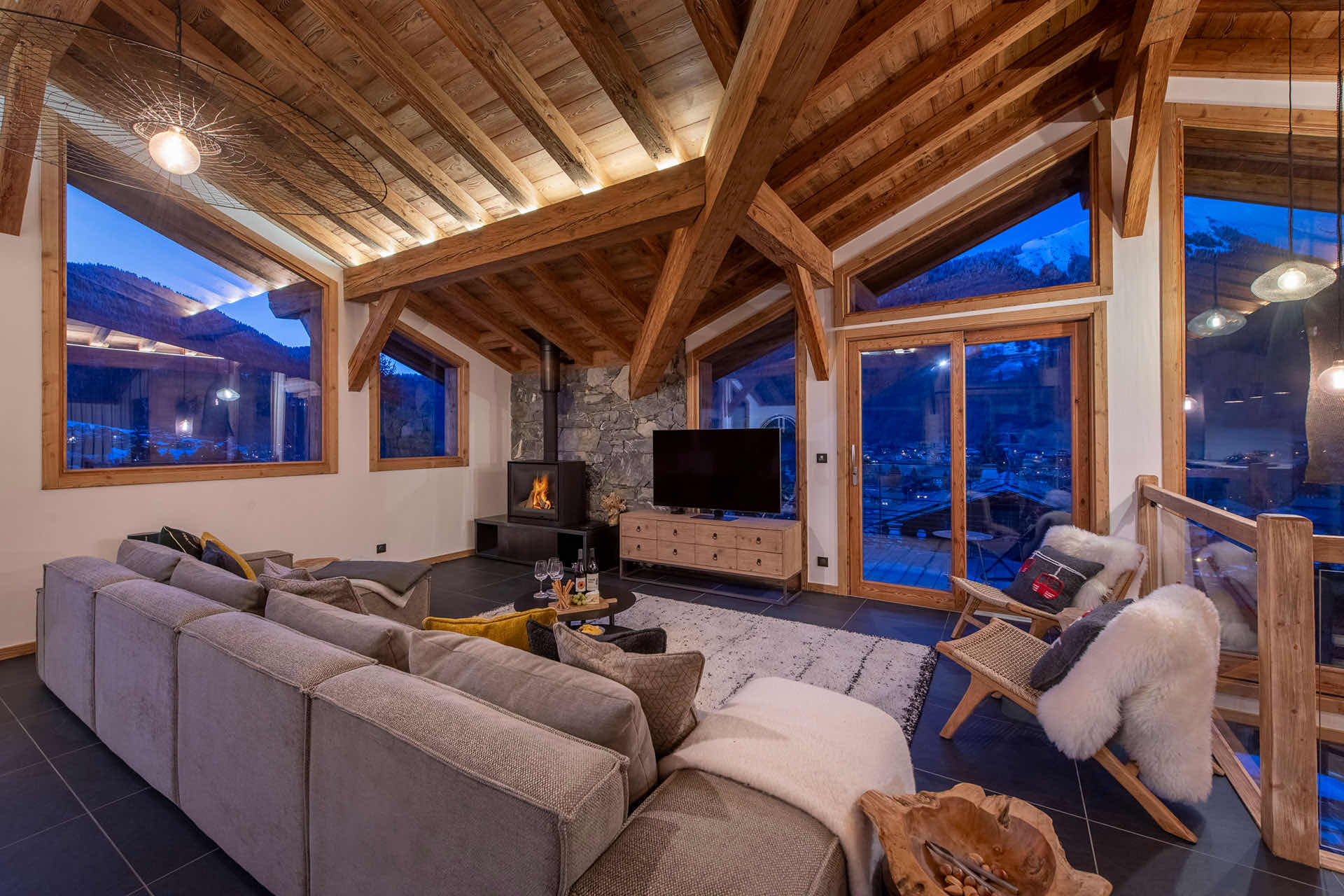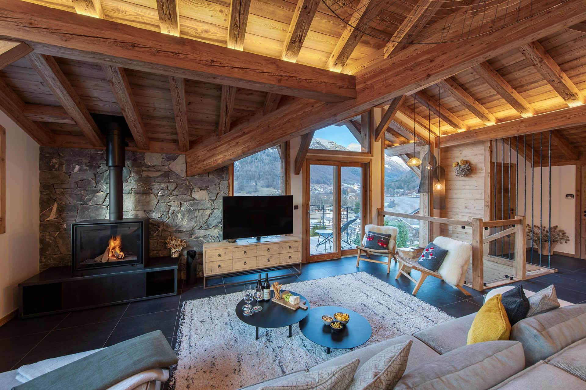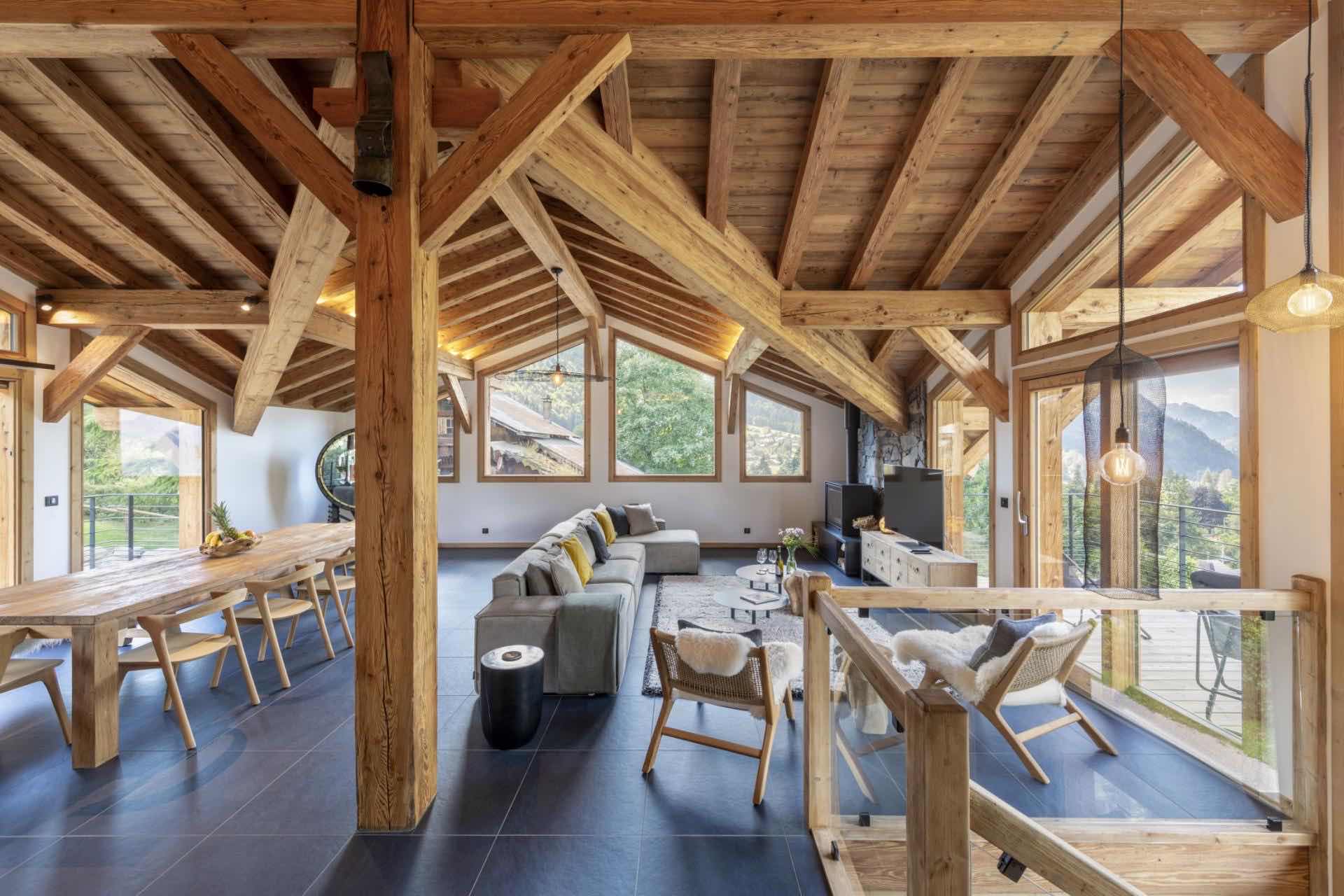 Spanning three floors and 240m², the chalet’s top level is dedicated to a stunning open-plan living space beneath an impressive vaulted wooden ceiling. Here, a generous lounge invites you to sink into plush modern sofas beside a cosy log-burner fireplace, framed by a striking stone accent wall that blends alpine charm with contemporary style. The dining table comfortably seats all 10 guests, with a mix of hand-crafted chairs and a bench draped in soft, fluffy throws. At the far end, a sleek, fully equipped kitchen features an elegant island breakfast bar, ideal for casual dining or après-ski nibbles. Floor-to-ceiling picture windows flood the space with natural light and frame breathtaking panoramas, best enjoyed from the balcony overlooking the valley.