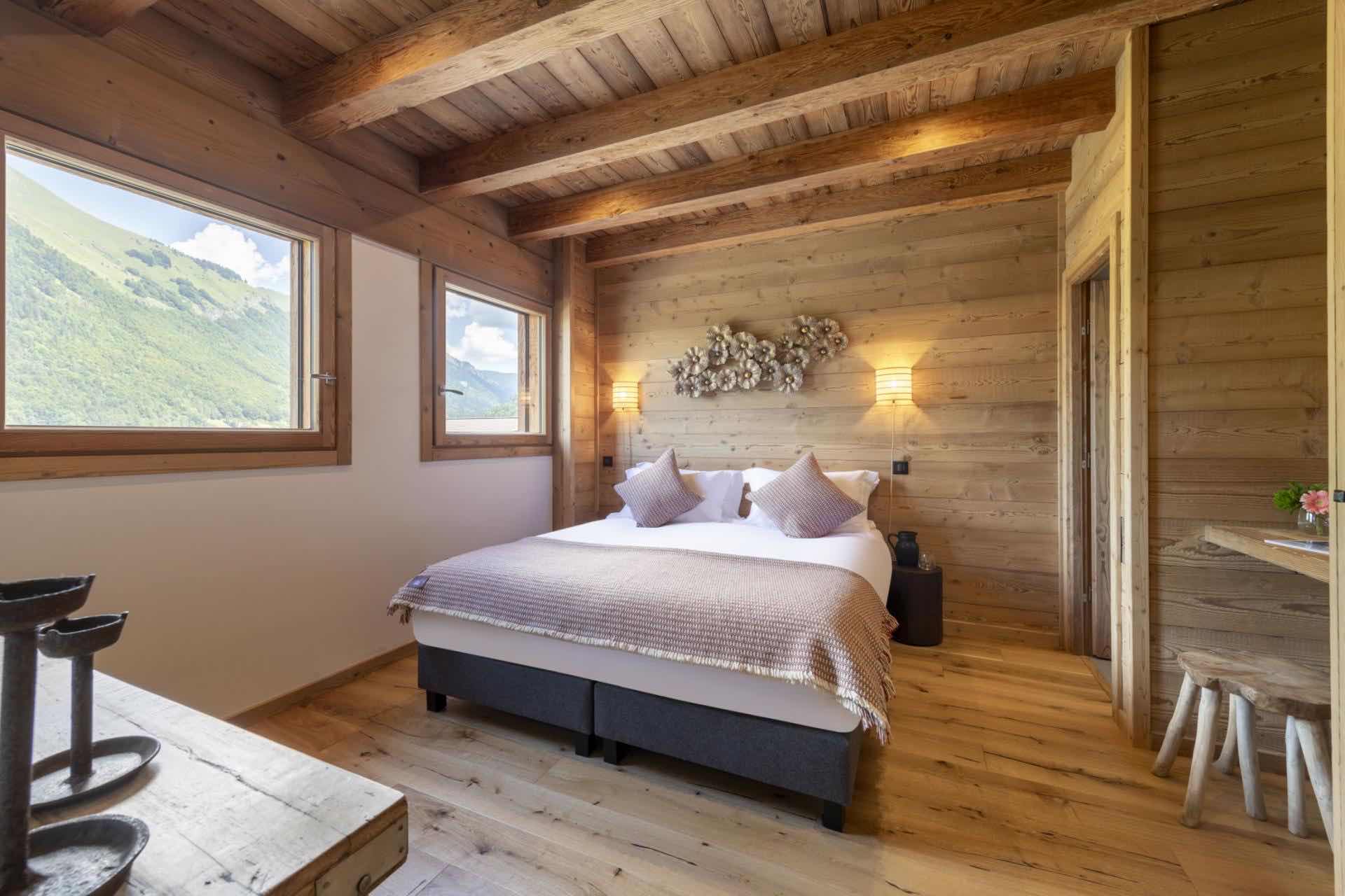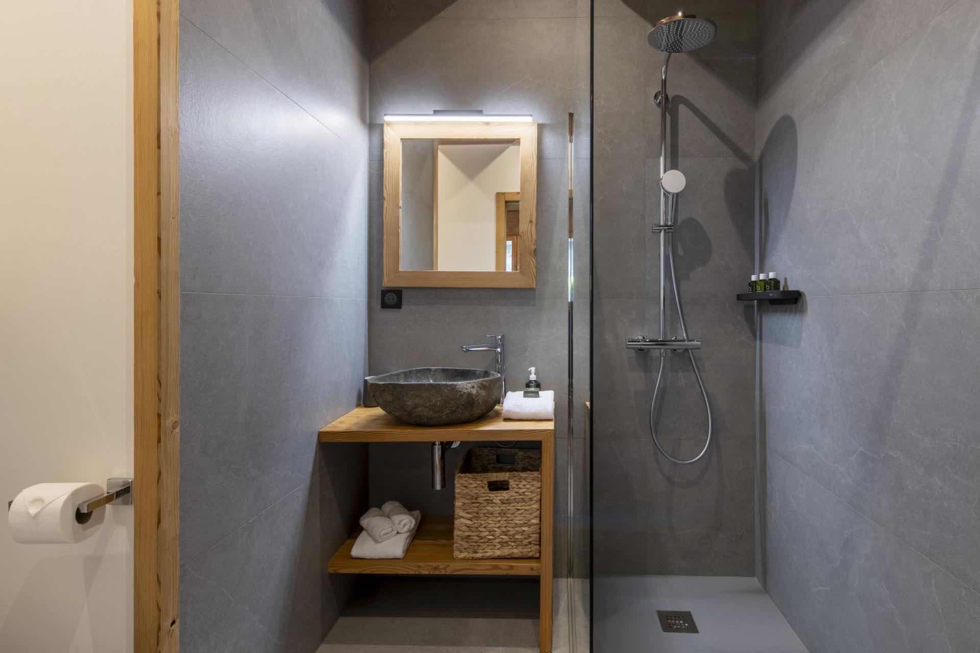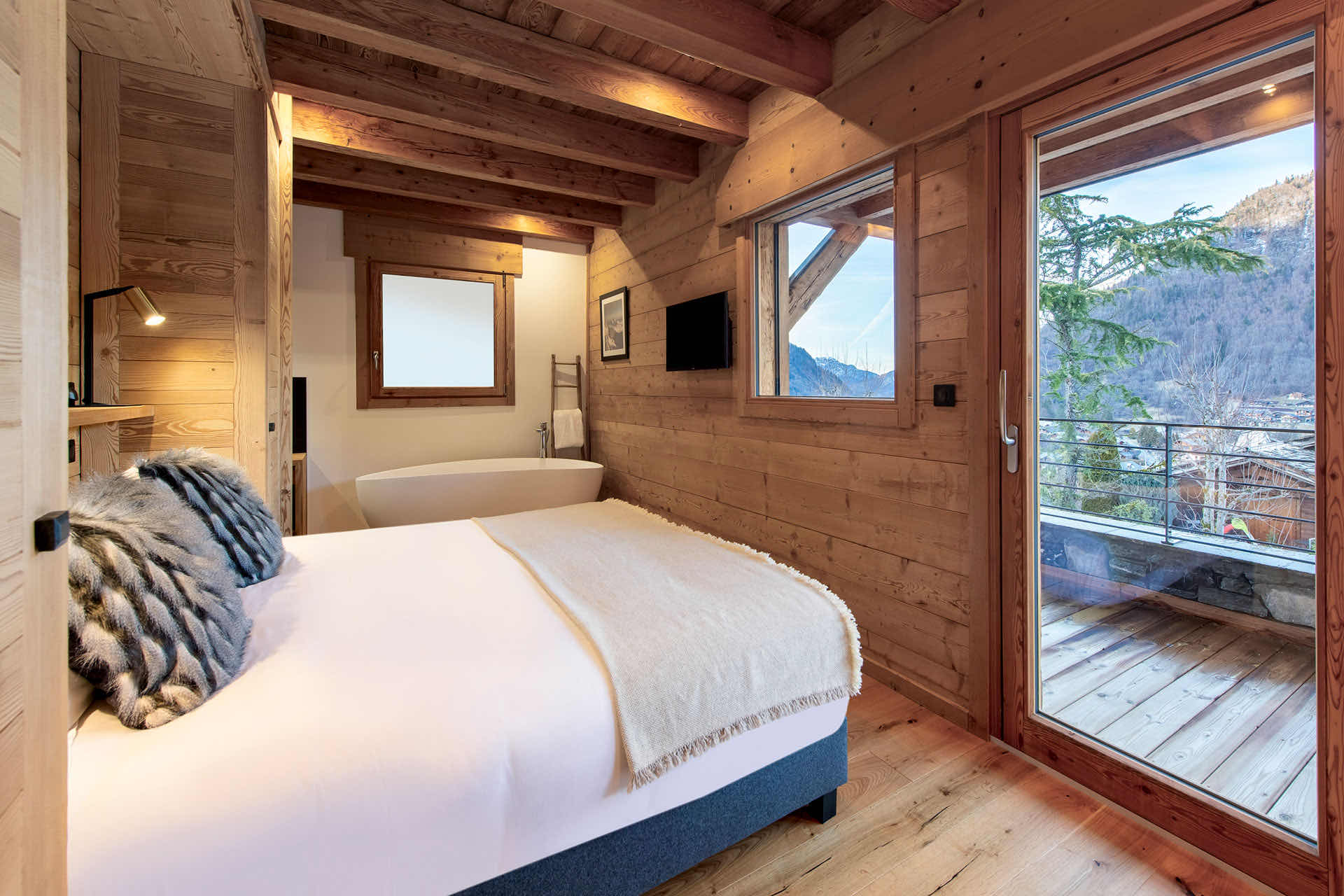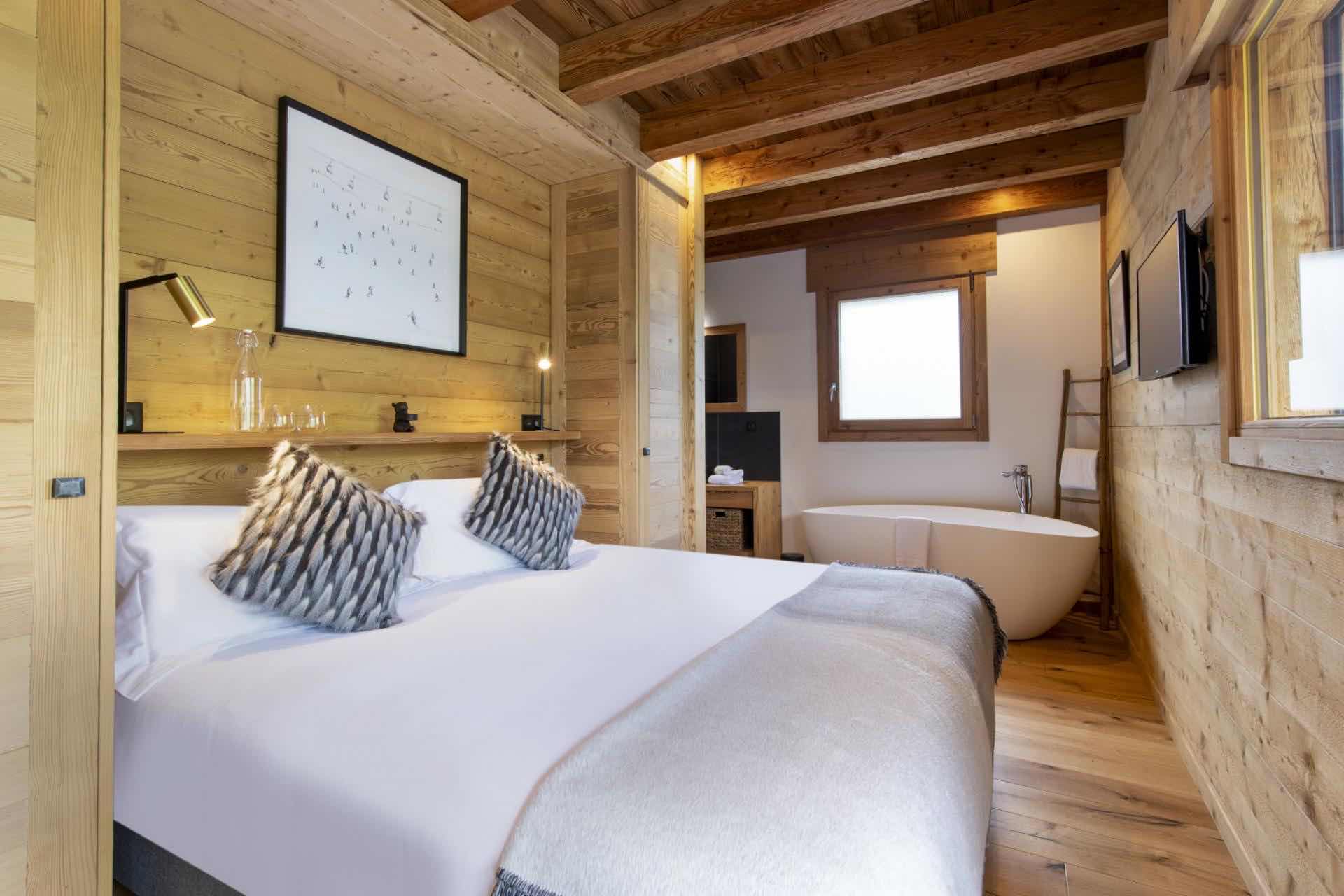 Each of the five double bedrooms is an inviting sanctuary, wrapped in warm alpine wood with soft beds, gentle lighting, and stylish stone-grey en-suite bathrooms. The master suite adds a freestanding bathtub and a private balcony for an extra touch of luxury.
