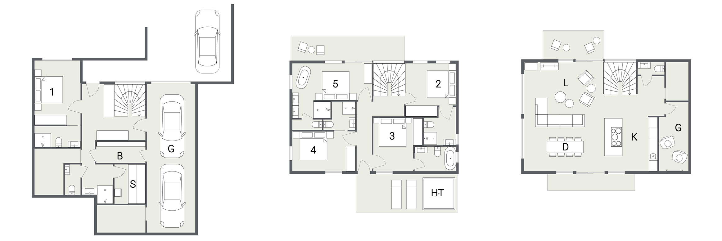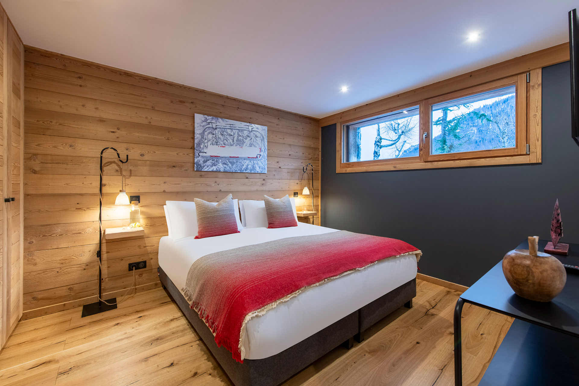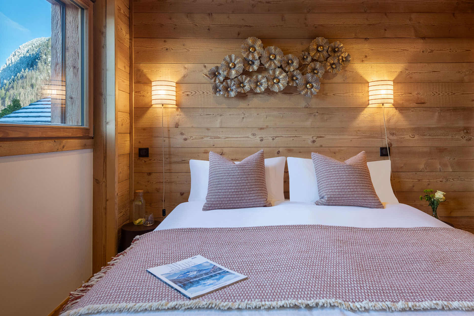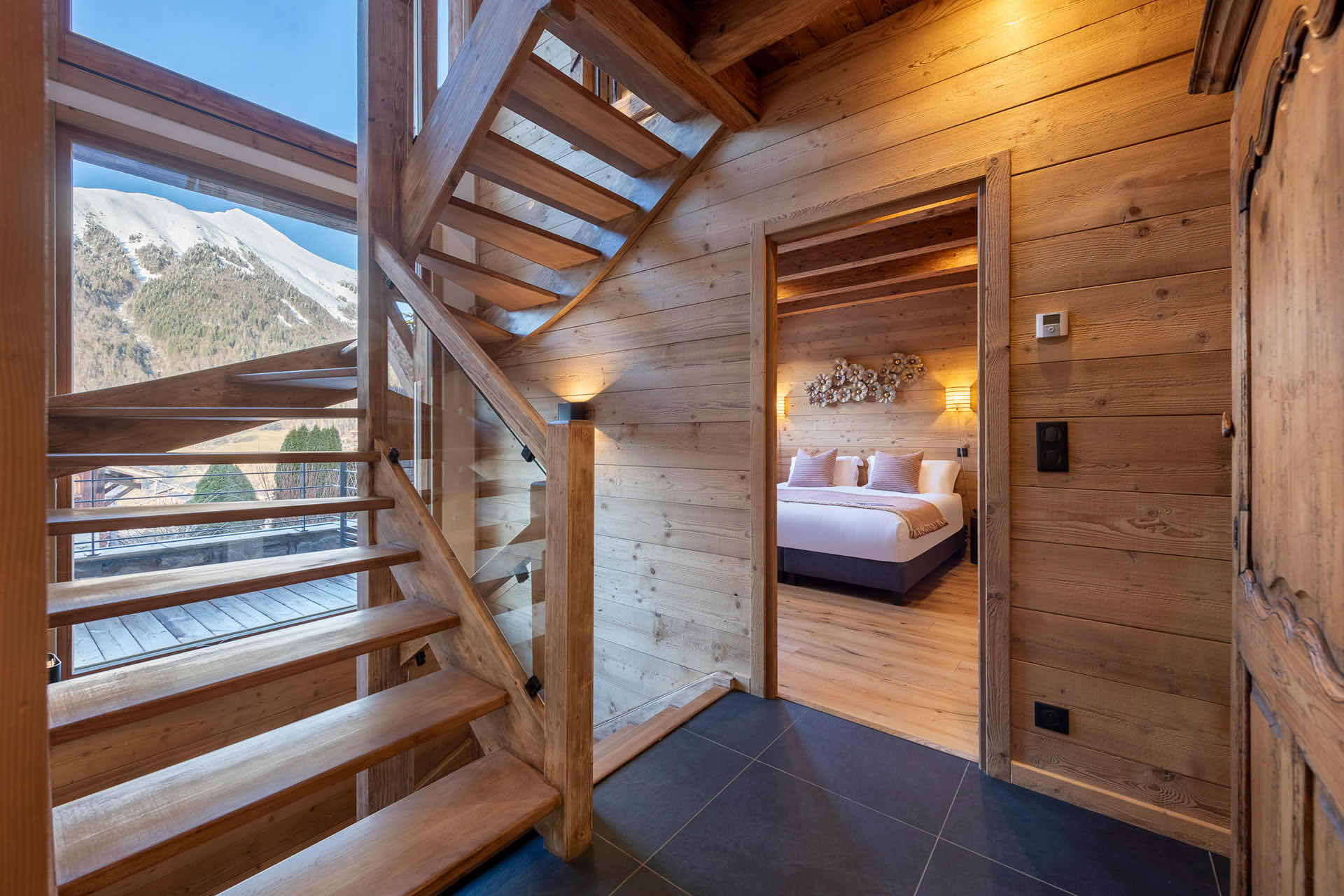 Each of the five double bedrooms is an inviting sanctuary, wrapped in warm alpine wood with soft beds, gentle lighting, and stylish stone-grey en-suite bathrooms. The master suite adds a freestanding bathtub and a private balcony for an extra touch of luxury.