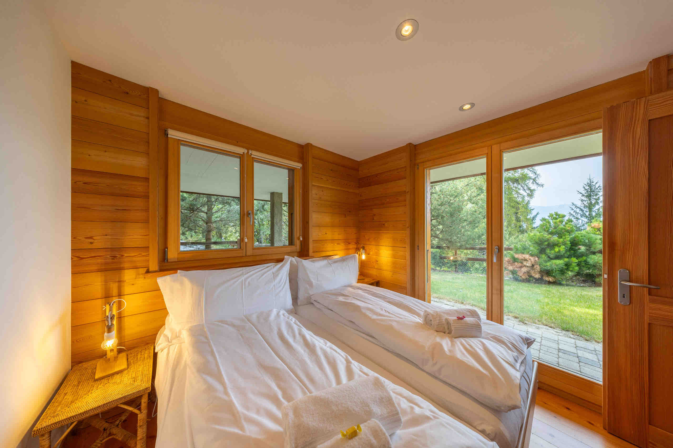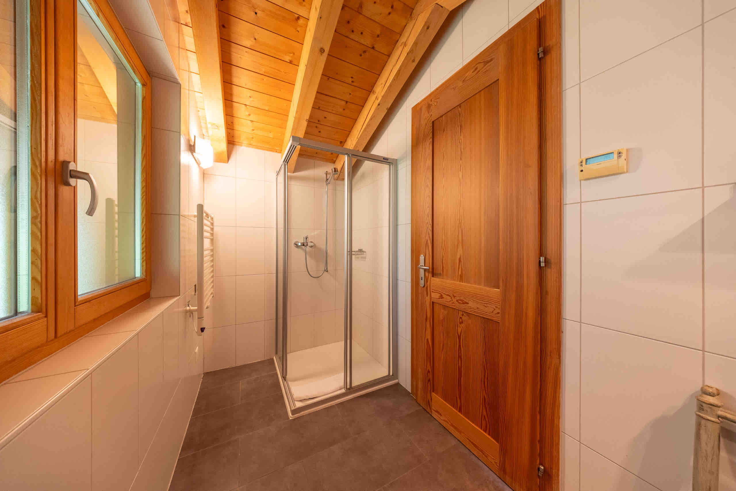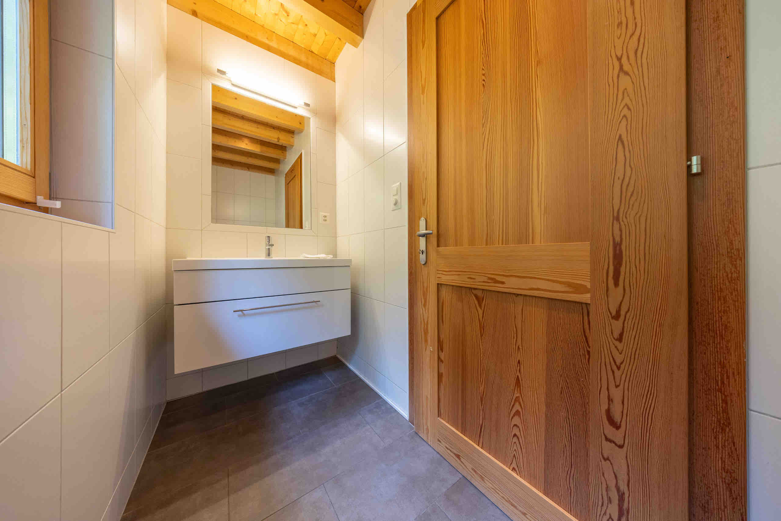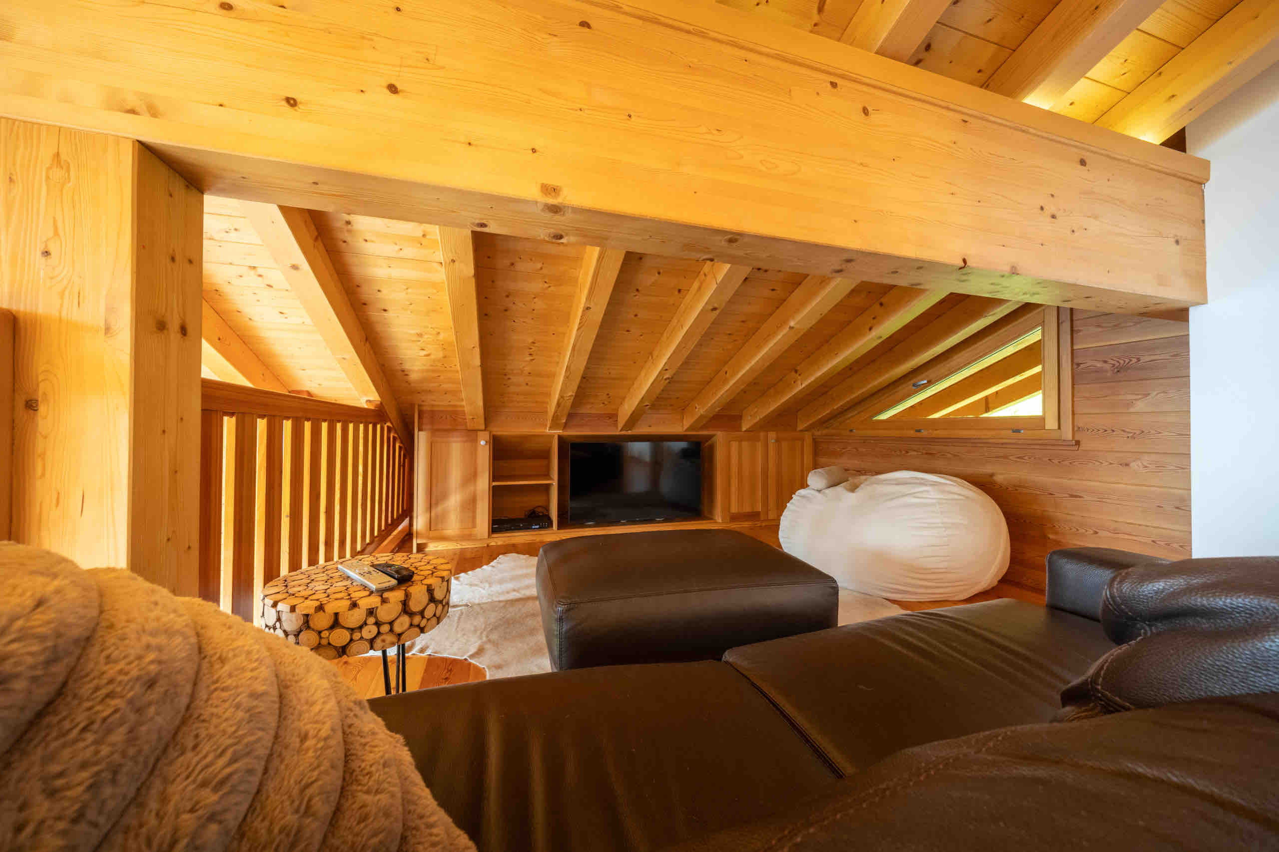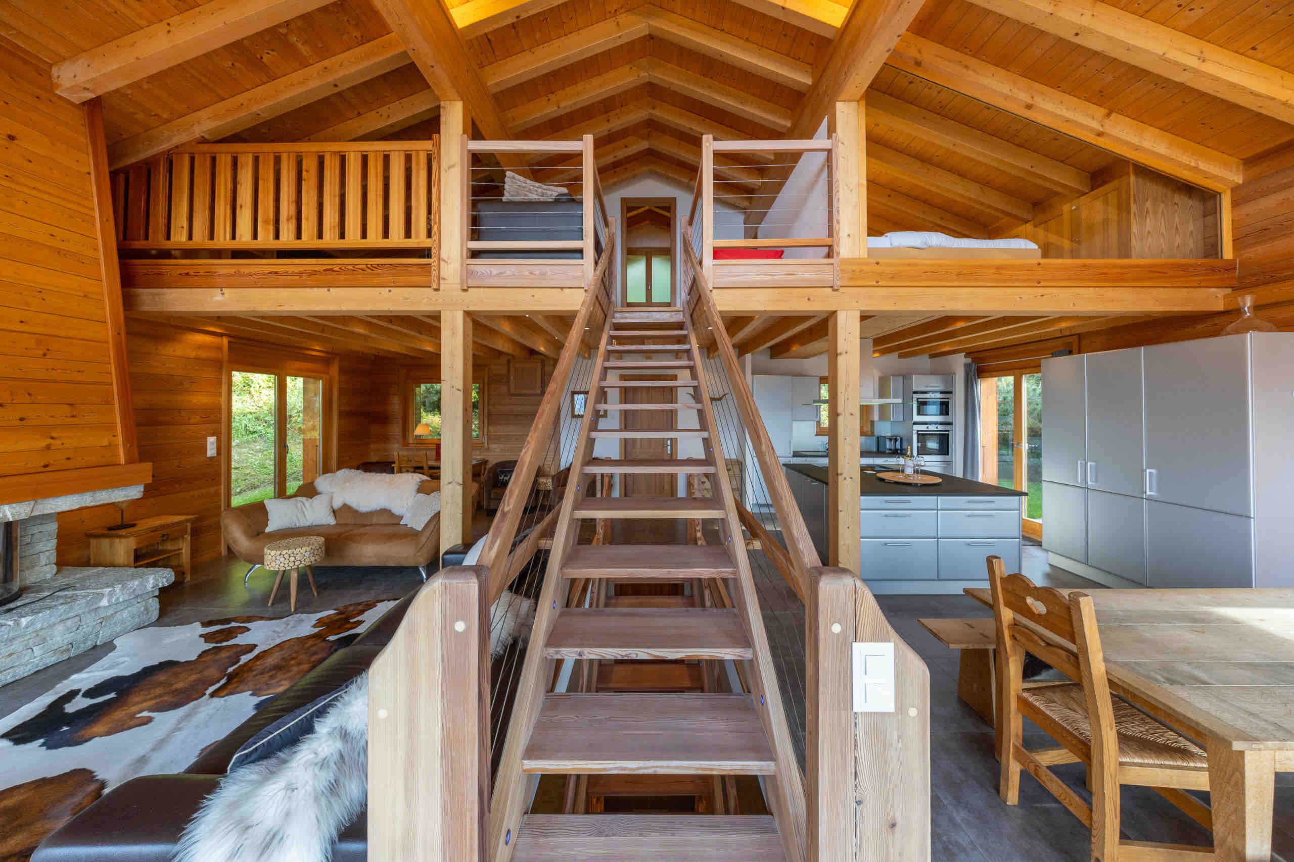 The heart of the chalet lies on the second floor, where a modern open kitchen is fully equipped with everything you need, including fondue and raclette sets for convivial evenings. The adjoining dining area offers breathtaking panoramic views of the mountains, while the cosy living room invites you to gather around the fireplace. A guest toilet and a spacious wraparound terrace complete this level, providing the perfect setting for outdoor meals or moments of relaxation.