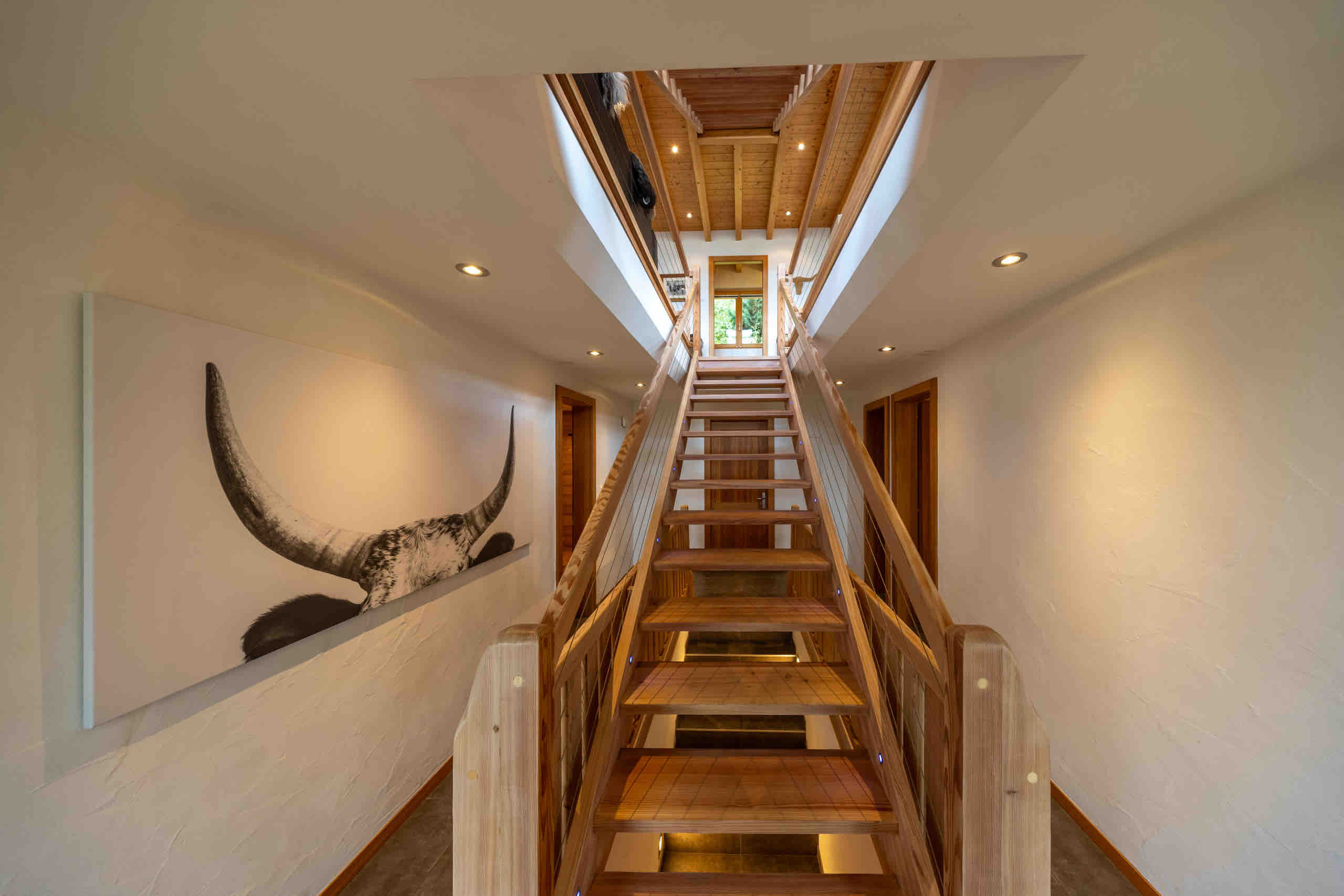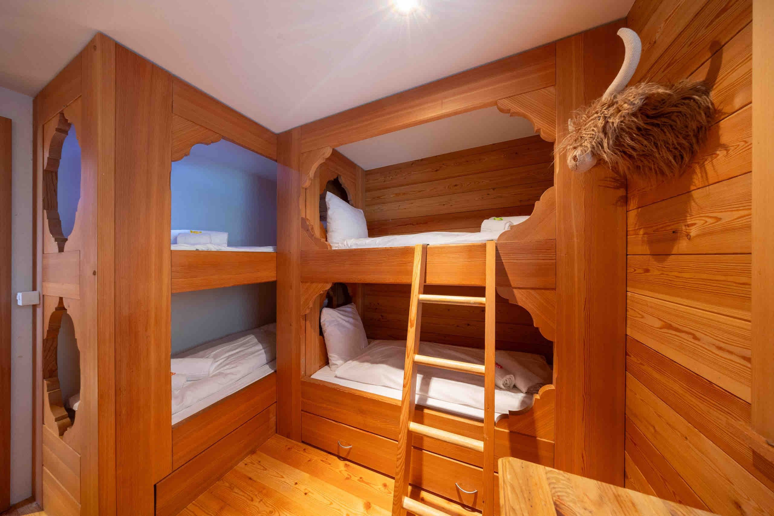 On the garage level, you’ll find an indoor garage, a ski room with a boot dryer, a shower room with a sauna, and a utility space with laundry facilities. The first floor includes three double bedrooms, one of which has an ensuite bathroom, as well as a bunk room for four and an additional bathroom.