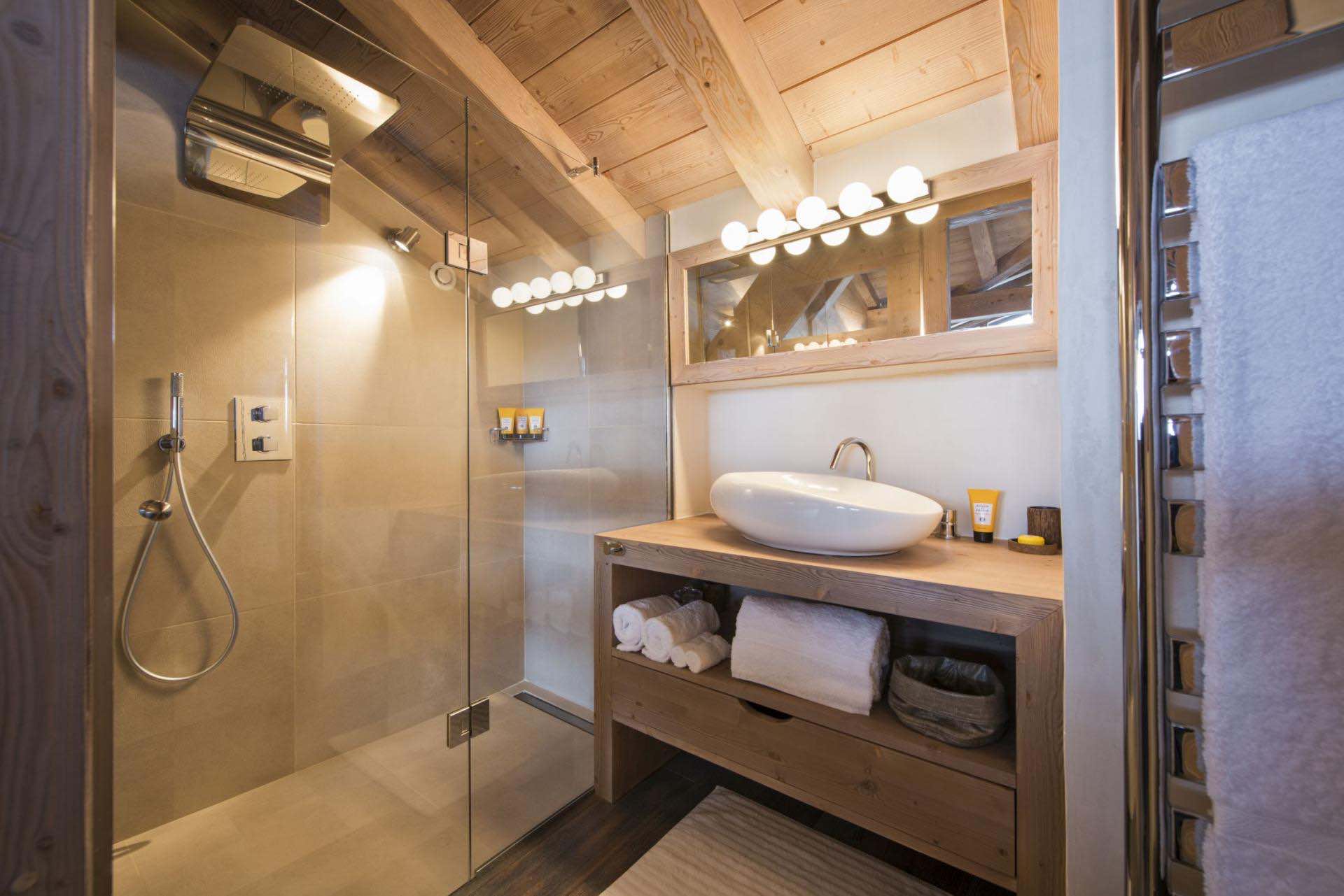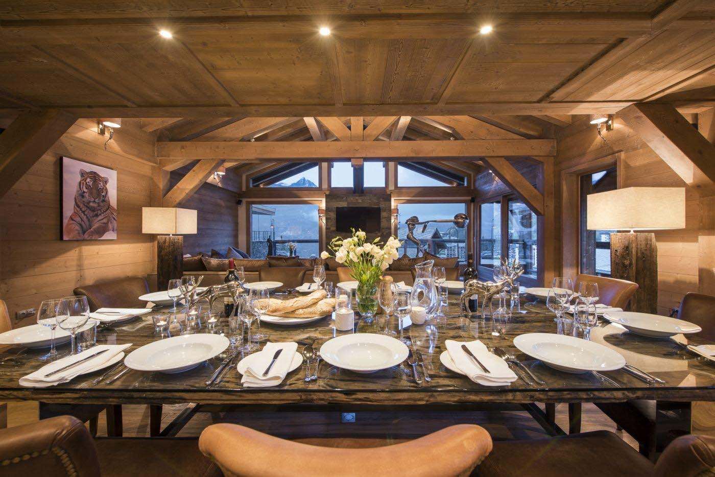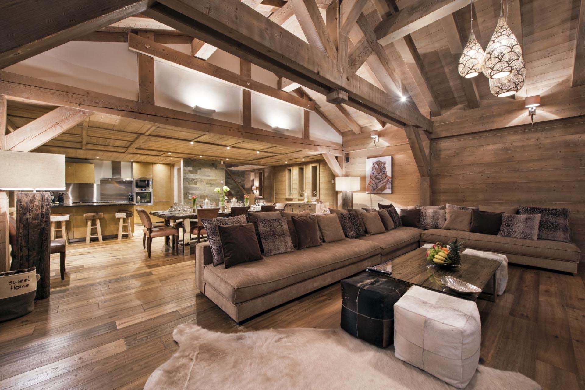 Inside, the chalet features two open-plan living and dining areas that can function independently or be used together for the whole group, making it ideal for multi-family holidays, corporate trips, or celebrations. Large windows and balconies maximise natural light and frame views of the surrounding mountains, while warm textures and modern furnishings create an elegant yet relaxed setting.
