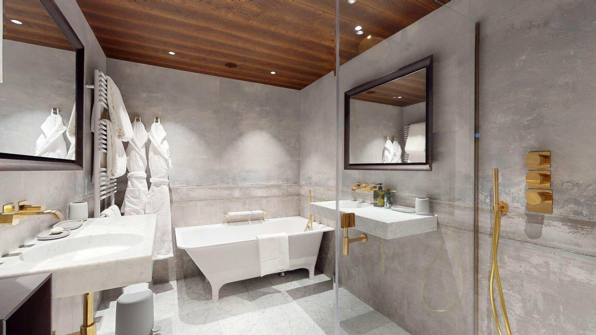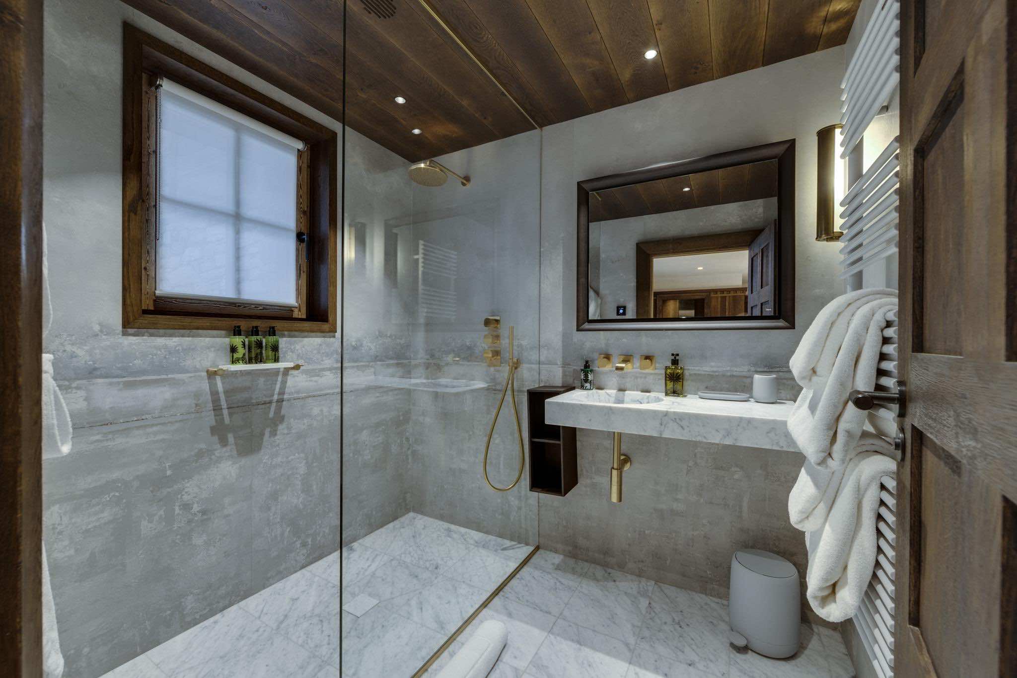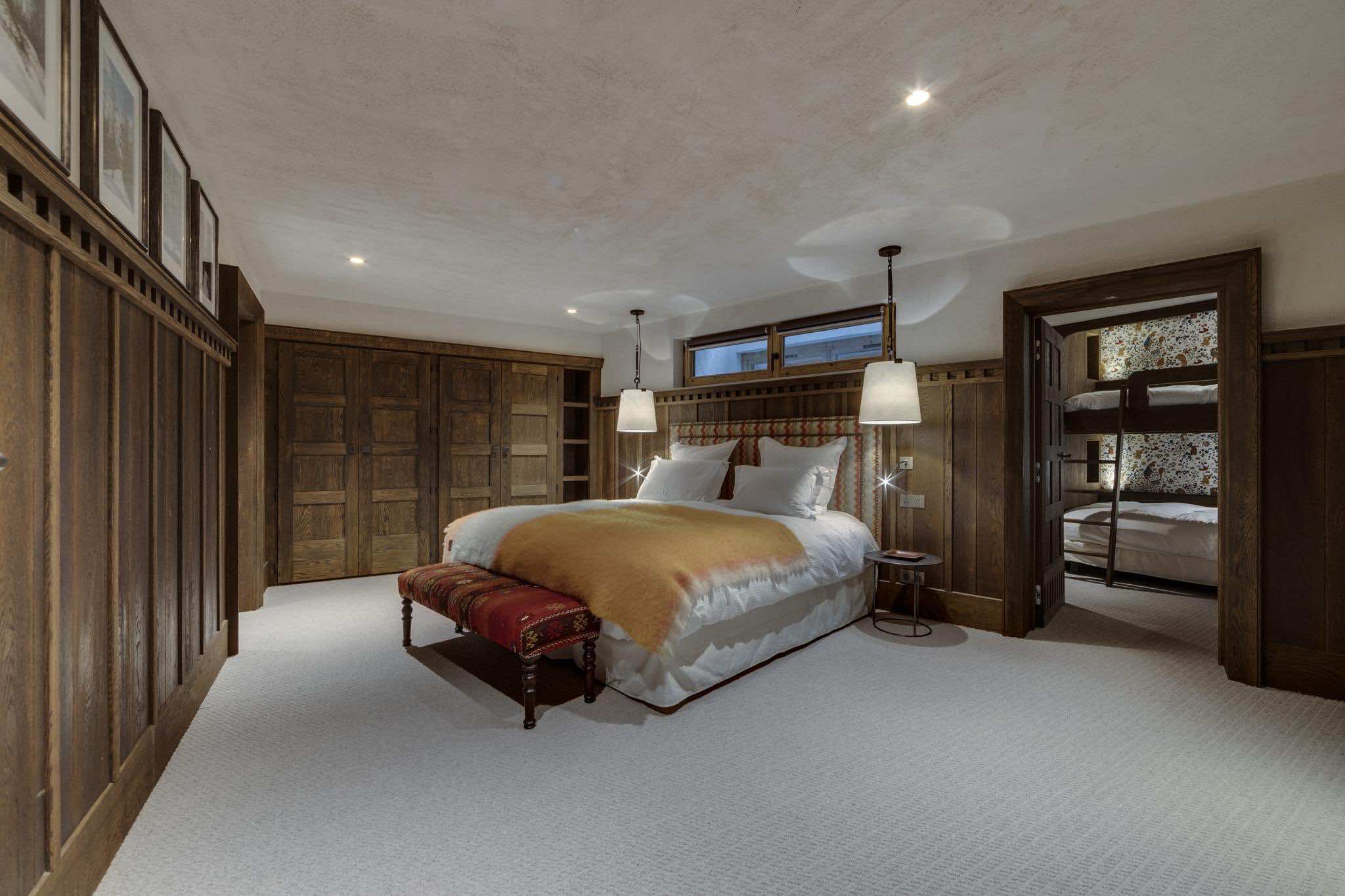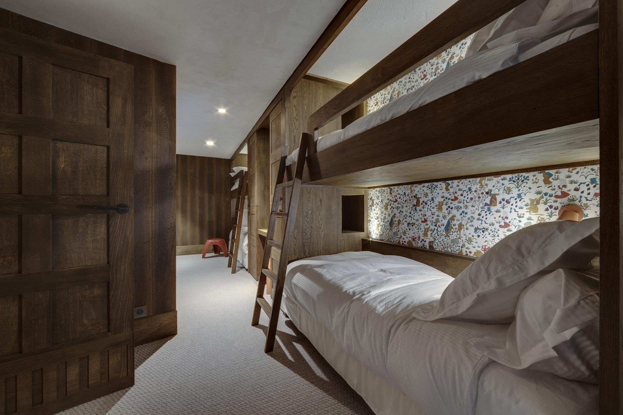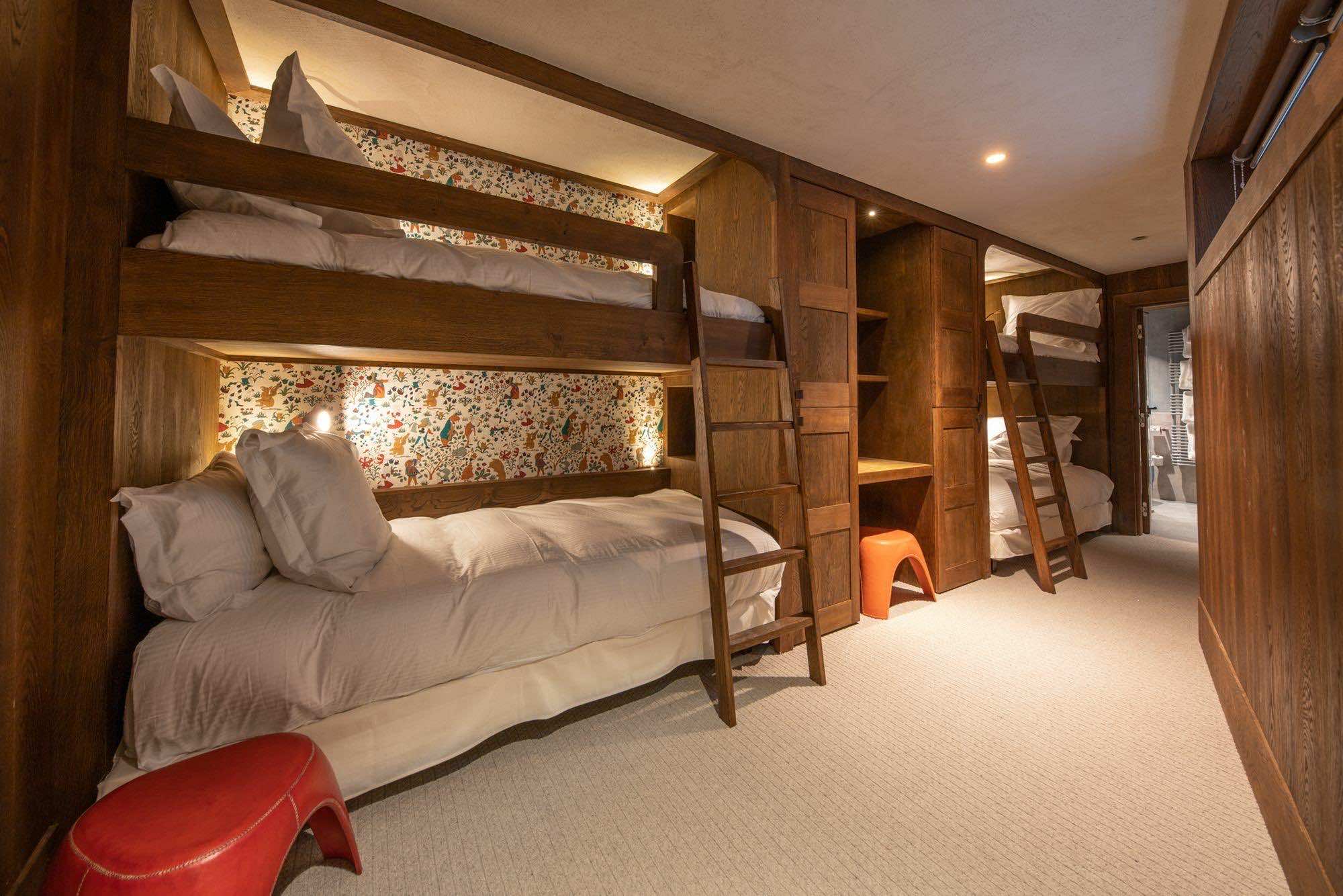 The chalet features six generously sized bedrooms, all with luxurious en-suite bathrooms. A standout family suite includes a flexible double bed and an adjoining children’s room with two bunk beds, sleeping up to four children—perfect for families. Each bedroom showcases a rustic yet refined aesthetic, with some offering dressing rooms and terrace access for added comfort and privacy.