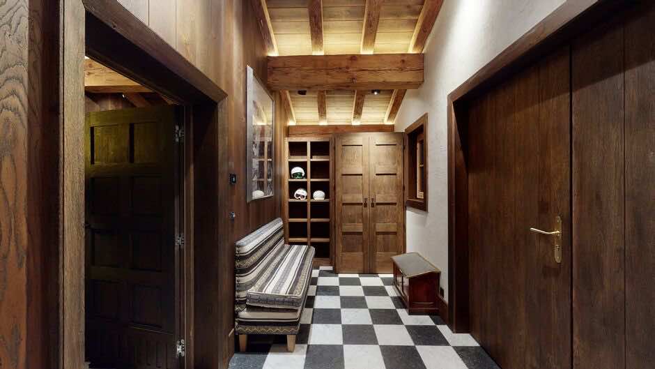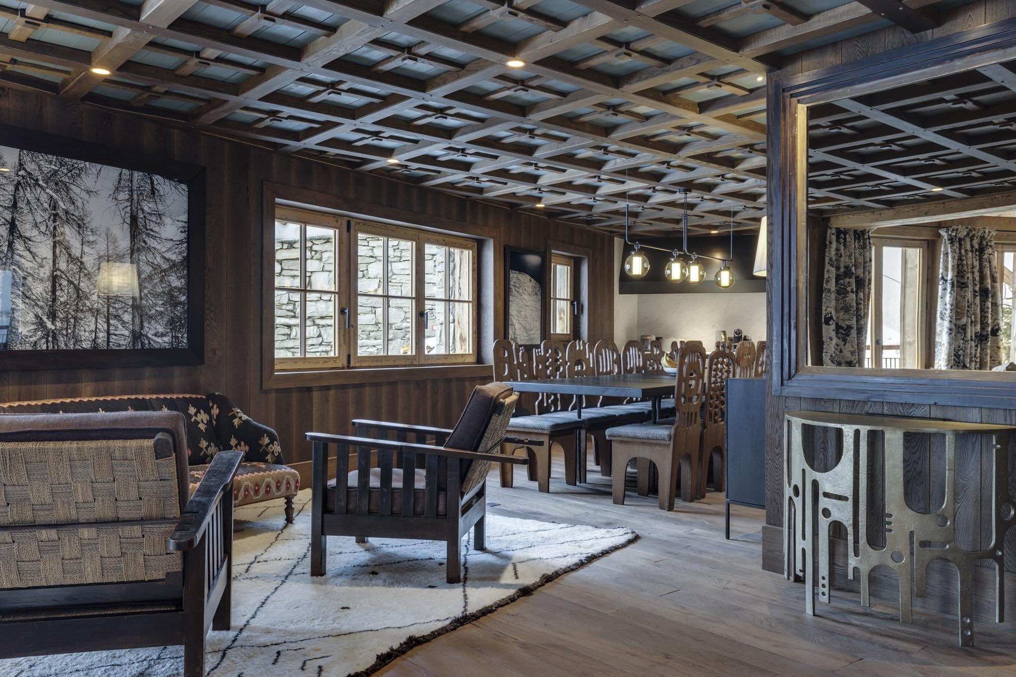 Inside, the chalet’s open-plan living area is a masterpiece of modern alpine elegance. Rich, dark textures and soaring vaulted ceilings blend seamlessly with traditional wooden accents, creating a warm yet sophisticated atmosphere. Gather around the large fireplace for lively evenings with family and friends, or enjoy a more intimate chat in the cozy lounge set behind the main seating area. Nearby, a spacious dining table, surrounded by intricately carved wooden chairs, invites the whole group to share homemade meals. A fully equipped kitchen tucked at the rear gives your private chef the perfect space to prepare gourmet dishes.