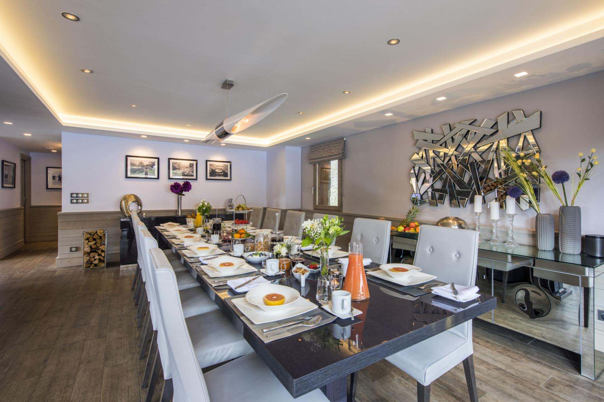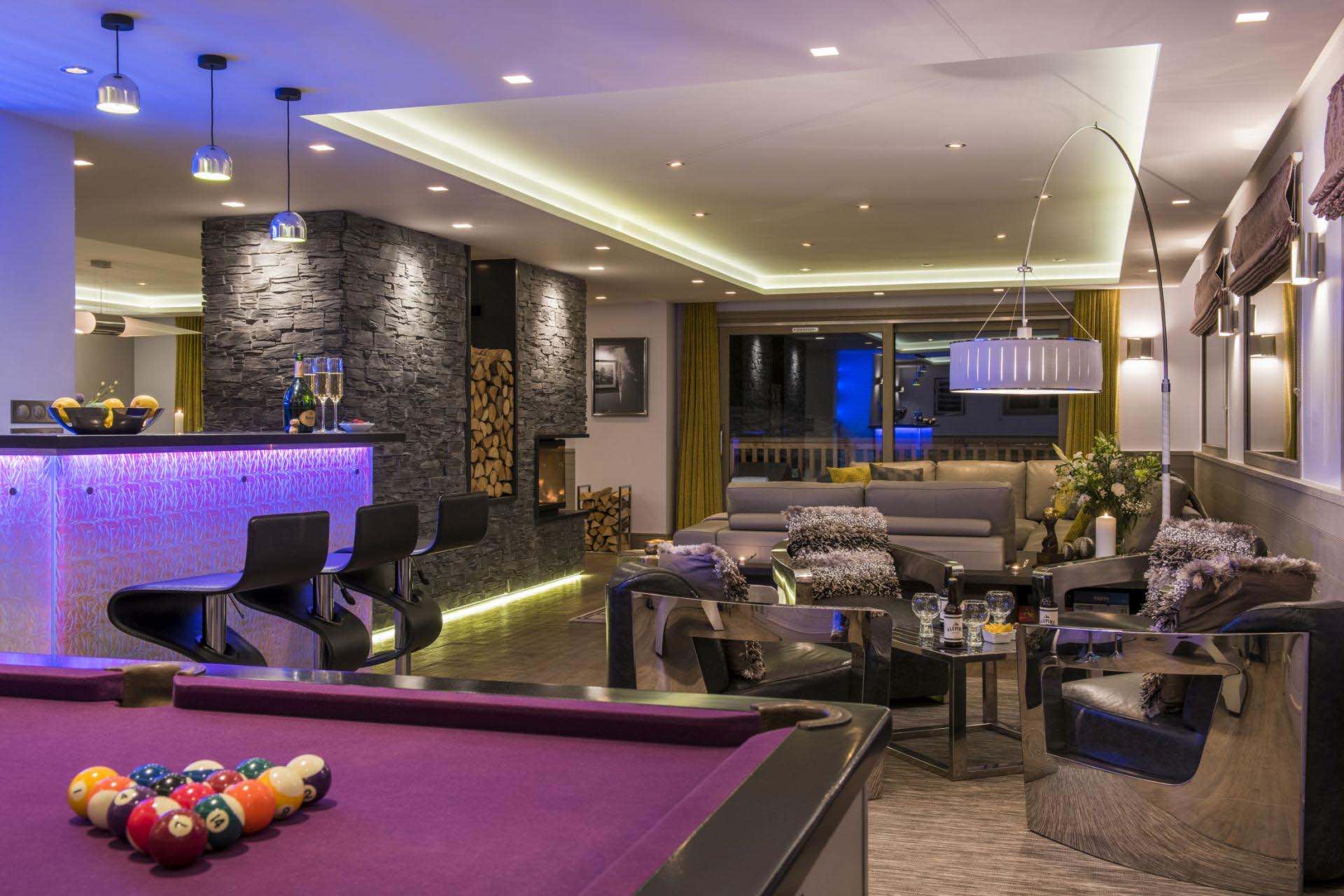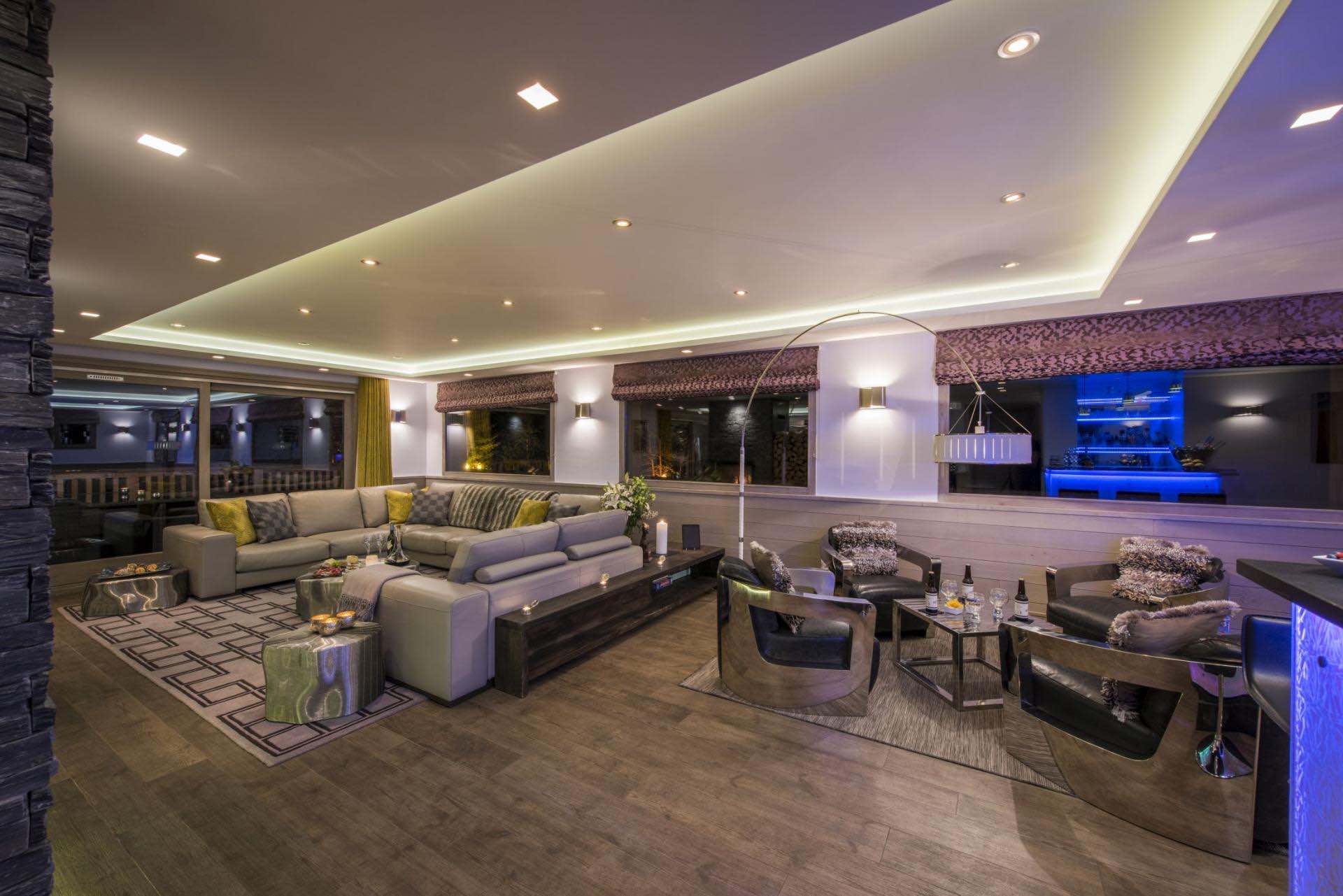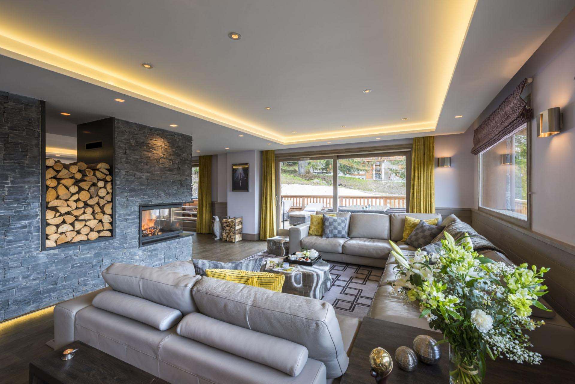 The main living area is designed for both relaxation and socialising, featuring expansive windows that flood the space with natural light and frame the surrounding peaks. A central fireplace adds warmth and character, while the adjoining dining space and bar create a seamless setting for memorable evenings together. Whether enjoying a quiet drink or a lively gathering, the chalet provides a perfect balance of comfort and sophistication.