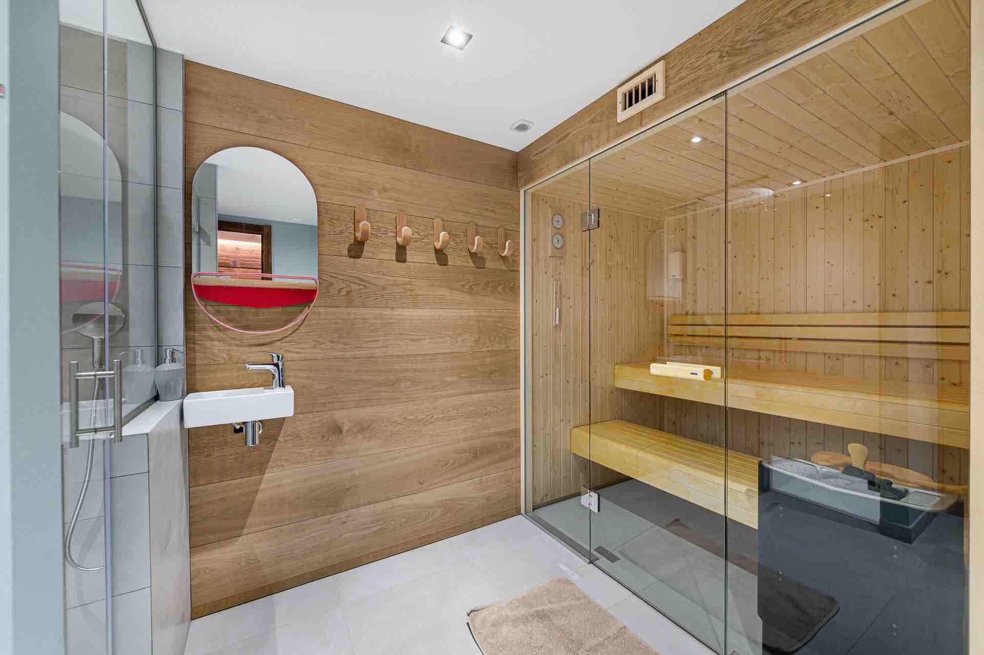 Chalet Ruisseau Renarde comfortably accommodates up to 11 guests, featuring three en suite double bedrooms and a spacious top-floor dormitory—perfect for the chalet’s youngest guests and their late-night pillow fights. After an exhilarating day on the slopes, unwind in the private wellness area complete with a sauna, shower, and massage table, or indulge in the bath’s balneotherapy and chromotherapy functions. The beautiful southwest-facing terrace on the first level is ideal for sunlit lunches before heading back out to explore the world’s largest ski area.