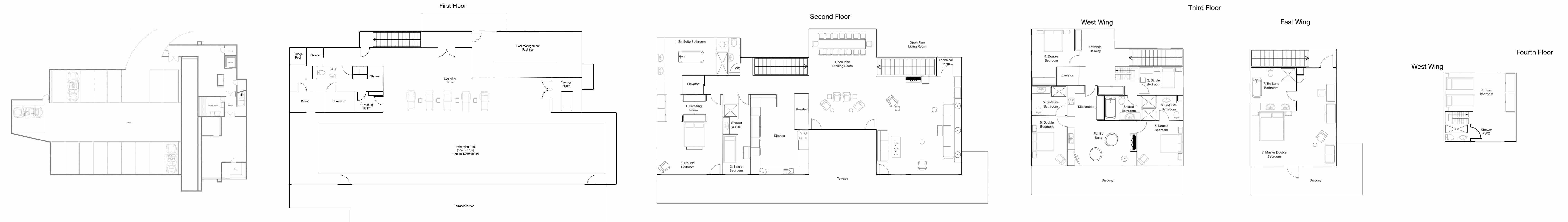 Each of the seven bedrooms has been designed with luxury and privacy in mind. The East Wing, accessed via a private staircase, houses the master suite — a peaceful haven with a private balcony, comfortable seating area, and elegant en-suite bathroom. On the same floor as the main living space, guests will find a spacious double bedroom with en-suite facilities and an additional single room, ideal for staff or a nanny. The top floor of the West Wing features a double and a twin bedroom, each with en-suite shower rooms, and a shared lounge with a kitchenette, fireplace, and TV, making it especially well-suited for families. This floor also includes another double and a single bedroom that share a family-style shower room. Tucked away on the attic floor is a cozy twin/double bedroom with its own en-suite wet room.