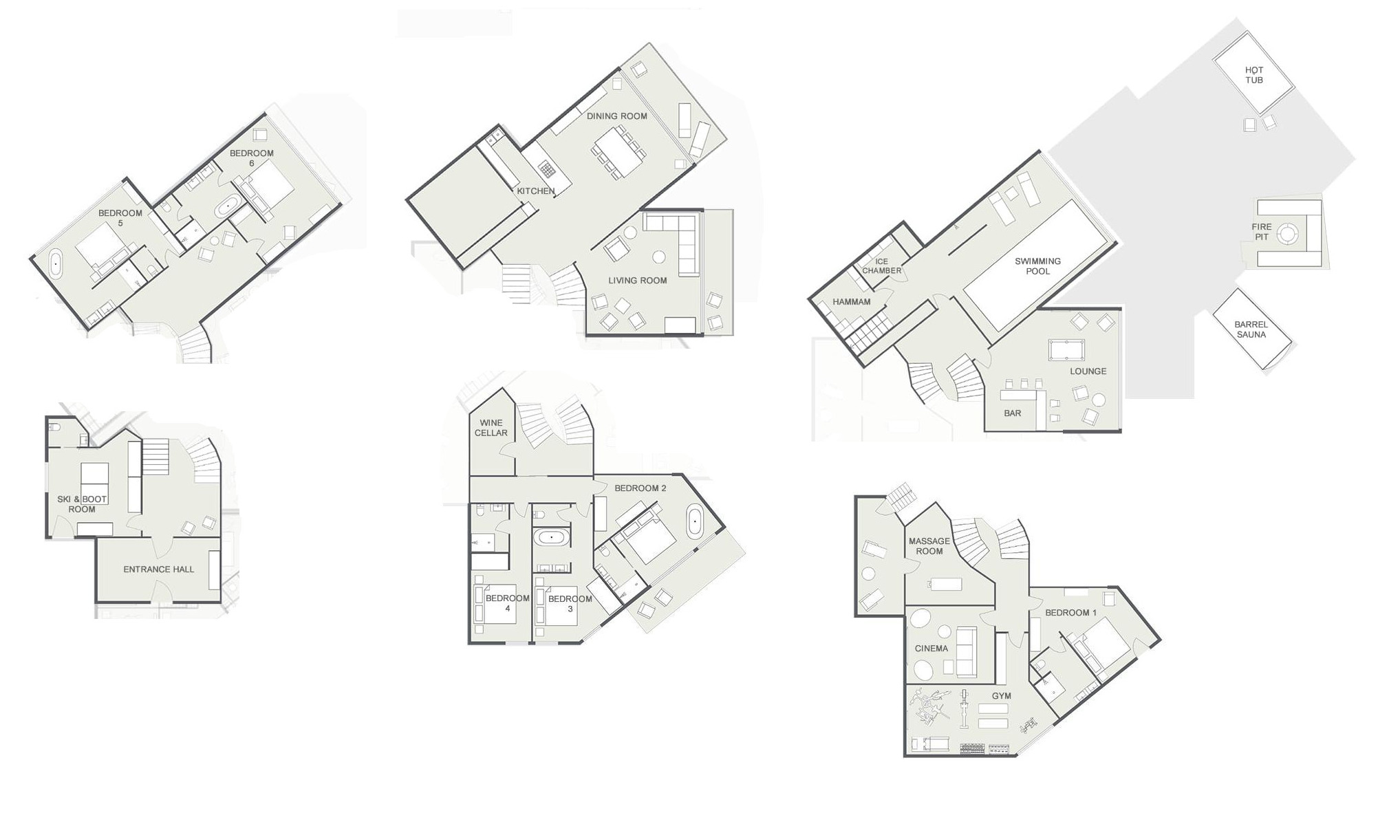 The six bedrooms are spread across three levels, providing a sense of space and privacy for every guest. On the first floor, two luxurious en-suite bedrooms include one with a freestanding bath. A third master suite, also with a freestanding bath, is located on the lower floor (-1), along with two additional en-suite rooms. The final bedroom sits on the lower level (-4), adjacent to the cinema room, and opens directly onto the terrace. All rooms can be configured with either super-king or twin beds for total flexibility.