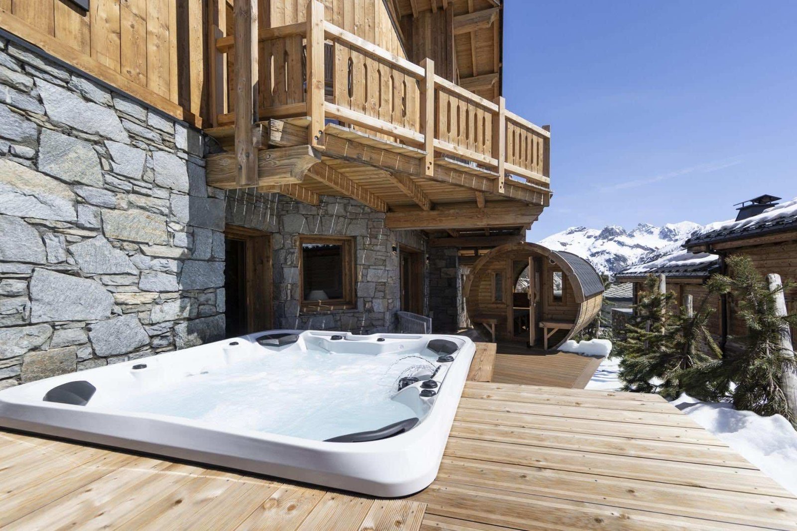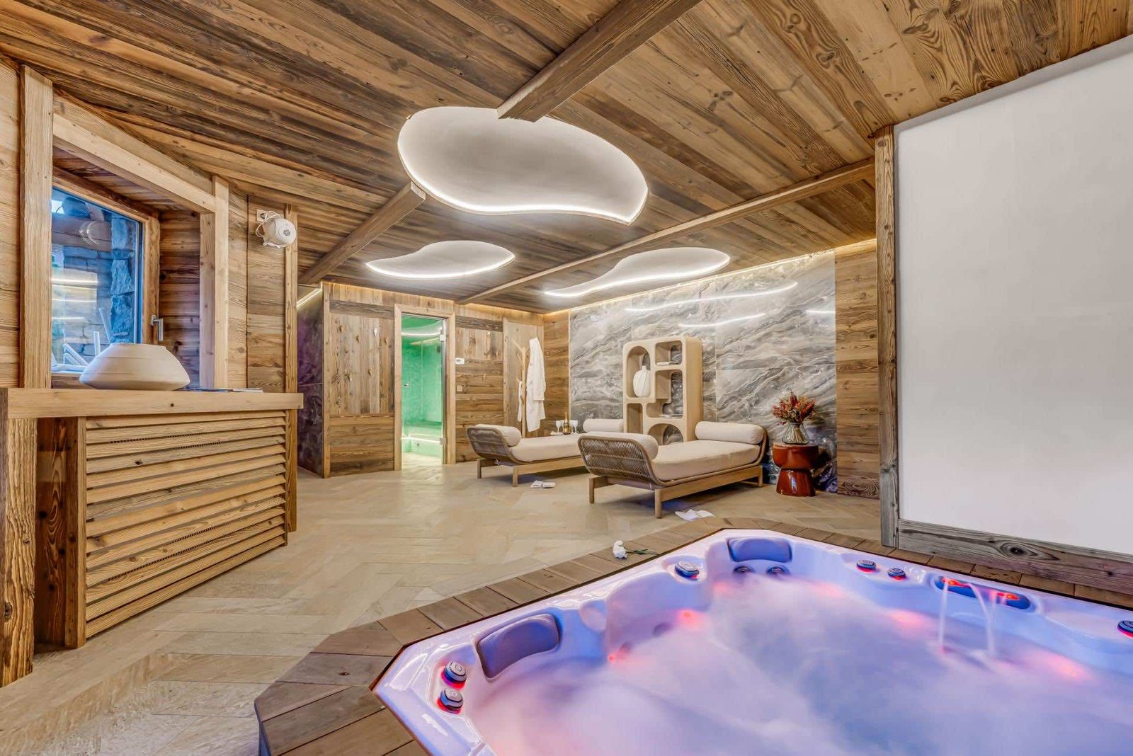 The chalet also features an impressive private wellness area designed to help guests unwind and recharge. After skiing, guests can relax in the outdoor hot tub while enjoying views of the mountains, or retreat indoors to the jacuzzi, hammam and barrel sauna. A dedicated relaxation area provides a peaceful environment to fully switch off and recover after an active day in the mountains.